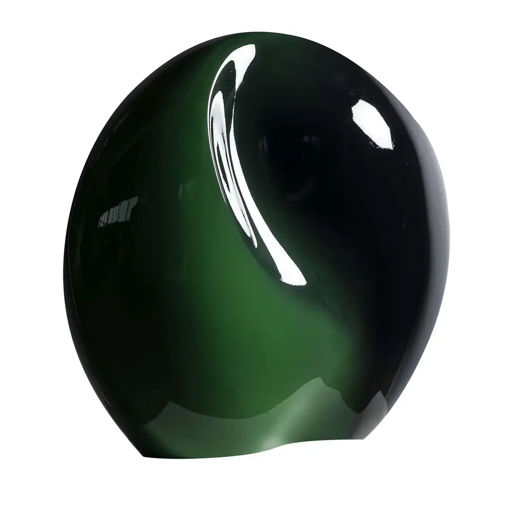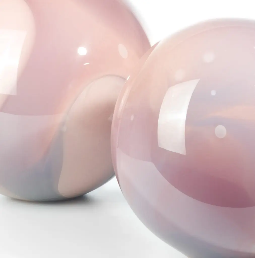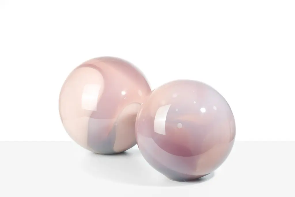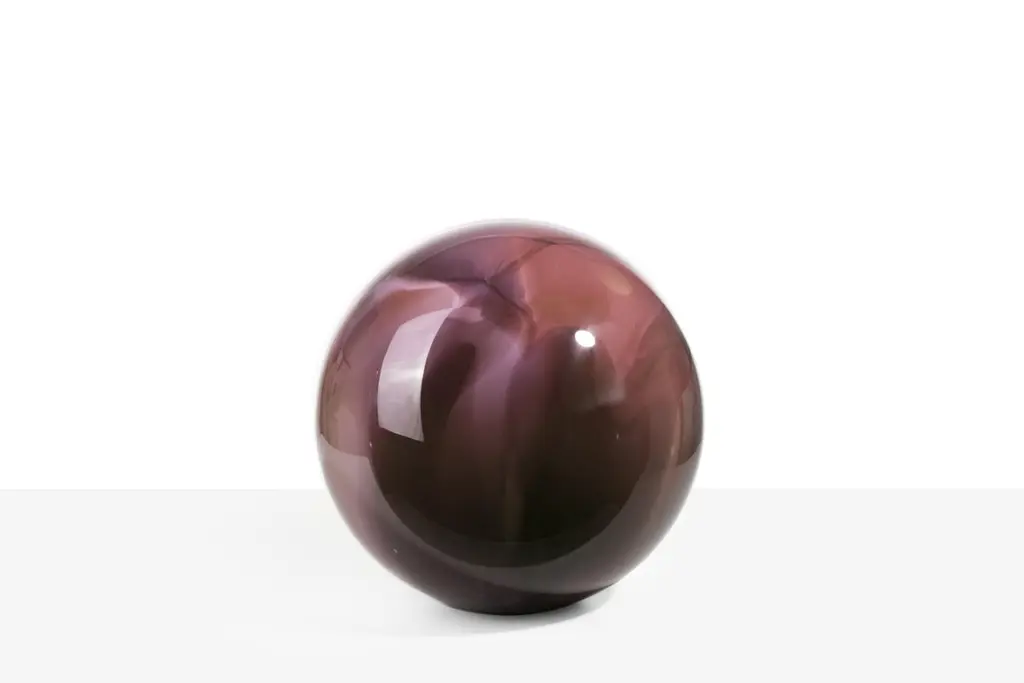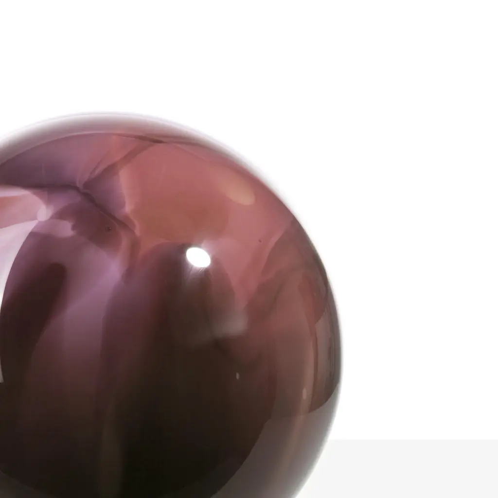 Red glass planet sculpture by Dechem Studio.Dimensions: D 32 cm.Materials: glass.Available in autumn red and powder pink.The Planets are voluminous sculptures with a tonality inspired by the universe. It takes a close-up look to appreciate the life inside these beautiful yet seemingly simple objects and to discover a boundless universe filled with mystery and ambiguity. In a special manufacturing process, paint was mixed under high heat like “the product of an elemental process not unlike the birth of a star.”We are DECHEM.We are Michaela and Jakub, designers and storytellers in Bohemian glass. Our work is based on contemporary design combined with a mastery of production and a healthy respect for old Central European craft and traditions.We design, produce and sell our collections of lights and decorative glass products. We produce unique light fixtures made from a combination of mouth-blown glass and handcrafted brass. Our glamorous chandeliers light up any space with a playful yet elegant appearance.A significant component of our work is blowing glass into a colour gradient. The wide range of fresh gradient colours is a distinctive feature of the Bandaska vase from our collection. It draws inspiration from traditional milk containers, well-known in Czech village households, and their elegant lines are now coming into modern homes in the form of our glass vases and lights.In addition to our normal production, we love to devise bespoke luminous objects for interiors. They arise from experimenting with unconventional materials and unusual combinations.Along with our own work, we like to be part of special collaborations and exhibitions. We have collaborated with renowned galleries and institutions, and curated and exhibited projects in Milano, London, Frankfurt, Istanbul and several other cities around the world.All of our creations are manufactured with care in Czech workshops using unique methods, including hand-blowing, snapping, cutting, grinding, firing, engraving and glass painting.We founded DECHEM studio in Prague in 2012 as partners in both work and life after years of studying glass craft and design, and we have grown it into a renowned and award-winning design studio.