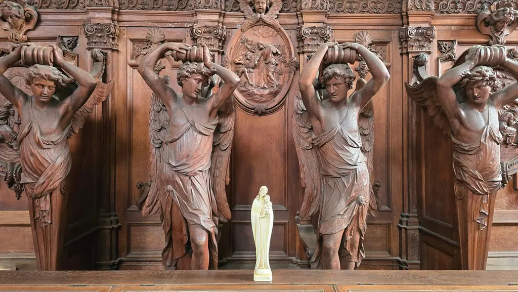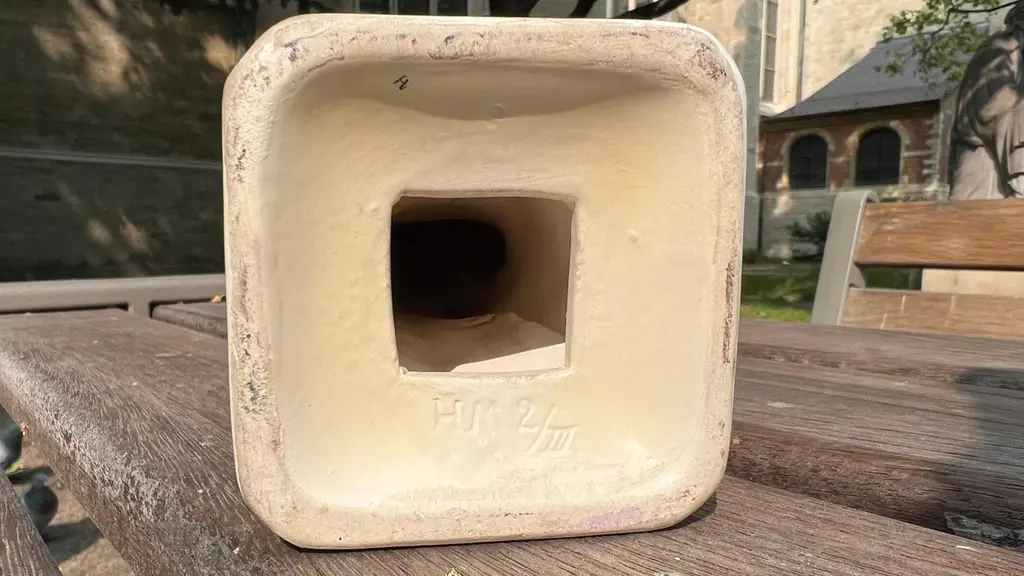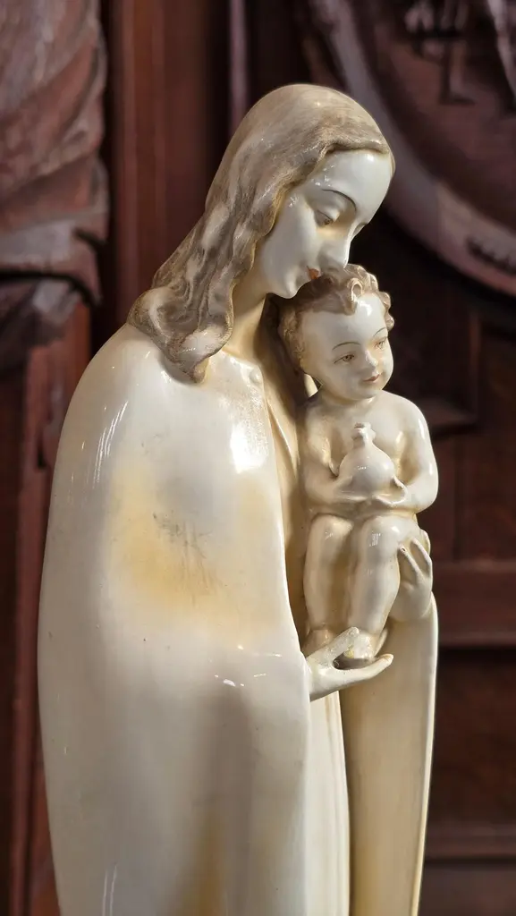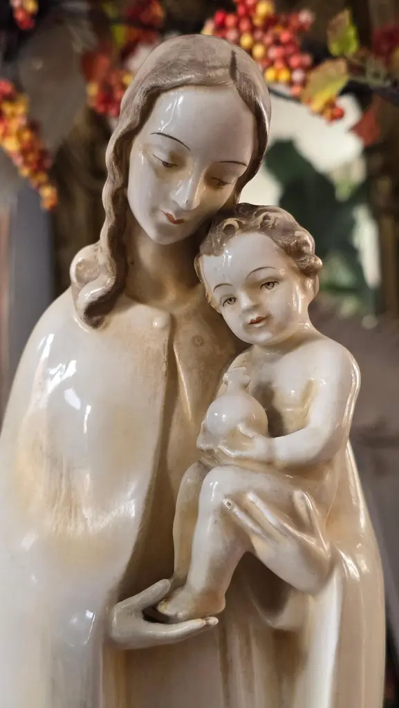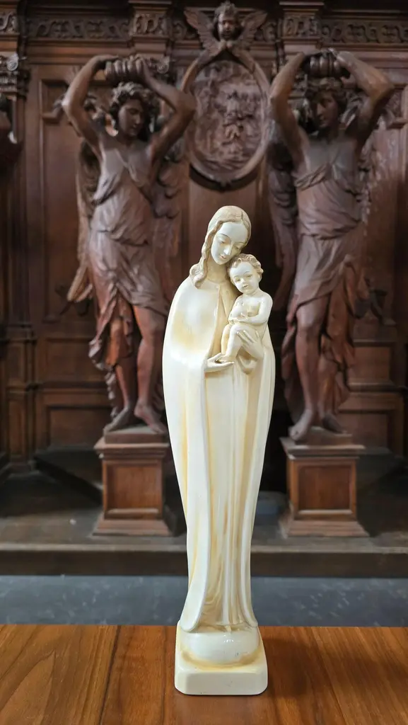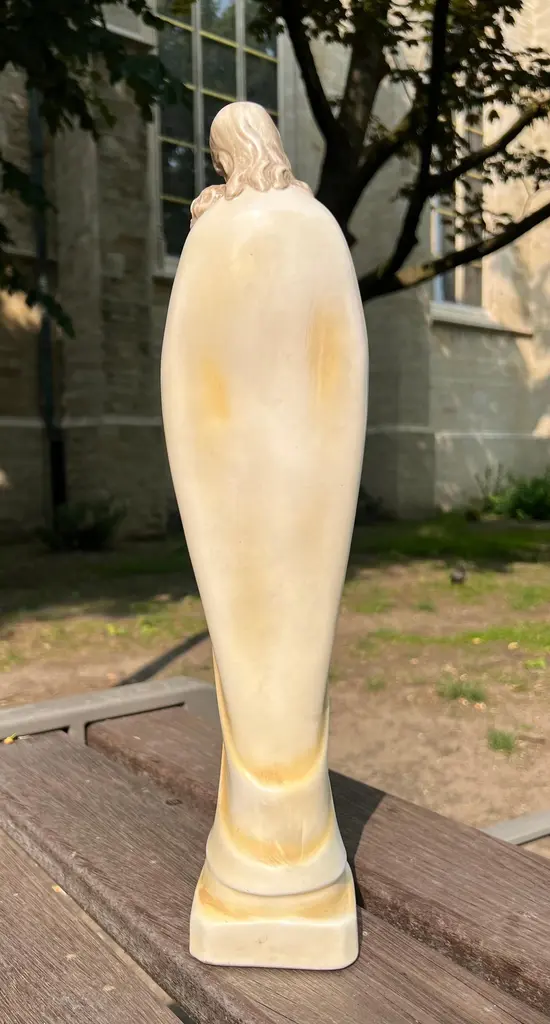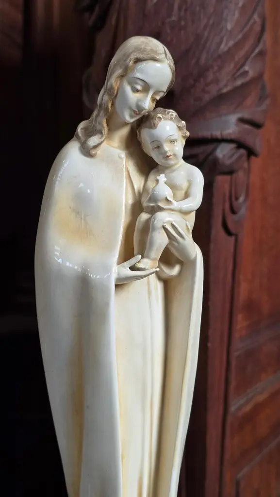 Refined Madonna and Child Statue – c. 1950 – West Germany – Signed HMAn exquisite mid-century ceramic statue depicting the Virgin Mary and the Christ Child, likely crafted in West Germany around the 1950s. The underside bears the imprint HM 2/III, possibly linked to a manufacturer such as Goebel or E&R Golden Crown, both known for producing fine religious art.The Christ Child holds a Globus Cruciger – a globe topped with a cross – symbolizing his divine dominion over the world. The facial expressions are beautifully rendered with grace and precision, conveying peace and serenity.The statue’s tall, flowing form, warm cream-toned glaze, and minimalist elegance make it a rare spiritual centerpiece, suitable for both devotional use and sophisticated interior display.Dimensions:Height: 42 cm (16.5 in)Width: 10.5 cm (4.1 in)Depth: 8 cm (3.1 in) Condition: Excellent vintage condition. No cracks or repairs. Subtle signs of age in the glaze enhance the statue's patina and authenticity.