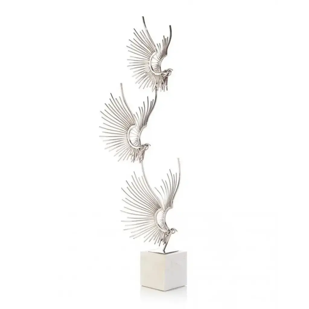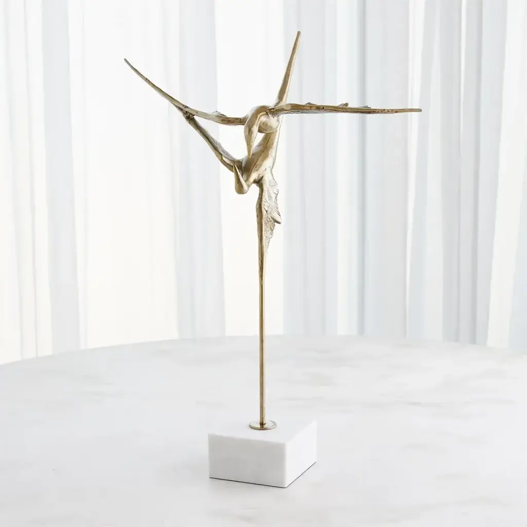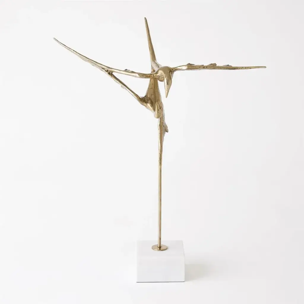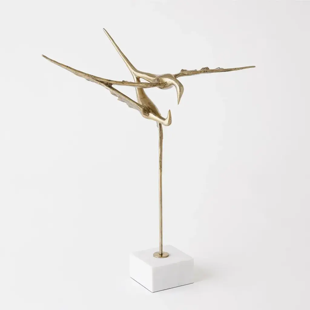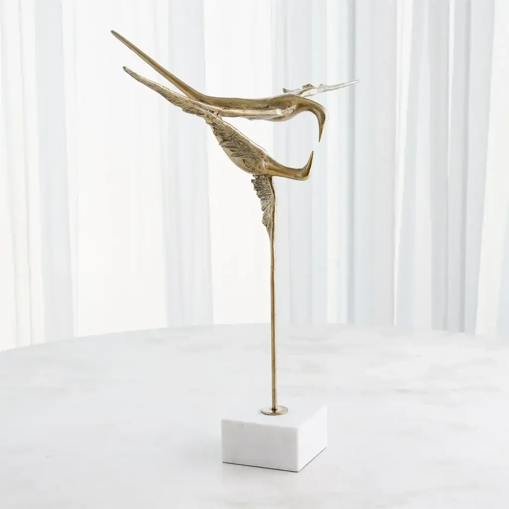 Inspired by the reflection of a bird flying closely over a lake, this sculpture is beautifully handcrafted from cast iron, featuring a faux brass finish elegantly presented on a white marble base. From a fashion forward perspective, Global Views offers accessories, furniture, statement lighting, and an assortment of rugs and mirrors to add beauty and joy to your home.
