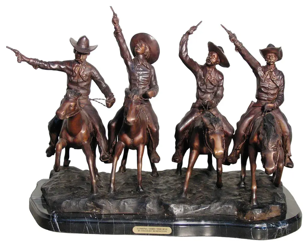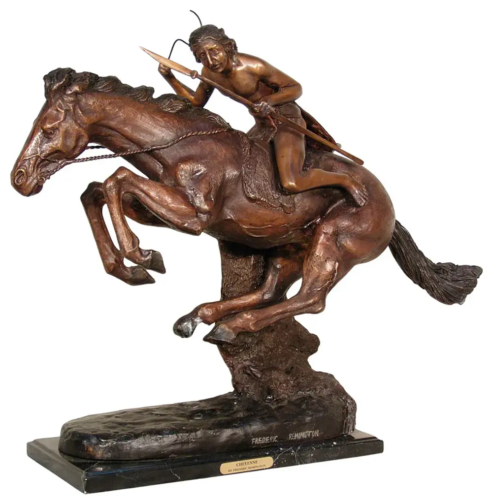 The Remington-inspired "Trooper of the Plains" sculpture depicts a scene from the wild west. Finished in bronze patina with the greatest attention to detail, this replica will add an air of the American frontier to your home. Includes a marble base.