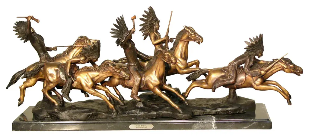The Remington-inspired "Warriors" sculpture depicts a scene from the wild west. Finished in bronze patina with the greatest attention to detail, this replica will add an air of the American frontier to your home. Includes a marble base.