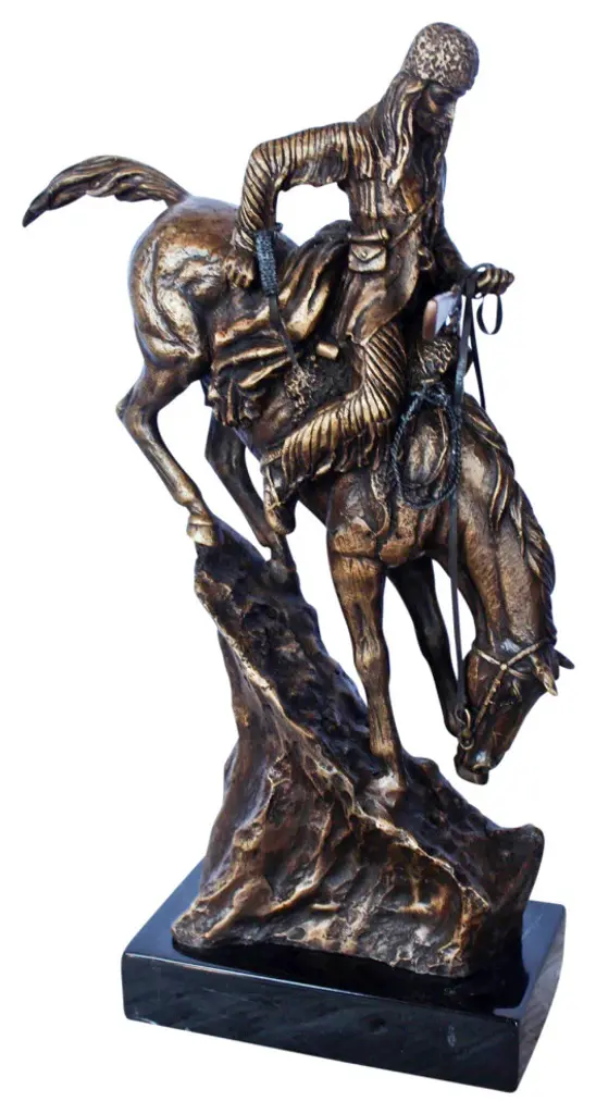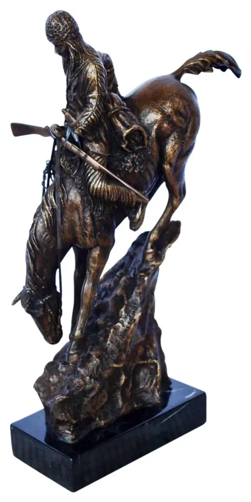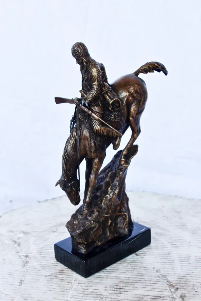 This bronze statue replicates the well-known piece named "Mountain Man" by famous sculptor Frederic Remington.In this piece of art, the title certainly matches with the characteristics, clearly depicting a horse and his rider, musket in hand, carefully descending a mountain witih a large slope. Situated on a classy marbe base, the detail and strong comparison make it a worthy purchase for any home. Size: 10"L x 4"W x 15"H. Weight is: 12Lb