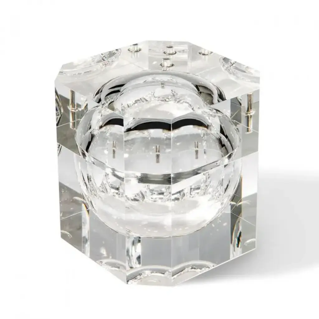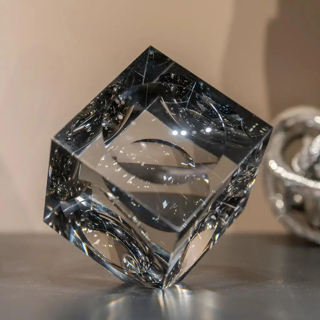 The “So 70’” cube is a true manifesto of retro design, blending sculpture and decorative object. Inspired by the futuristic boldness of the 1970s, it plays with geometric lines and optical effects, offering a strong and elegant graphic presence. Crafted from perfectly polished solid glass, it interacts with light through circular concavities carved into each face. These geometric hollows create fascinating optical effects, transforming the cube depending on the viewing angle and light intensity.A piece that is both minimalist and hypnotic, it stands as a genuine retro-futuristic statement. Placed on a console, desk, or shelf, it becomes an elegant and timeless focal point.Contact us before ordering to confirm product availability.