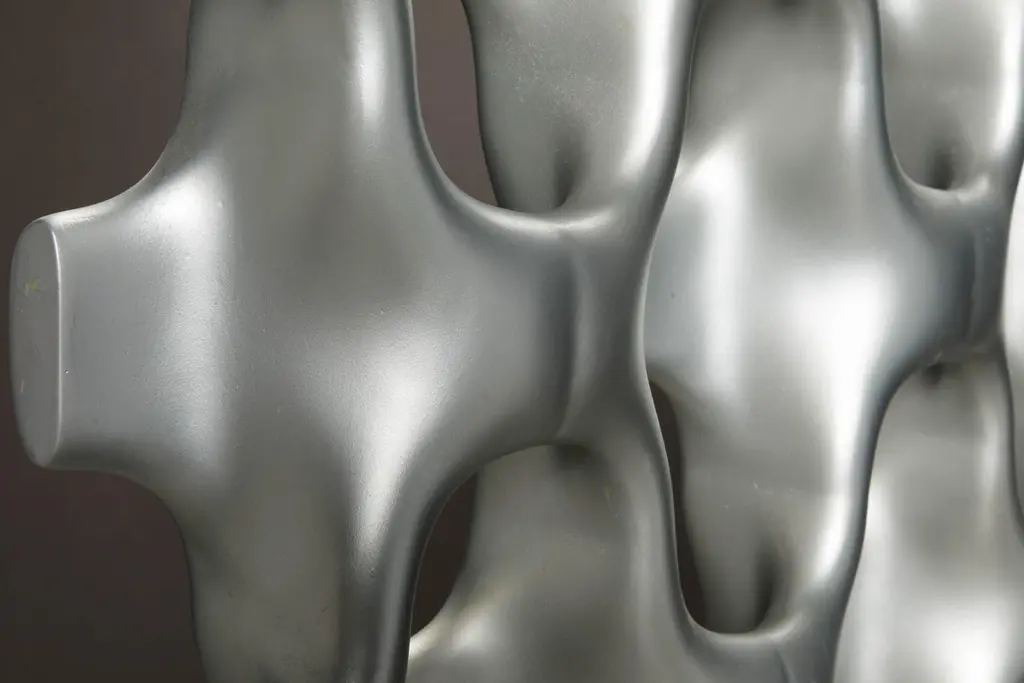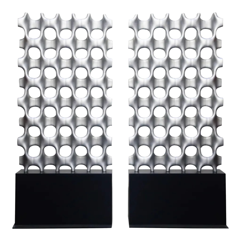 This freestanding model C-20 Sculpta-Grille room divider by Richard Harvey for Harvey Design Workshop, Inc was conceptualized and designed in the 1950s and finally released to the public in 1959 as a line of injection molded architectural screens and room dividers. Popular throughout the 1960s and 1970s, often used as luxury room dividers, privacy screens and architectural elements for modern and contemporary architecture and interior design. This particular model (C-20) is part of the 'Contemporary' collection of modern undulating screens often referred to as the 'Bone' screens due to the resemblance to futuristic skeletal sculptures. This pair of examples were finished in a silver paint and lacquer. We have a number of other examples in different colors, contact us or see our other listings for more details. The C-20 Contemporary grille is an original sculpture, more massive in appearance than C-10. The bold and dynamic pattern of this sculpture increases in interest through repetition, while the depth and flow of its form creates a wall surface whose beauty of texture equals its value as a grille.The massive quality of the C-20 sculpture belies its light weight, derived through Richard Harvey's exclusive plastics techniques. High strength and high impact resistance are inherent in the structural nature of the panels and wall sections, which are factory prefabricated from the basic module. The unusual depth and design of this grille offers excellent light-diffusing characteristics for facades and window areas.Richard 'Dick' Harvey, born in 1919 was raised in New York City and studied art at Brooklyn Tech High school and received a degree in Mechanical Engineering at City College of New York. His initial goal was a career in the fledgling field of industrial design. Later he began working with his father designing and manufacturing plastic injection molds for the doll industry.In June of 1959 an article and photograph appeared in Interior Design Magazine; inquiries and orders quickly followed. "Harvey Design Workshop" became incorporated and the "Classics" line of "Sculpta-Grille" was officially launched. Methods and tools were developed for assembling the grillwork parts--made of high-quality injection molded plastic--into panels. Articles and installation photographs continued to appear in trade magazines and newspapers from coast to coast. Recently, the Contemporary line has become highly collectable; originals are rare and quite expensive. It has become very popular among set designers, presenting a beautiful mid-century-modern look. Contemporary Sculpta-Grille has been used in many films, television commercials and music videos. These Richard Harvey (sometimes misattributed to Don Harvey) model C 20 'Bone Screen' room separator / floor sculptures would work great in a Mid-Century Modern, Scandanavian Modern or Danish Modern home or penthouse apartment but could also look fantastic in a Contemporary or Post-Modern room. Also consider mixing it up in a Traditional, Transitional, Classical or Art Deco room with a splash of juxtaposition. Would also be an apt choice in a commercial project such as a hotel lobby lounge or members club, creative design studio or high-rise executive office. MEASUREMENTS: H 74.5" x W 33.5" x D 19.5" (Bone screen part only) H 56.25" x W 33.5" x D 4.75" CONDITION:Very good condition with minor wear as expected from age including minor scratches, scuffs, nicks and craquelure. One example has an approximately 2 inch stable crack near base.