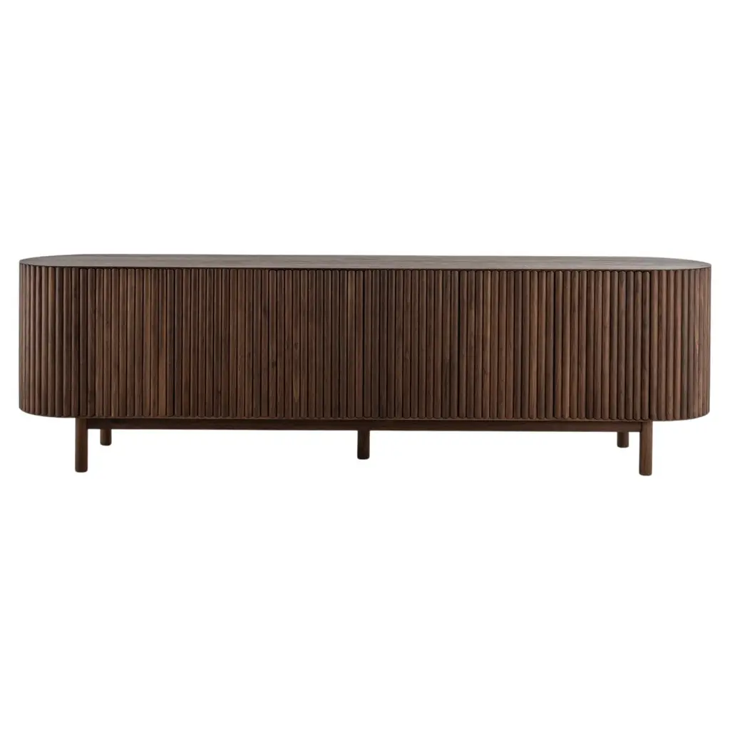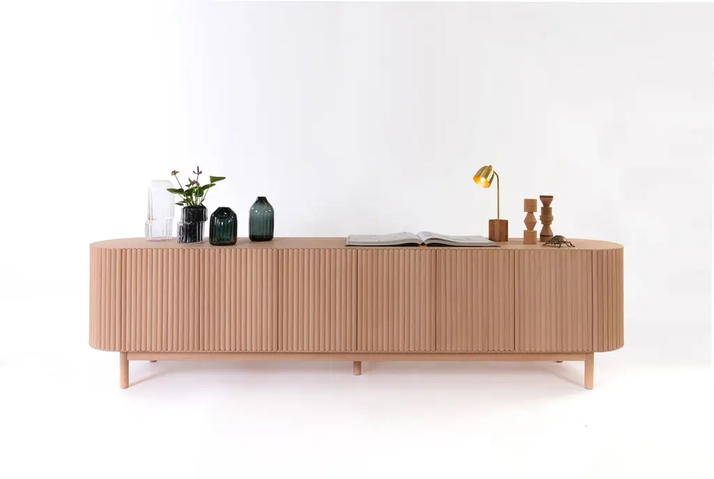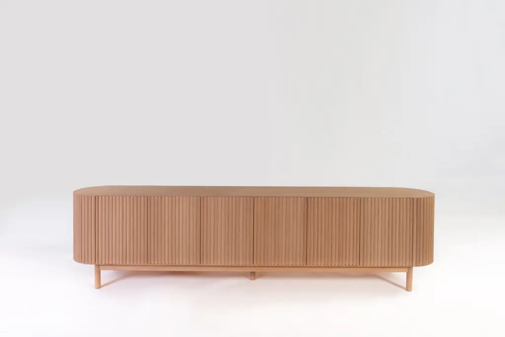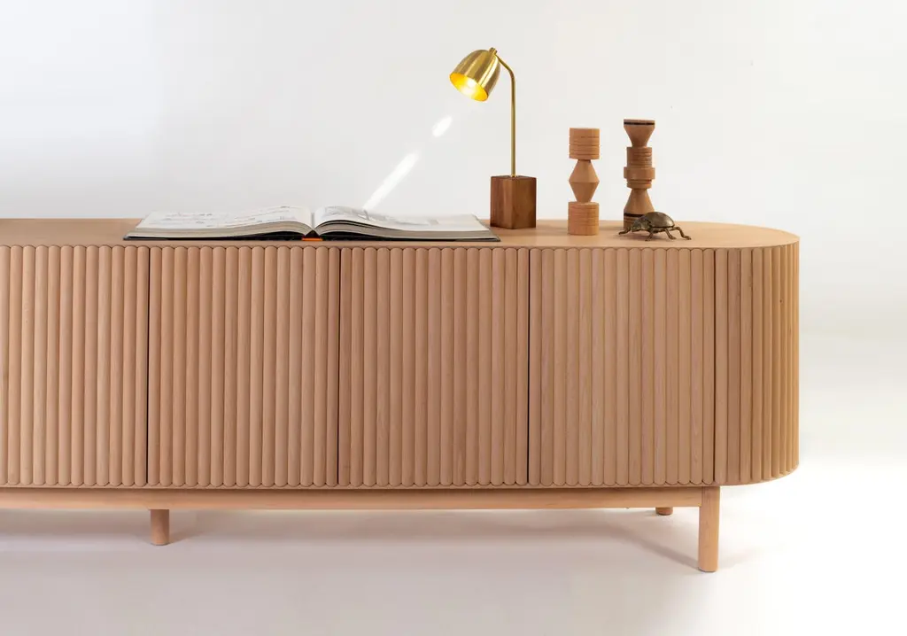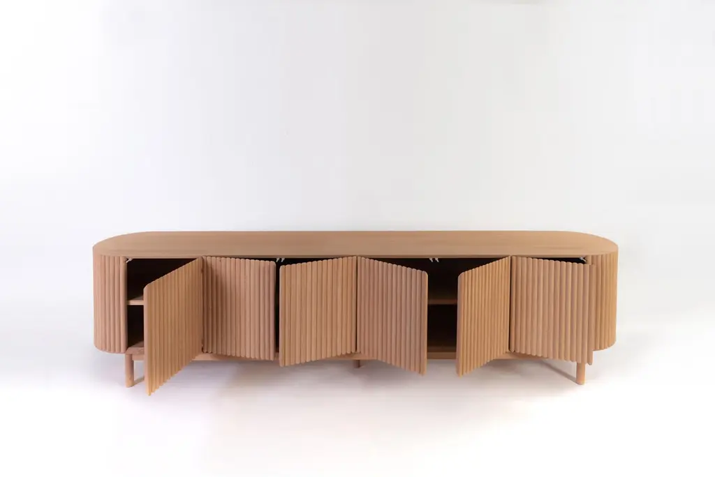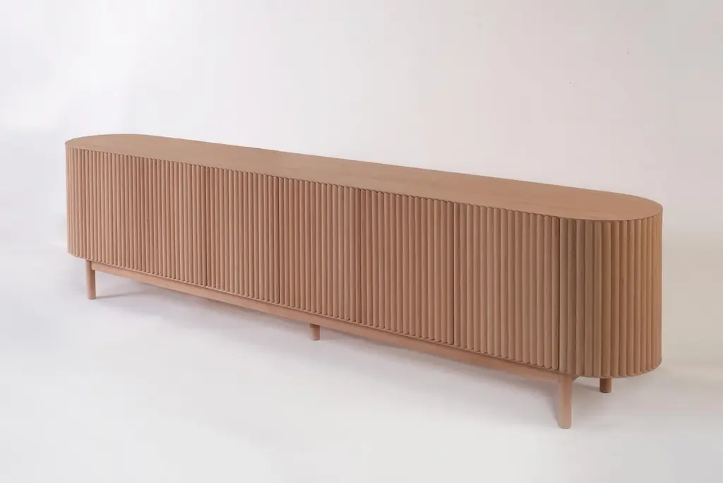 Between the sculpture and the functionality of the object, the RIMA credenza is inspired by the dynamism and the cadence of a poem, drawing all the attention to the wooden slats that are repeated one after the other to form a texture that embraces the cover and the oval base. This poetically handmade piece gives visual and tactile harmony to the spaces.Material: Solid Beech Wood.