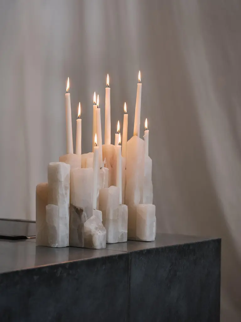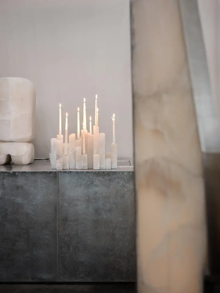 Ritus Cuatro Candelabra by Andres MonnierUnique Piece.Dimensions: W 72 x D 20 x H 40Materials: White OnyxTreko Concrete is a Mexican studio based in Ensenada, that aims to create functional handcrafted furniture and sculptural pieces to tell stories with art and design. With the direction of Andres Monnier, Treko Concrete now creates handmade fire pits, art objects, and functional furniture with natural stone, mirrors, concrete, wood, and metal. Treko works with different techniques and languages of Creation to innovate new purposes in conventional furniture.Andrés Monnier is a Mexican artist born in Guadalajara and is based in Ensenada.He aims to create sculptural pieces to express stories through the synergy between art, design, and sculpture. In 2017 he founded his studio, where hand in hand with his team, created pieces with fire, art objects, and functional furniture with rock, glass, concrete, wood, and metal.At the end of 2020, Andrés began to create his first collection of pieces with rock. His signature material. It wasn't until 2021 that he (with studies in medicine and industrial engineering) decided to launch as an emerging artist and held his first exhibition entitled “Olympo”, in which he exhibited the 17 pieces of this first collection inspired by Greek Mythology.Monnier participated in his first exhibition as an artist in Tribeca, NY with Galerie Philia.His motivation is to use different techniques and languages of creation to innovate with his proposals for the world of conventional furniture. Monnier is a self-taught sculptor whose dream is to create and design his universe of pieces.