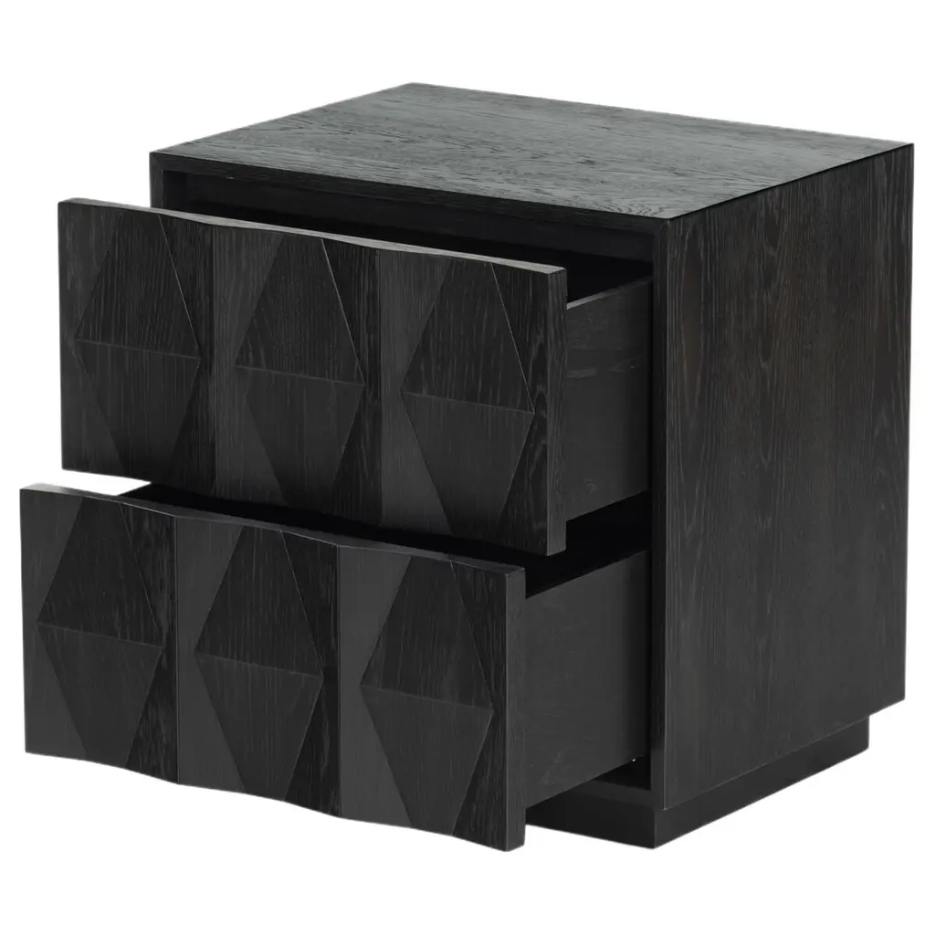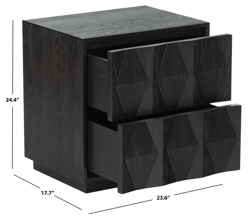 Discover the elegance and practicality of the Rivella Wood 2 Drawer Nightstand. Crafted from robust materials and featuring a unique geometric design on the drawer fronts, this nightstand offers a sophisticated ambiance to your bedroom. With ample storage space within its two smoothly gliding drawers, it keeps your essentials organized and within reach. The sturdy construction and stylish design make it a reliable choice for your furniture collection. Enhance your bedroom's decor with this tasteful and functional nightstand from Rivella.