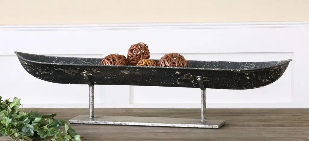 Made from heavily distressed, aged black metal with silver undertones and a silver stand.