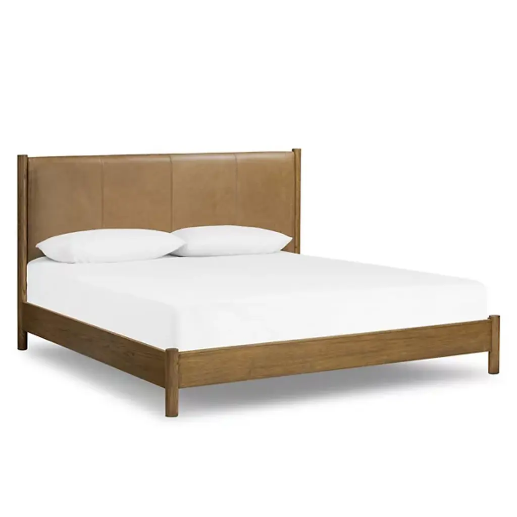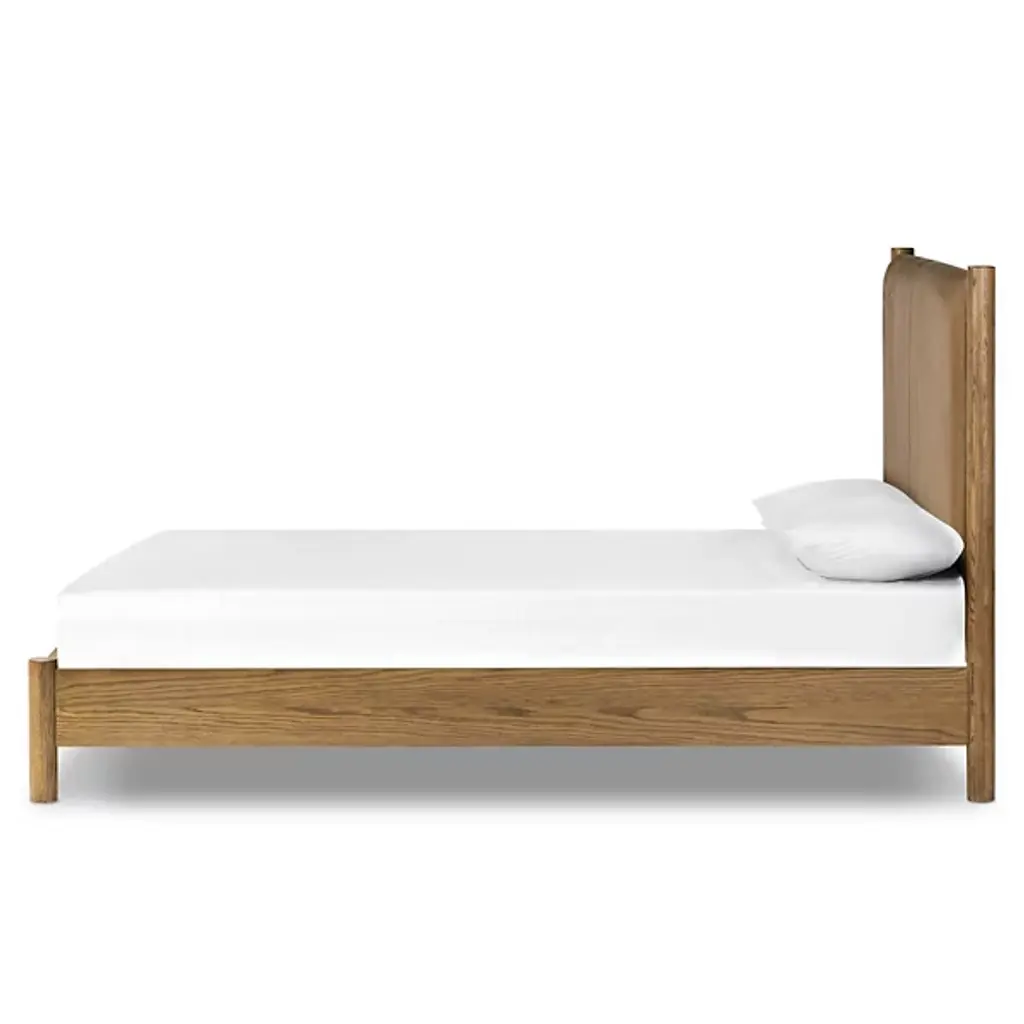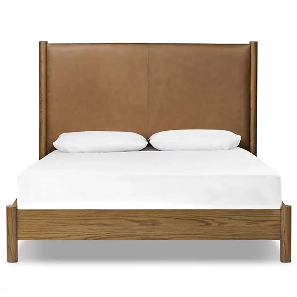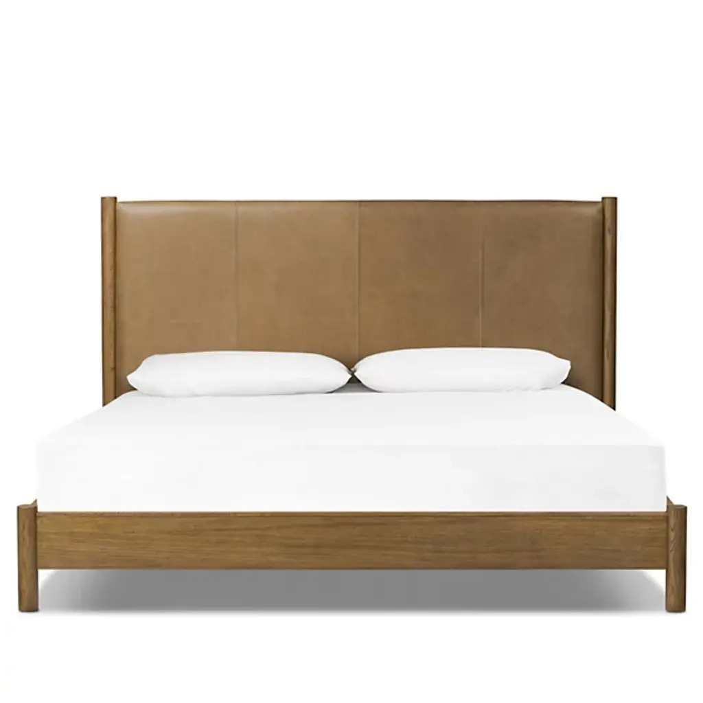 The Roark Bed from Four Hands elevates bedroom architecture through material harmony and studied proportions. The headboard showcases top-grain leather, its natural variations creating subtle depth across the upright surface. Substantial dowel legs, crafted from solid oak, establish a robust foundation while maintaining visual lightness. Poplar plywood reinforces the structure without adding unnecessary bulk. The bed's straightforward geometry allows each material to speak clearly - leather provides tactile luxury, oak contributes organic warmth, and clean joinery demonstrates craftsmanship expertise.
