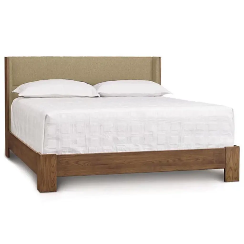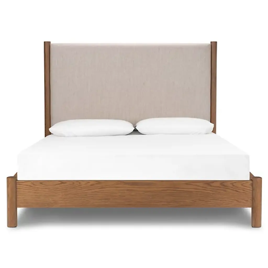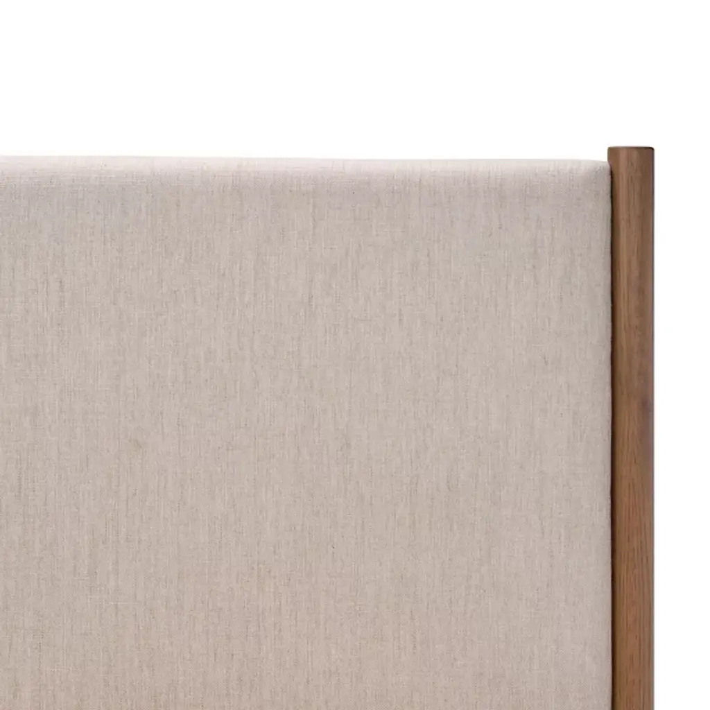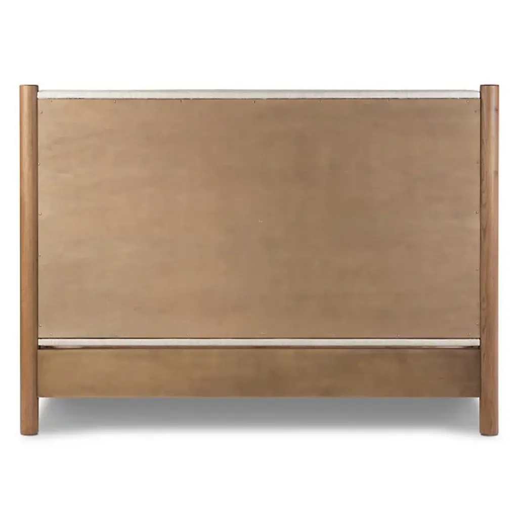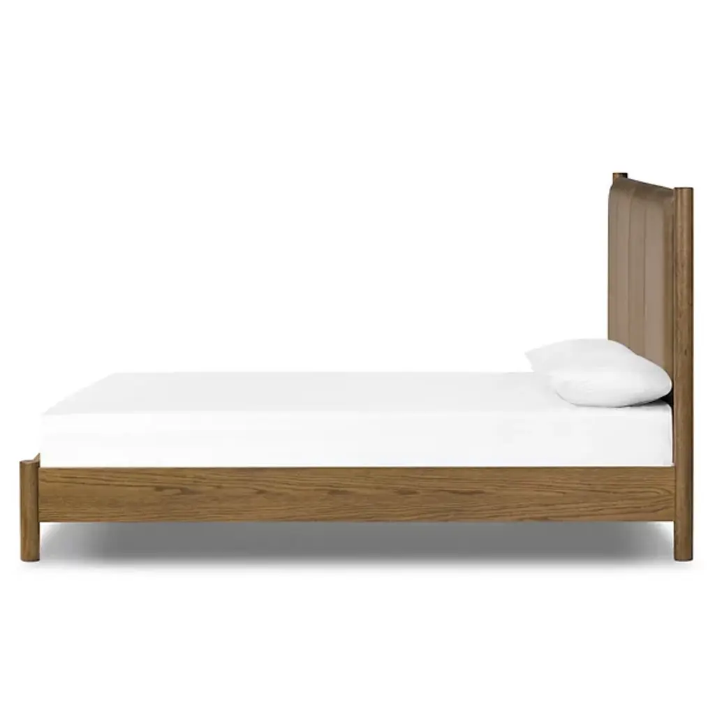 The Roark Bed from Four Hands elevates bedroom architecture through material harmony and studied proportions. The headboard showcases top-grain leather, its natural variations creating subtle depth across the upright surface. Substantial dowel legs, crafted from solid oak, establish a robust foundation while maintaining visual lightness. Poplar plywood reinforces the structure without adding unnecessary bulk. The bed's straightforward geometry allows each material to speak clearly - leather provides tactile luxury, oak contributes organic warmth, and clean joinery demonstrates craftsmanship expertise.