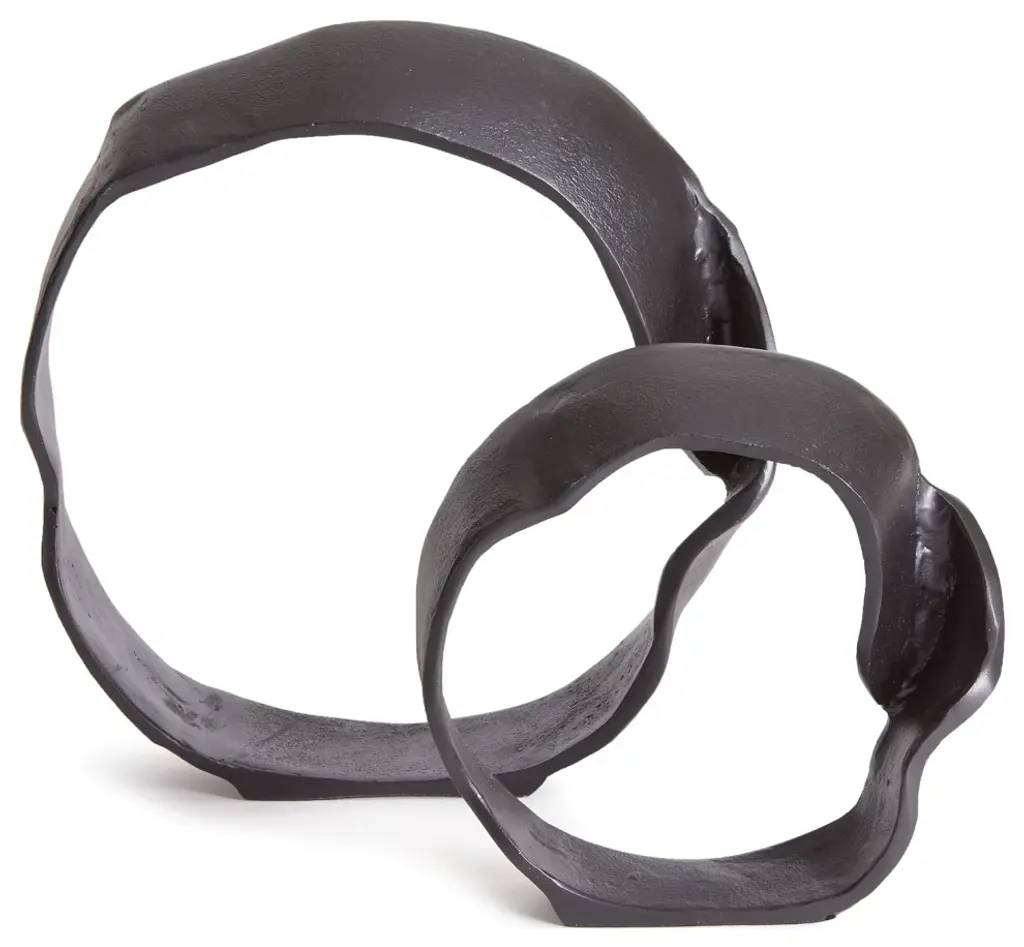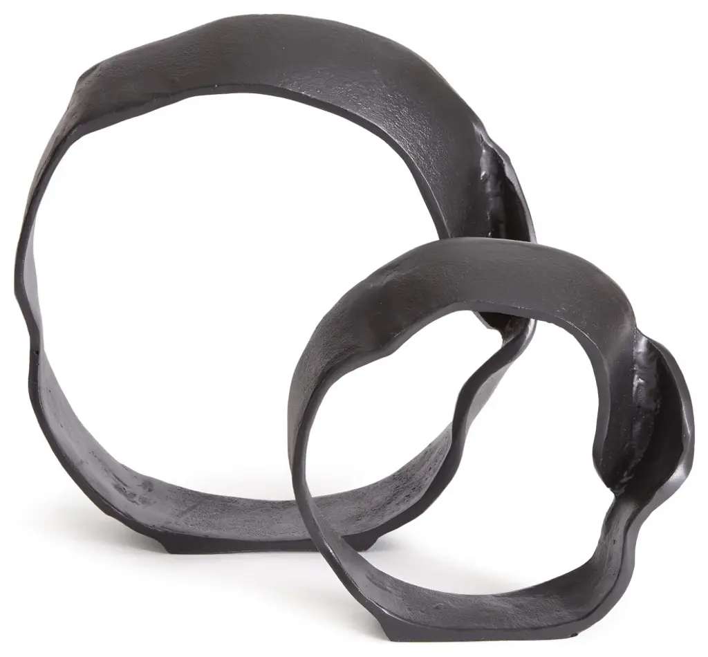 A matte black finish and rough, organic repeated circular shapes make these cast aluminum sculptures unique. A contemporary touch for home office or den on book shelf, mantle or console.