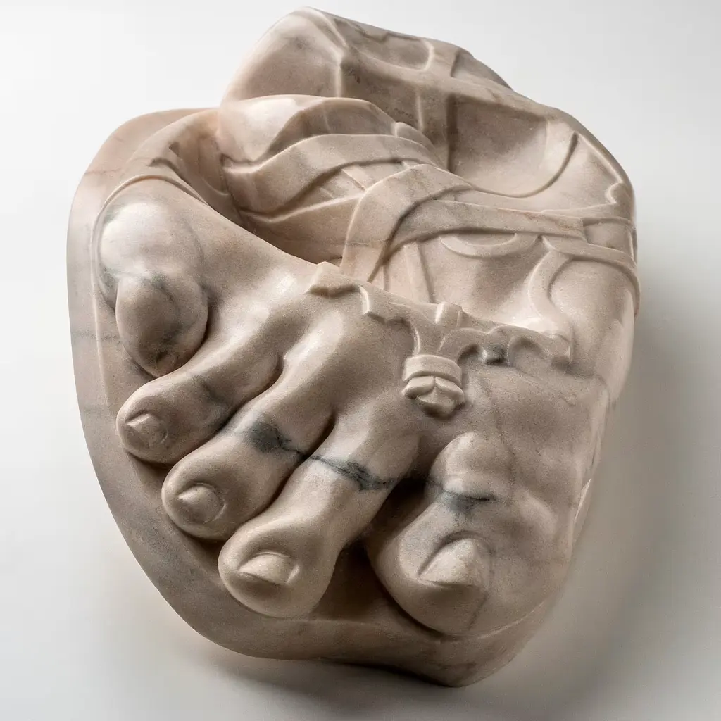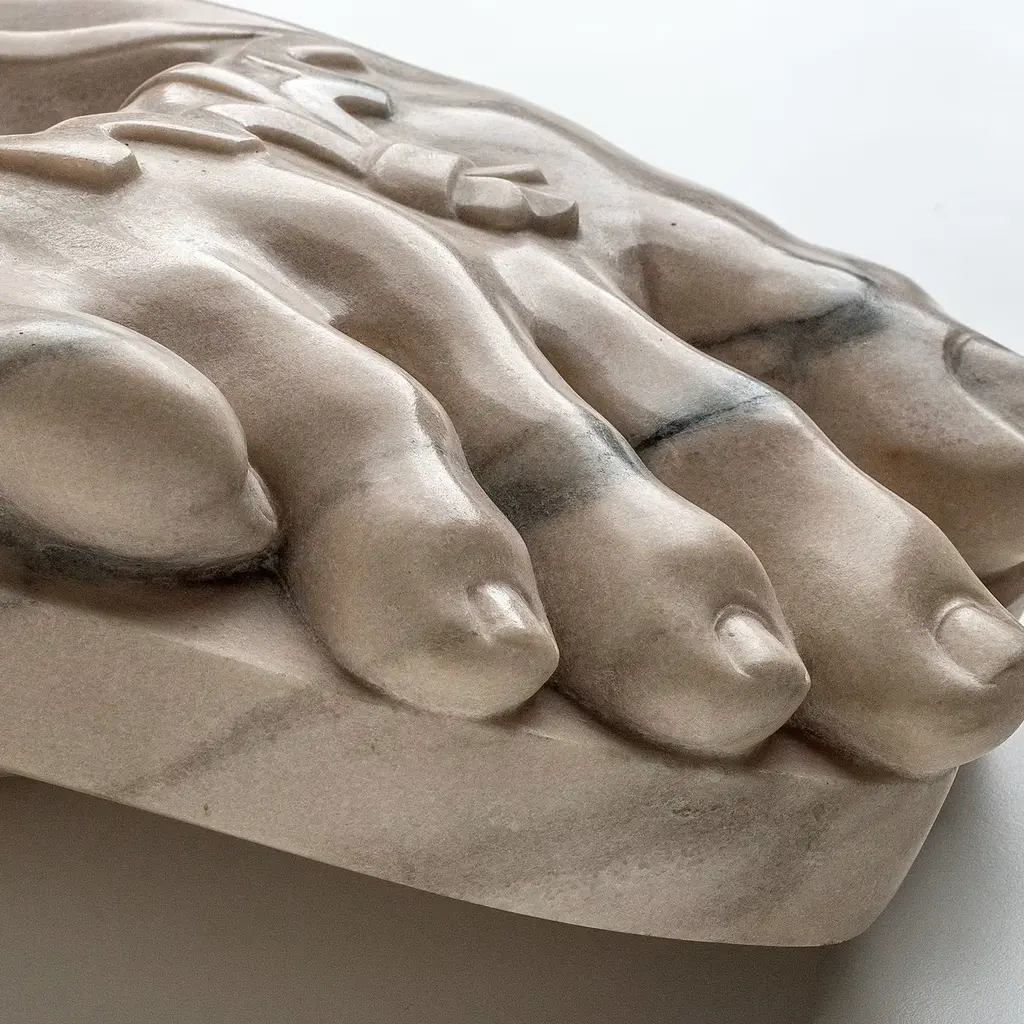 Masterfully sculpted as if it was rubber, the deliberately deformed version here offered of the Hermes' foot - from the iconic Hermes and the Infant Dionysus by Praxiteles - reflects artist Matteo Peducci's vision of a deformed contemporary life. The stunning natural traceries of pink Portogallo marble merge with the extraordinary textural dynamism the sculpture flaunts.
