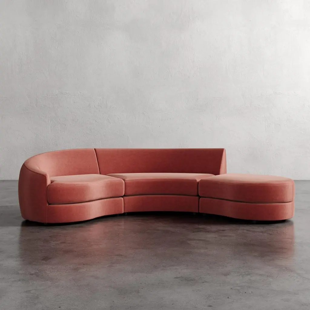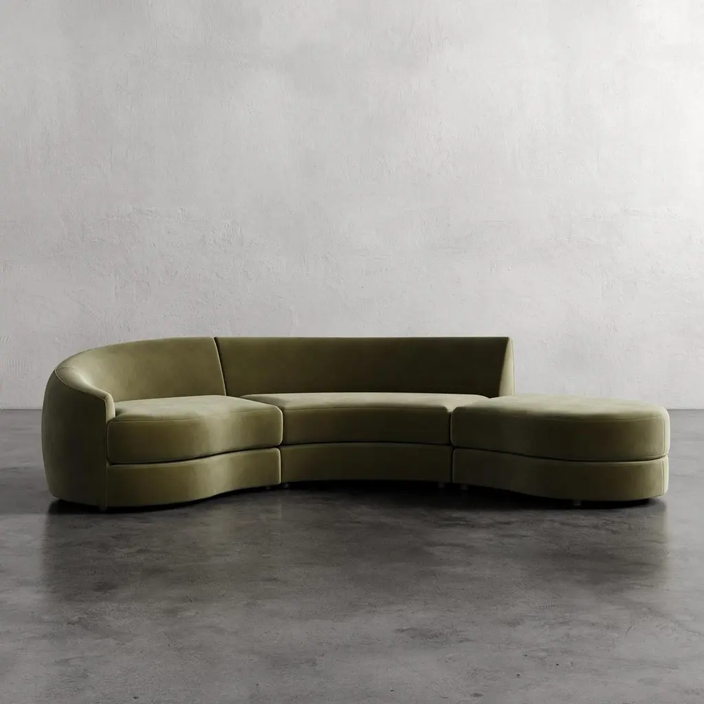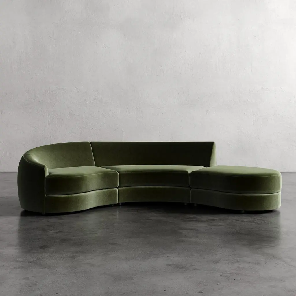 Drawn from the ethos of mid-century organic modernism, the Rulmann Collection embodies the curvilinear genius of Kagan, Royère, and Noguchi. Each module is sculpted, low-slung, and materially grounded, inviting personal reconfiguration. Sofa becomes chaise becomes multi-piece conversation sectional. Modularity is not a function, but a philosophy, a living system of sculpture and repose.Handcrafted in North Carolina, Rulmann is available in multiple modular components. Designed for permanence, built for expression.This listing is for the sofa upholstered in any of our PERFORMANCE velvet fabrics. There are 6 color options, as shown. 1) Cypress, 2) Balsam 3) Emerald 4) Hazelnut 5) Sienna 6) Patina. Please contact us if you are interested in other fabric options. We also have it available in many standard velvet colors and bouclés in a separate listing.
