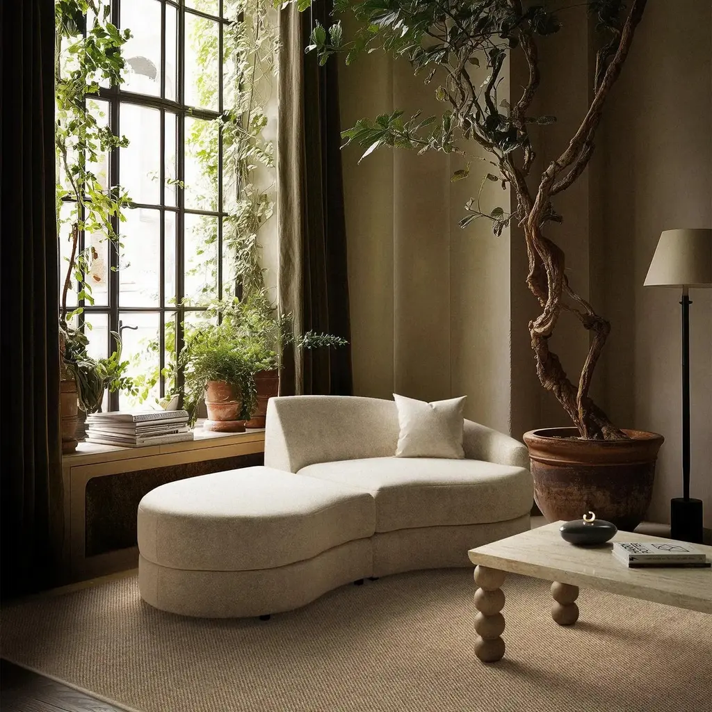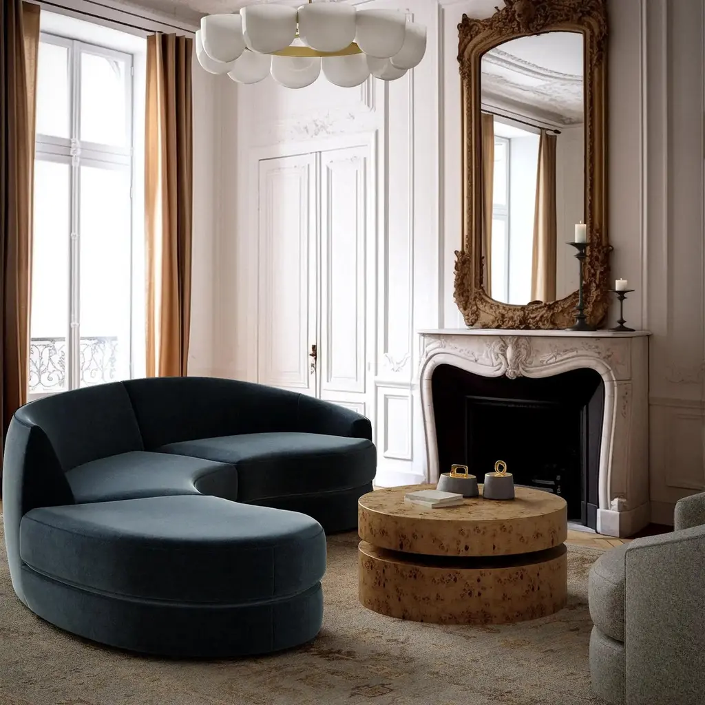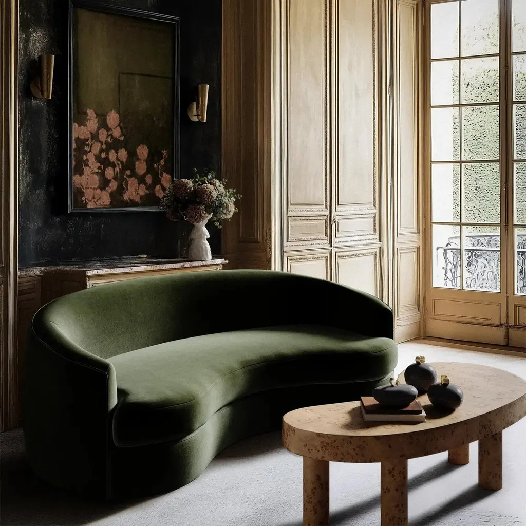 Drawn from the ethos of mid-century organic modernism, the Rulmann Collection embodies the curvilinear genius of Kagan, Royère, and Noguchi. Each module is sculpted, low-slung, and materially grounded, inviting personal reconfiguration. Sofa becomes chaise becomes multi-piece conversation sectional. Modularity is not a function, but a philosophy, a living system of sculpture and repose.Handcrafted in North Carolina, Rulmann is available in multiple modular components. Designed for permanence, built for expression.This listing is for the sofa upholstered in any of our PERFORMANCE velvet fabrics. There are 6 color options, as shown. 1) Cypress, 2) Balsam 3) Emerald 4) Hazelnut 5) Sienna 6) Patina. Please contact us if you are interested in other fabric options. We also have it available in many standard velvet colors and bouclés in a separate listing.