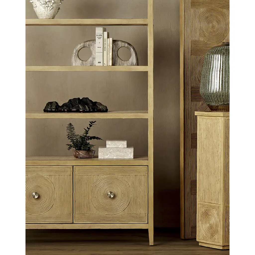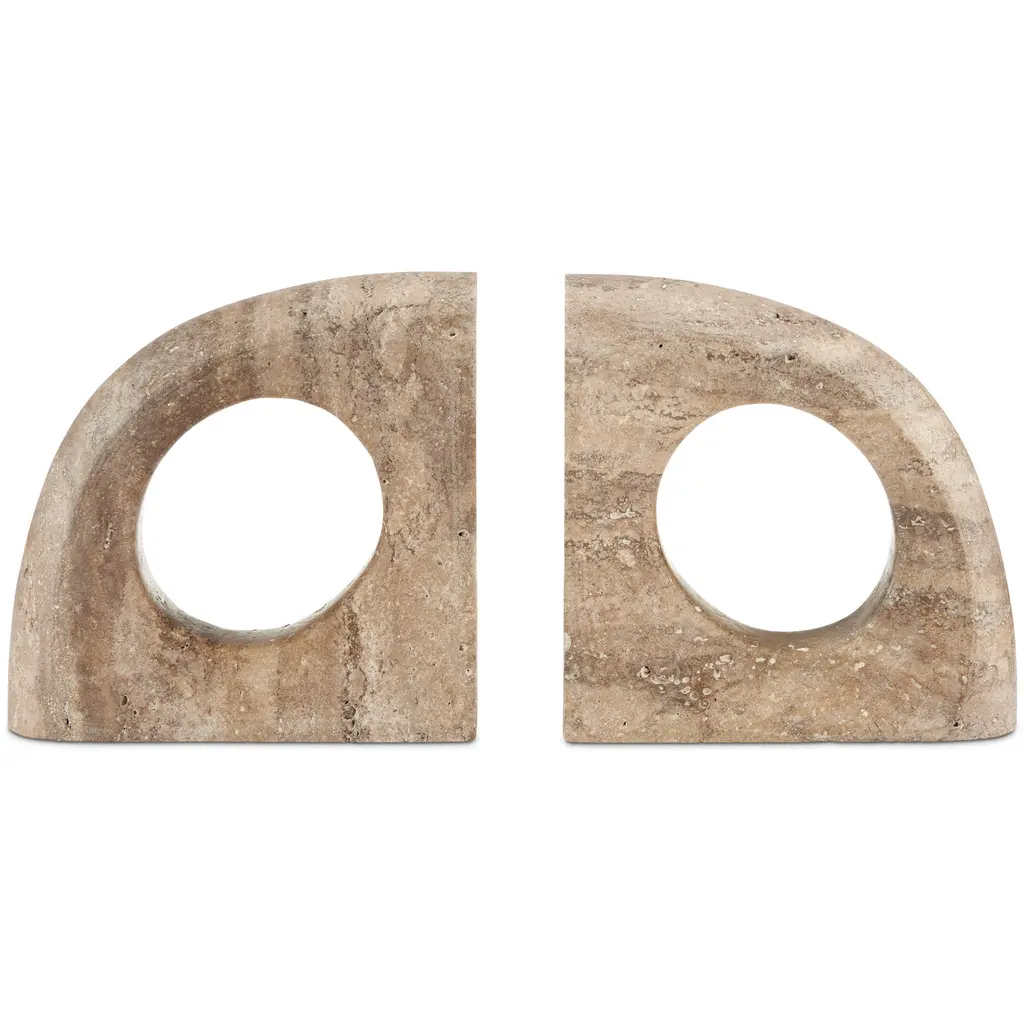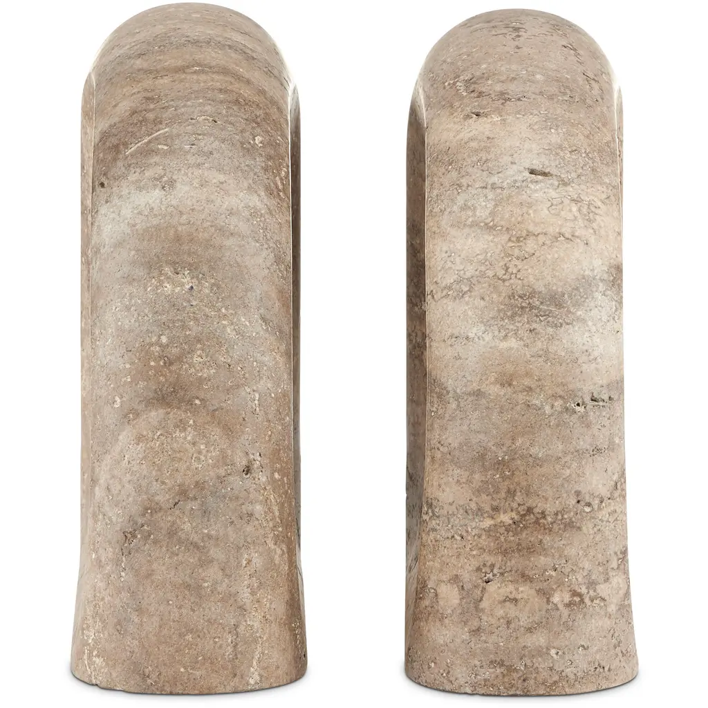 The Russo Travertine Object Set is made of titanium travertine; the surfaces of the sculptural pieces swirling with a more dynamic pattern than some travertine stones do. These brown sculptures were designed so they can also stand in for bookends. The pitting and veining on these objects will vary from piece to piece, given they are made of natural stone.