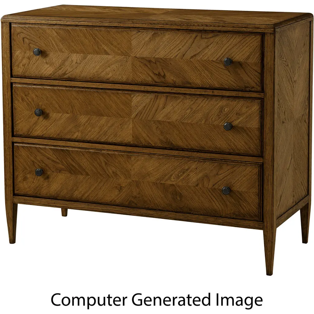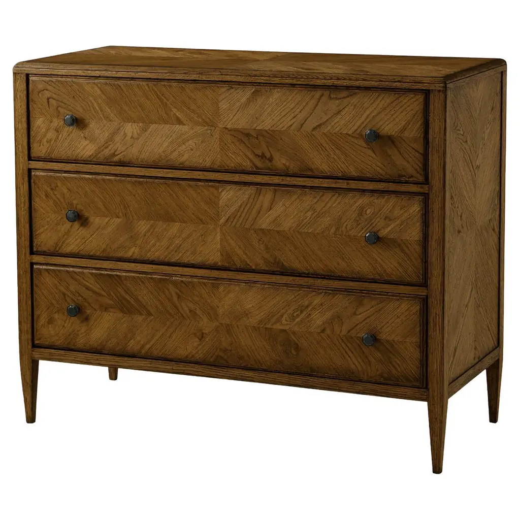 A dark rustic chest of drawers crafted with rustic oak. It has a mirrored herringbone oak parquetry design with three oak-sculptured drawers accented with Verde Bronze finished knobs and beautifully tapered oak legs. Dimensions: 46" W x 20" D x 37.75" H