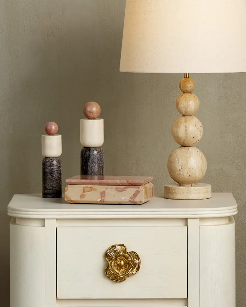 The Moreno Marble Objects Set includes two sculptures crafted from a selection of exquisite marbles. These geometric sculptural pieces boast tremendous personality, highlighted by the unique veining patterns and contrasting dynamic surfaces. Each piece is distinct, as the sculptures are made from natural stone, ensuring that no two are exactly alike.