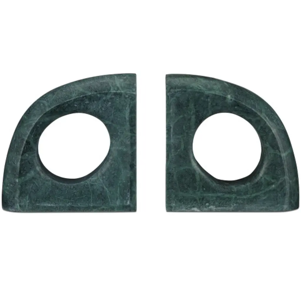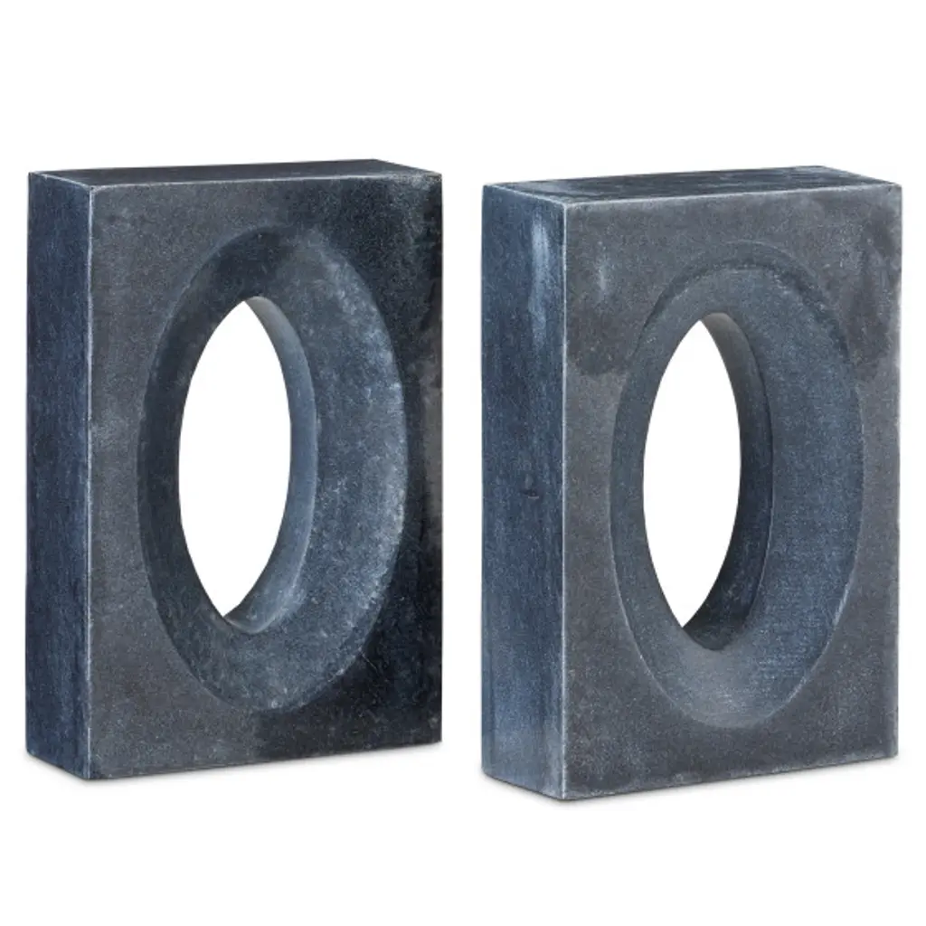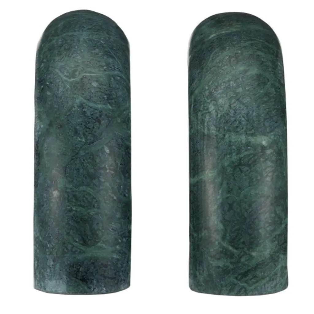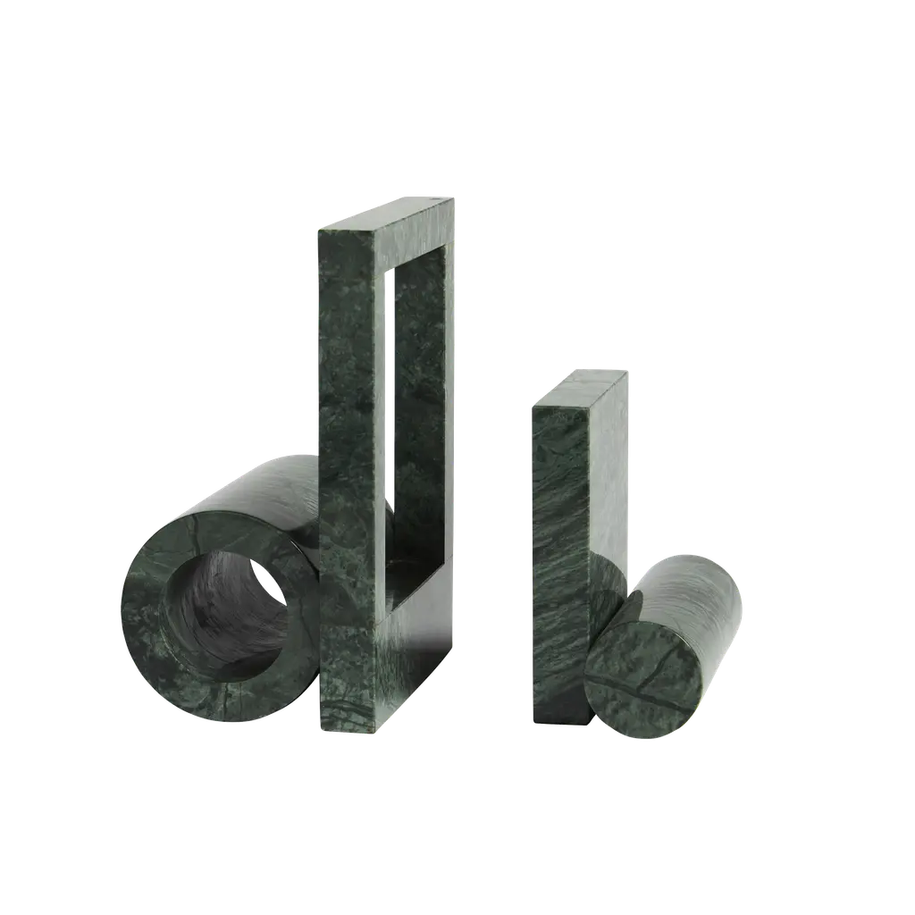 The Object Set includes two marble sculptures that are versatile decorative accents; they will stand on their own as sculptures or will make excellent bookends. Because the pieces are made of natural marble, the veining of each will be slightly different, making each one unique.