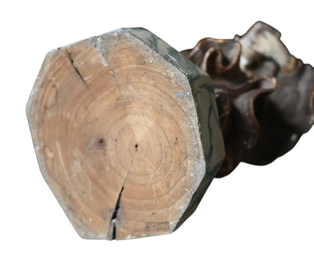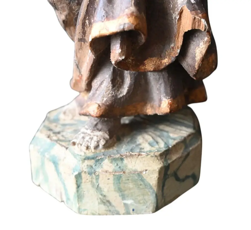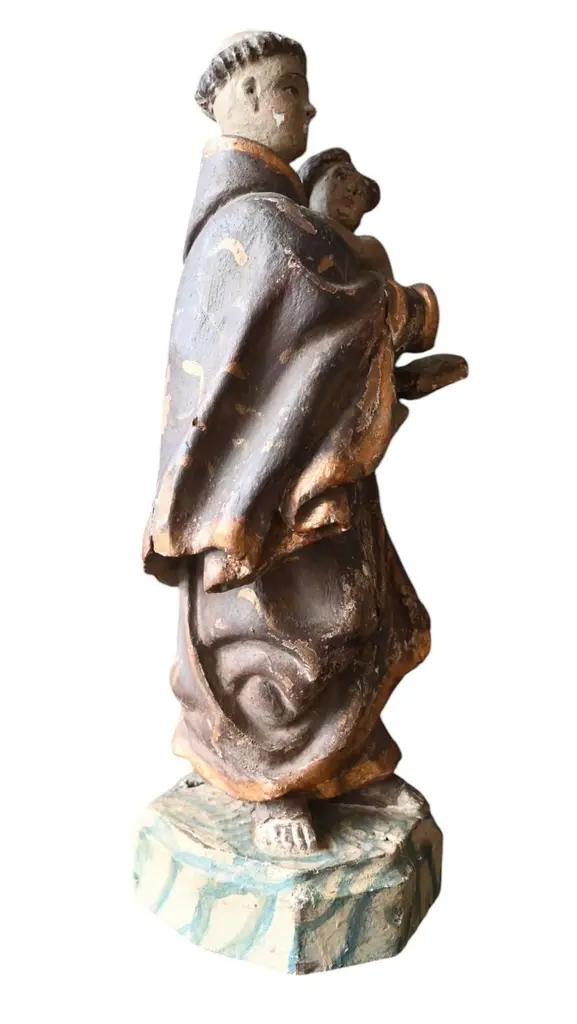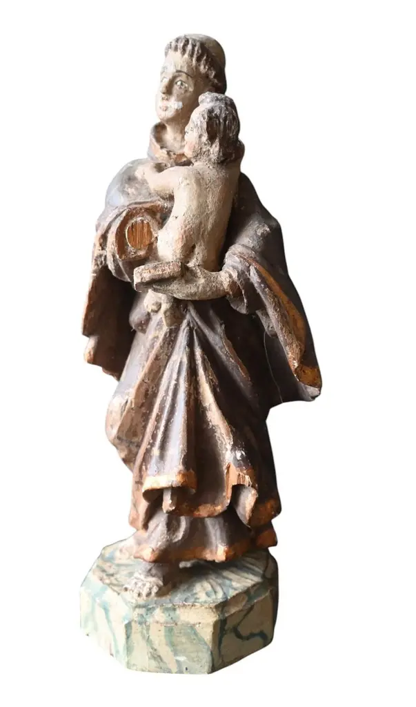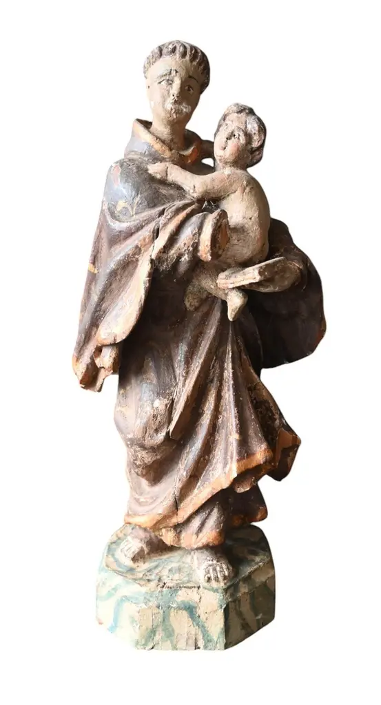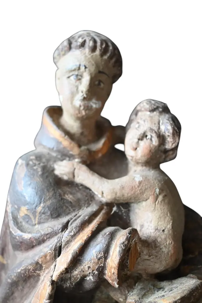 "Saint Anthony Of Padua With The Infant Jesus – Polychrome Wooden Sculpture, Tyrol, 18th Century "Saint Anthony of Padua with the Christ Child – Tyrolean Polychrome Wood Sculpture, 18th CenturyOrigin: Tyrol (Austria or Northern Italy)Date: Circa 1750–1790Material: Carved and polychrome-painted pinewoodDimensions: H 33.5 cmCondition: Original polychromy with visible wear; stable structural cracks; losses to extremities; untouched and unrestored surface.DescriptionA charming and authentic 18th-century devotional sculpture depicting Saint Anthony of Padua holding the Christ Child, carved in soft pinewood and polychromed in a traditional Tyrolean palette.Saint Anthony is shown robed in the Franciscan habit, his gaze directed toward the Child, who clings affectionately to his shoulder. The figures are rendered in a gentle, almost naïve manner typical of folk workshops active in the Alpine region during the late Baroque period. The faces are simply modeled yet expressive, echoing the quiet intimacy and spiritual warmth associated with Tyrolean religious sculpture of this era.The statue stands on an octagonal base painted in faux-marble, a characteristic feature of vernacular Central European devotional objects. The base and sculpture show signs of age-related wear, including surface abrasions, flaking paint, and a vertical age crack through the base and lower back. The Christ Child's hand and some edges of the drapery are partially missing, consistent with age and devotional use. These elements, however, contribute to the piece’s authenticity and untouched appeal.Art Historical NotesThis piece likely originated from a regional Alpine workshop in Tyrol, active in producing small-scale devotional figures for home altars and village churches. The iconography of Saint Anthony with the Christ Child gained immense popularity in the post-Tridentine era, particularly among Franciscan communities. The restrained carving and stylized features reflect a late Baroque aesthetic transitioning toward early Biedermeier folk piety.