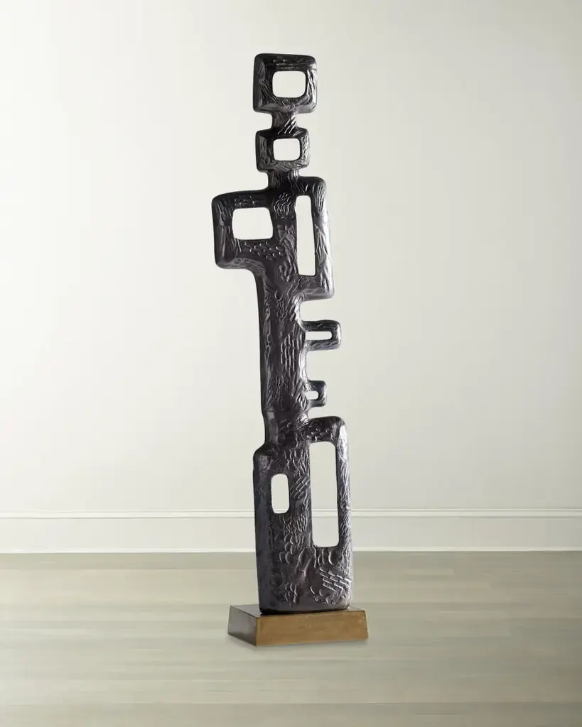 The Sargon sculpture is lavishly coated in a dark monochrome giving it a luxuriously ancient aesthetic This floor-standing sculpture consists of hybrid blend of solid and hollow geometric shapes and is covered with symbiotic engravings Handcrafted of aluminum Approx. 8"L x 13.8"W x 57"T Sold individually Includes hanging hardware Wipe clean Imported Boxed weight, approximately 20.3 lbs. Proposition 65 warning for California residents Shipping Direct from Vendor, usually ships within 14 business days. undefined