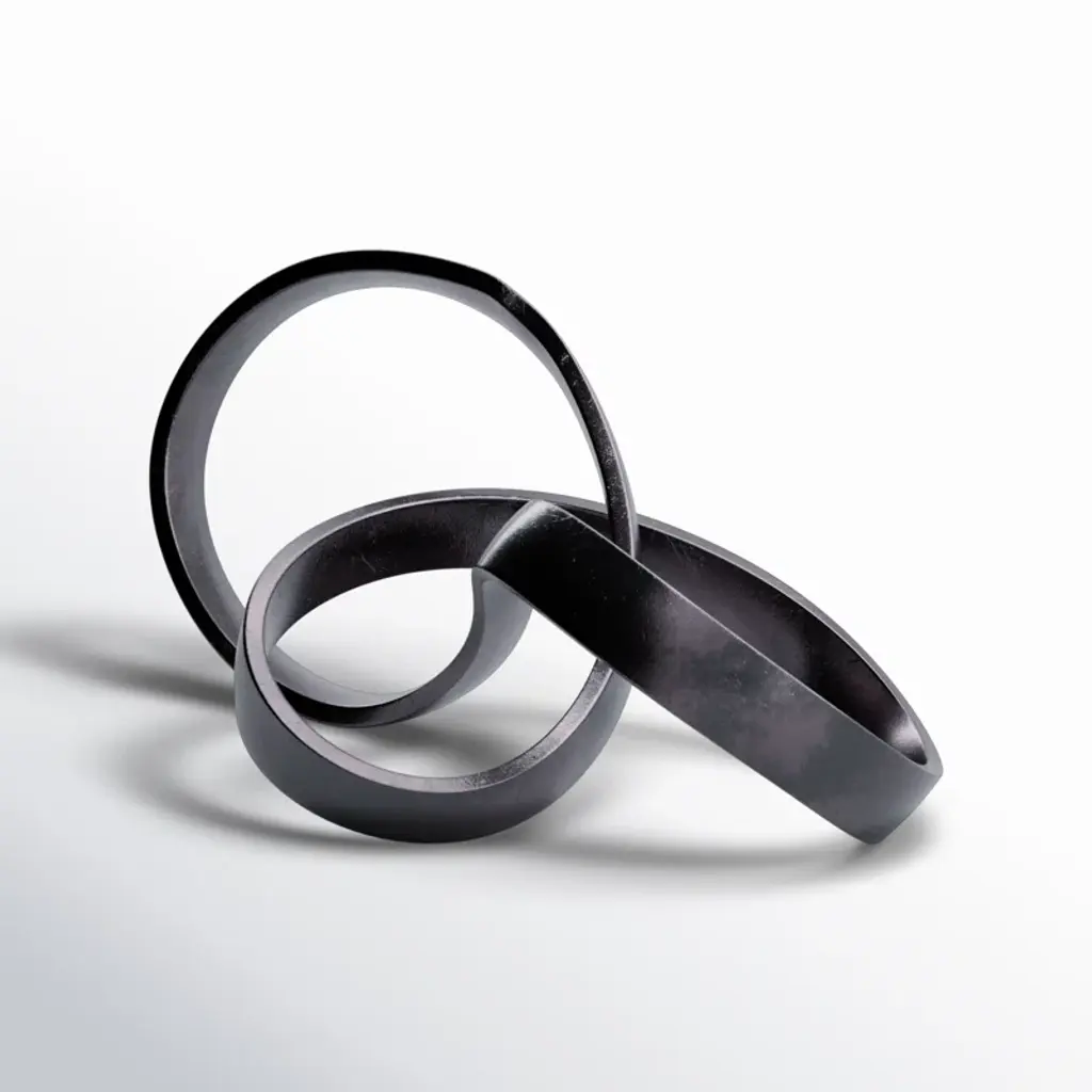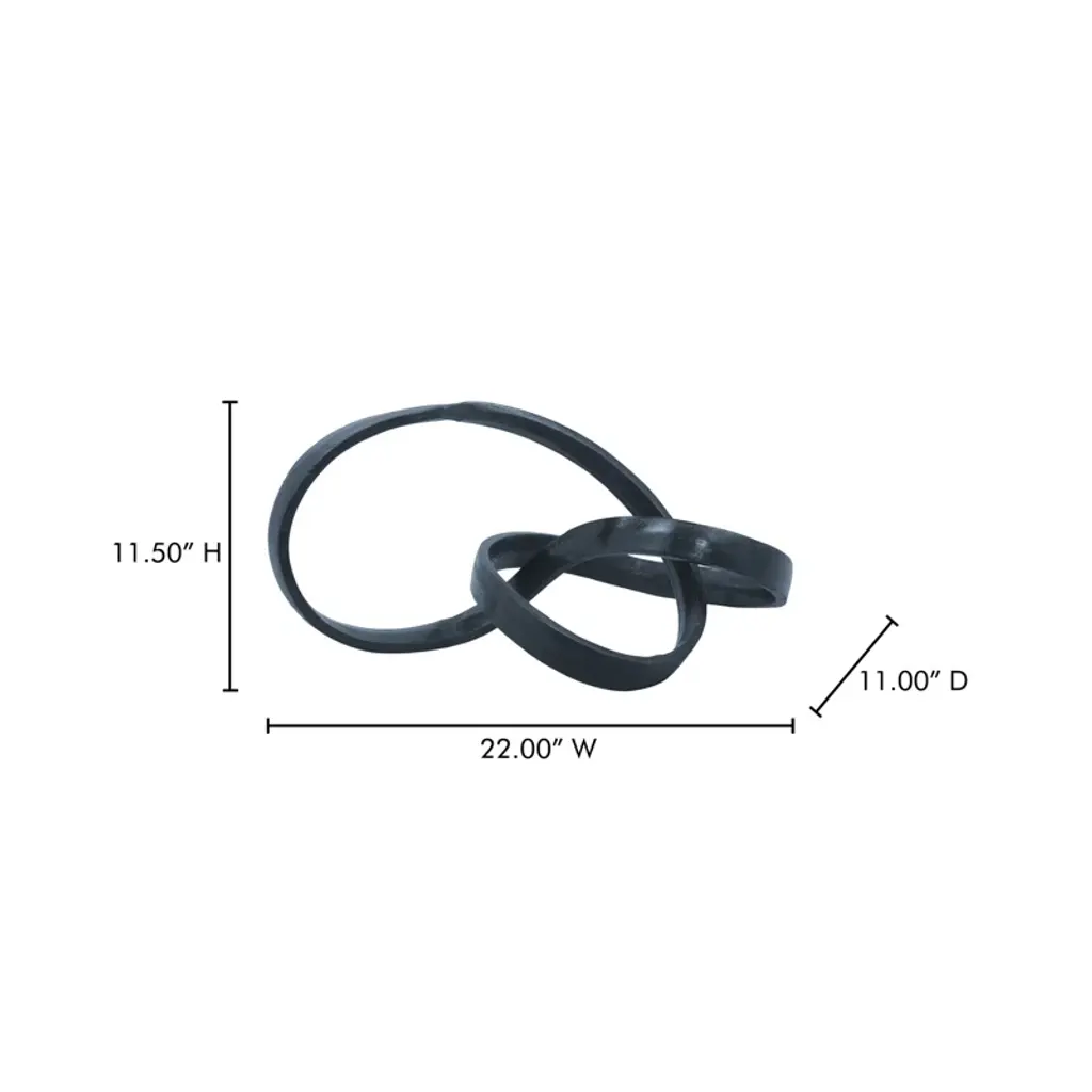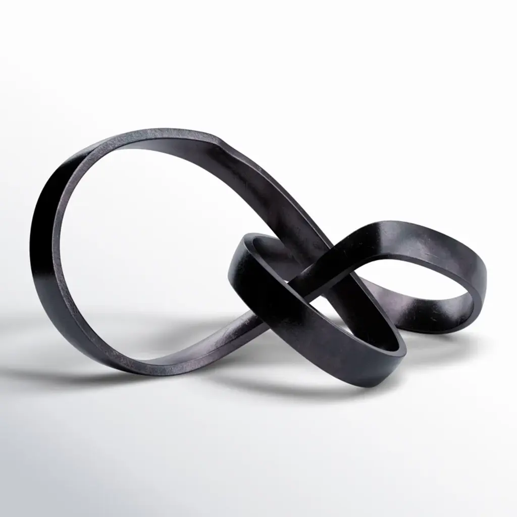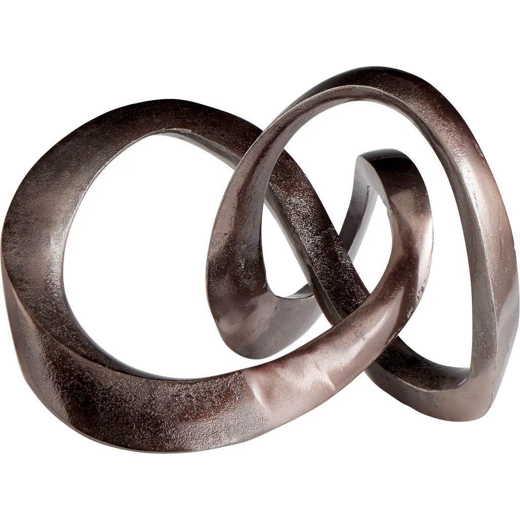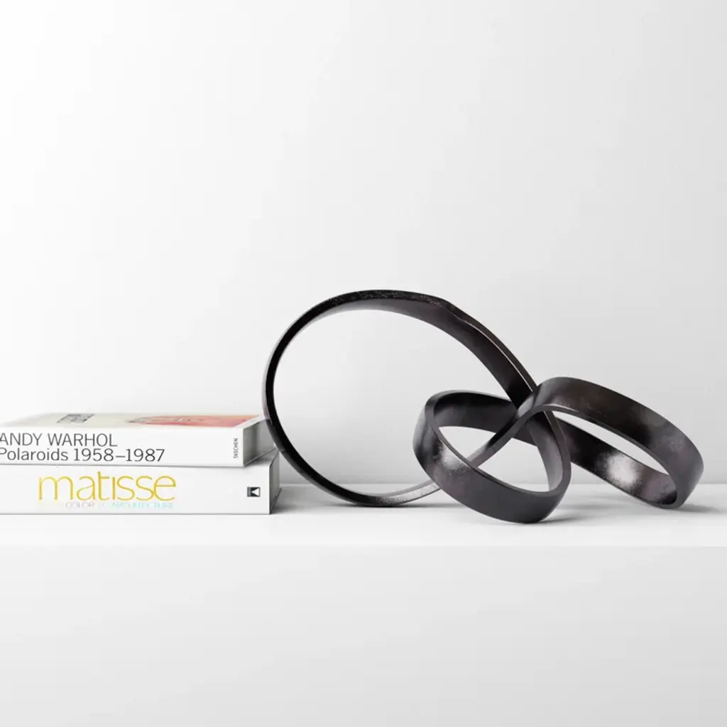 Infinity loop. This ribbon-like abstract sculpture swirls and knots around itself, bringing a sense of fluid movement to your space. It’s handcrafted from aluminum and hand-painted in a muted bronze tone that layers industrial-inspired character onto the dynamic silhouette.