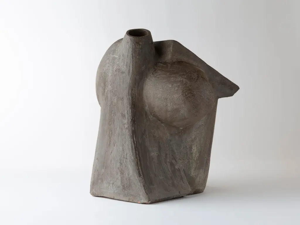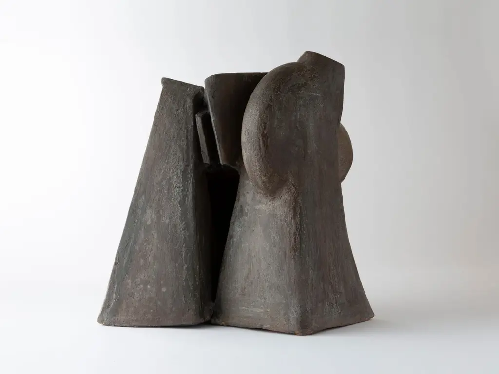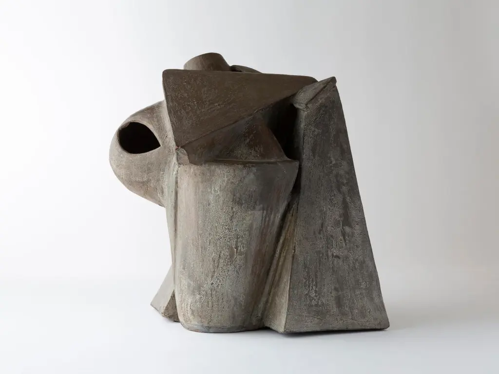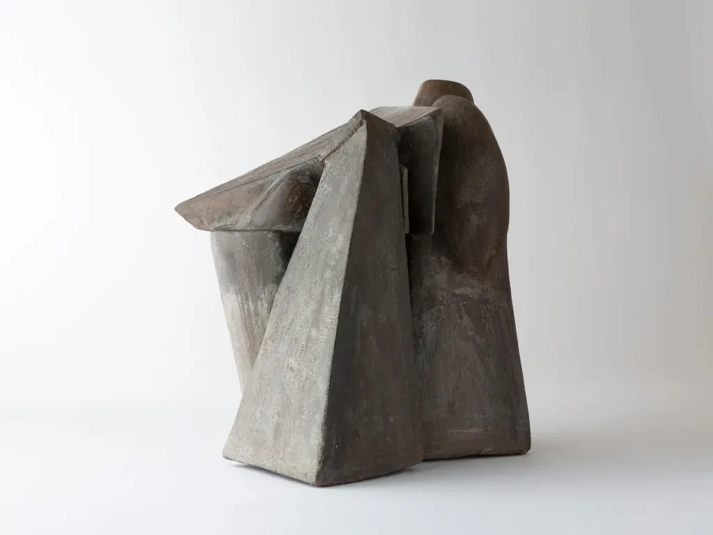 This glazed stoneware sculpture perfectly illustrates the artist’s resolutely modern approach to ceramics, at the crossroads of abstract sculpture and architectonic expression. The work displays a massive, angular, almost monolithic form, whose taut lines, fragmented volumes, and slanted planes evoke either futuristic architecture or a stylized face, reminiscent of Cubism.
