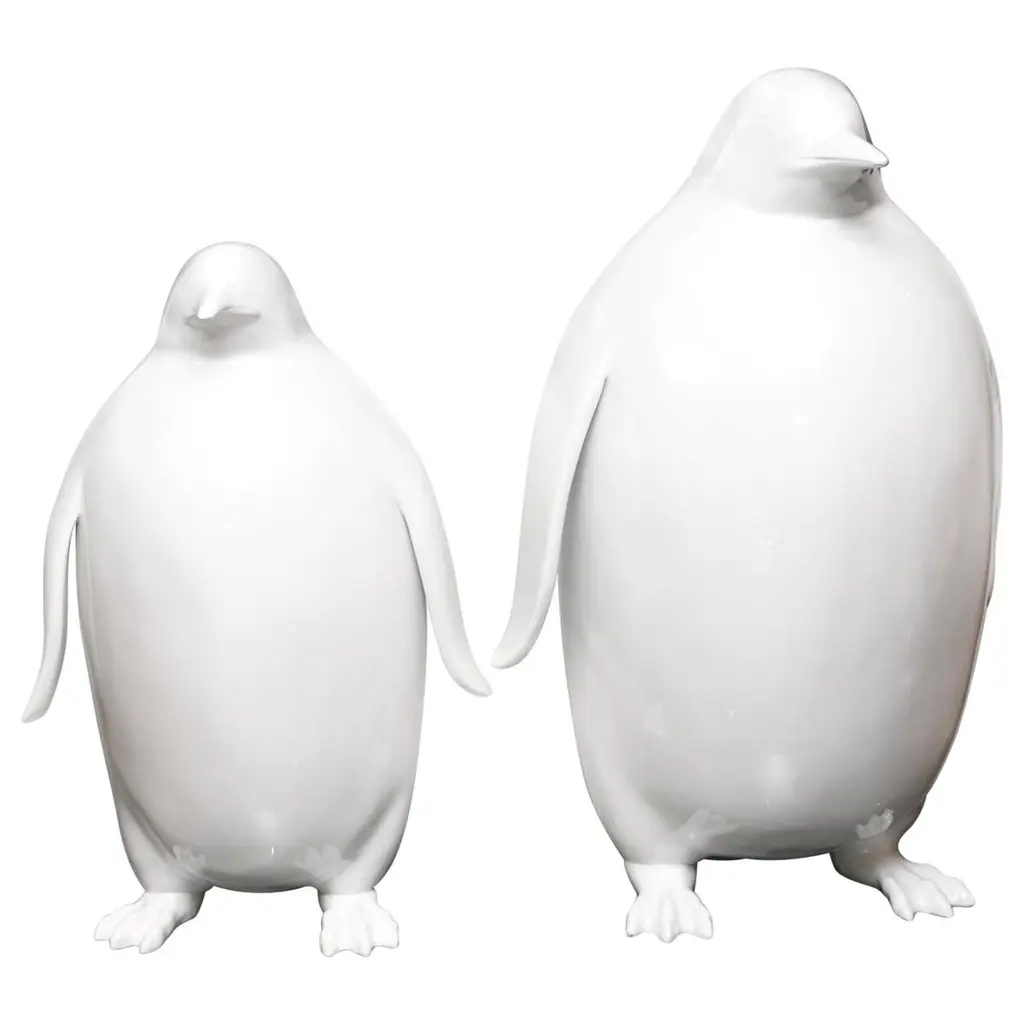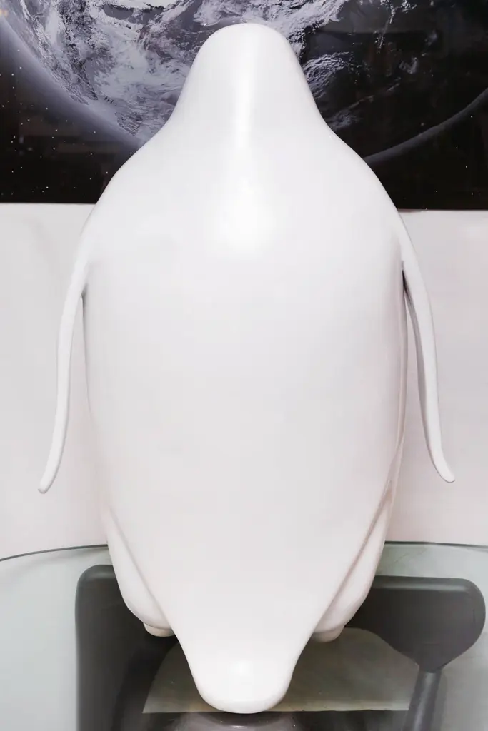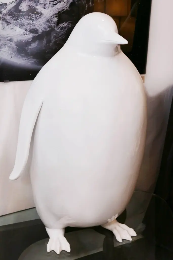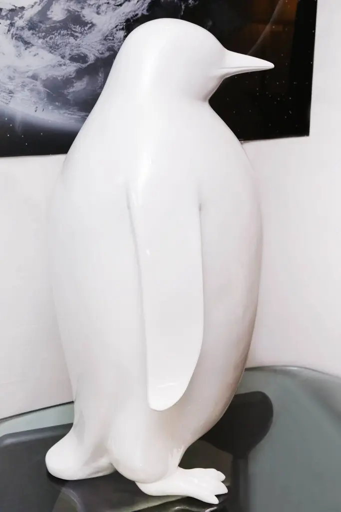 Sculpture of Emperor penguin in varnished whitelacquered resin.Created by David Rousselot – ParisTwo sizes available.Measures: Small model, L 50 x D 40 x H 85cm. Price: €4250.00Small model available now.Large model, L 70 x D 50 x H100cm. Price: €5250.00.Large model available under 4 weeks.