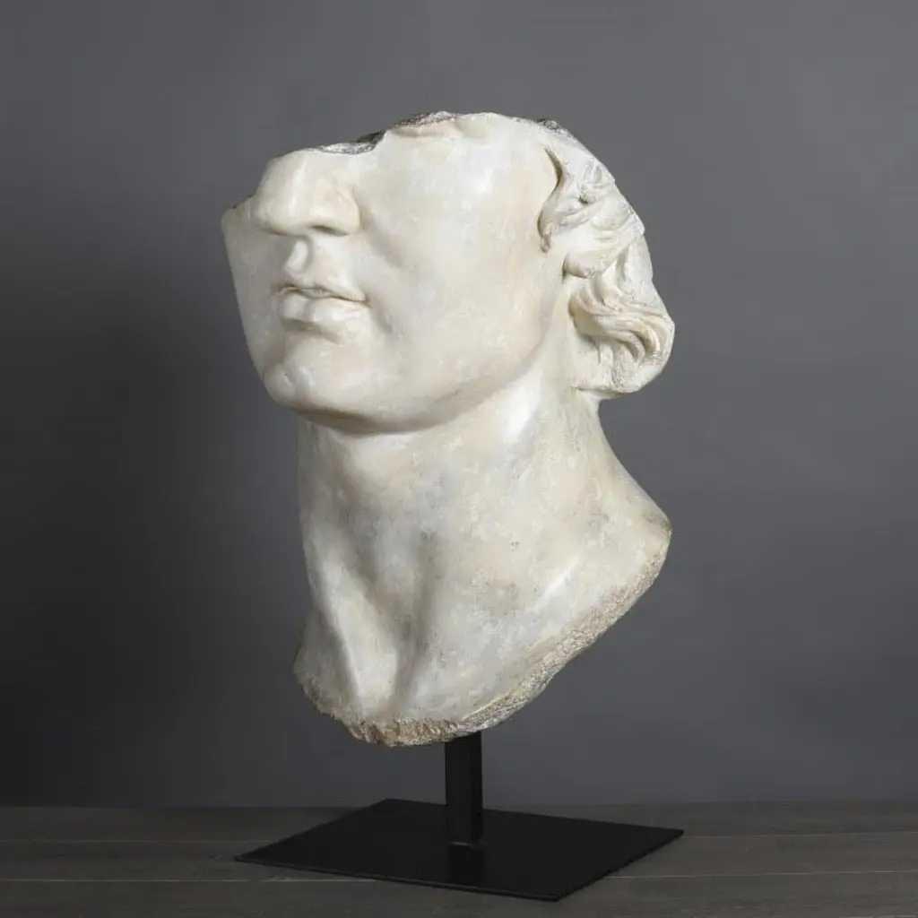 Sculpture of a head of Apollo in the Hellenistic style, 21st century.Sculpture on base of a head of Apollo, in patinated plaster and resin, 21st century.H: 65cm, W: 52cm, D: 50cm