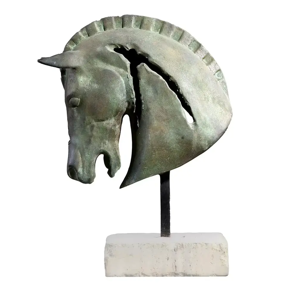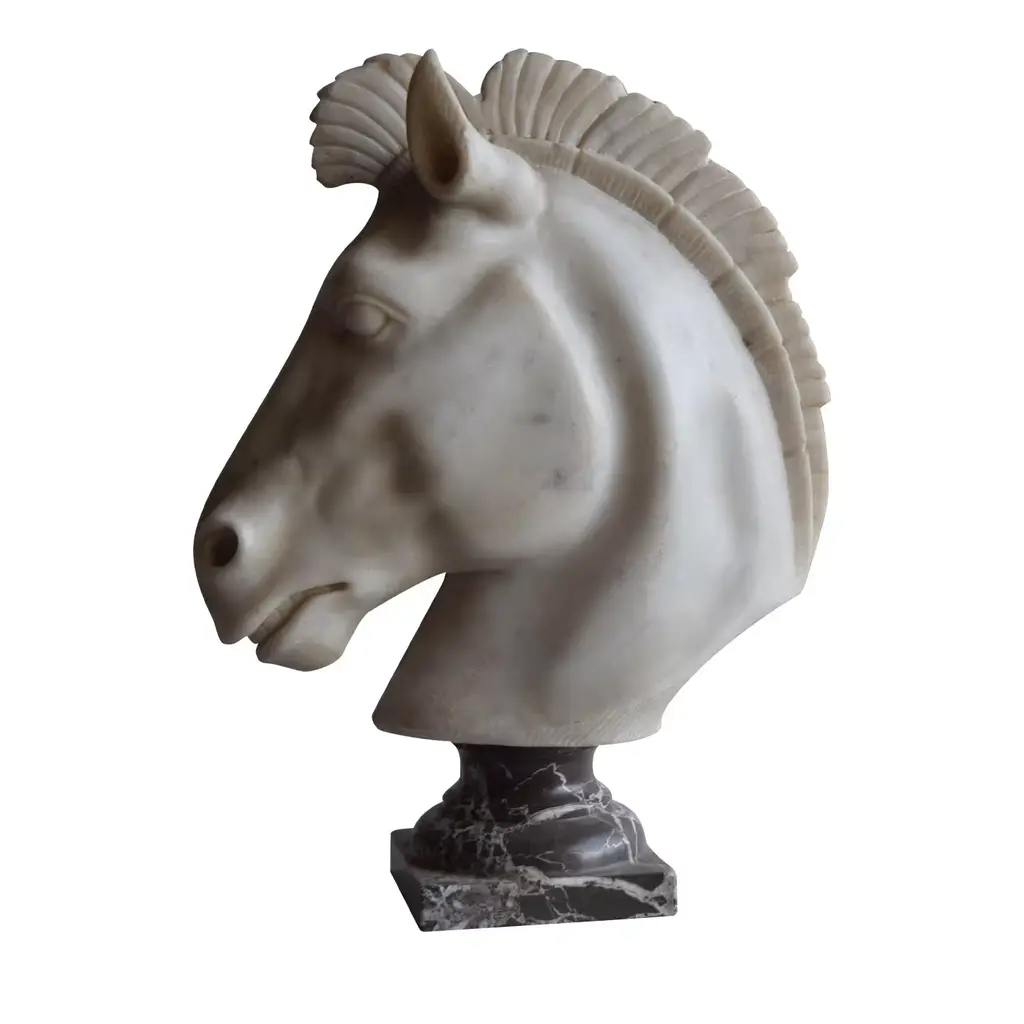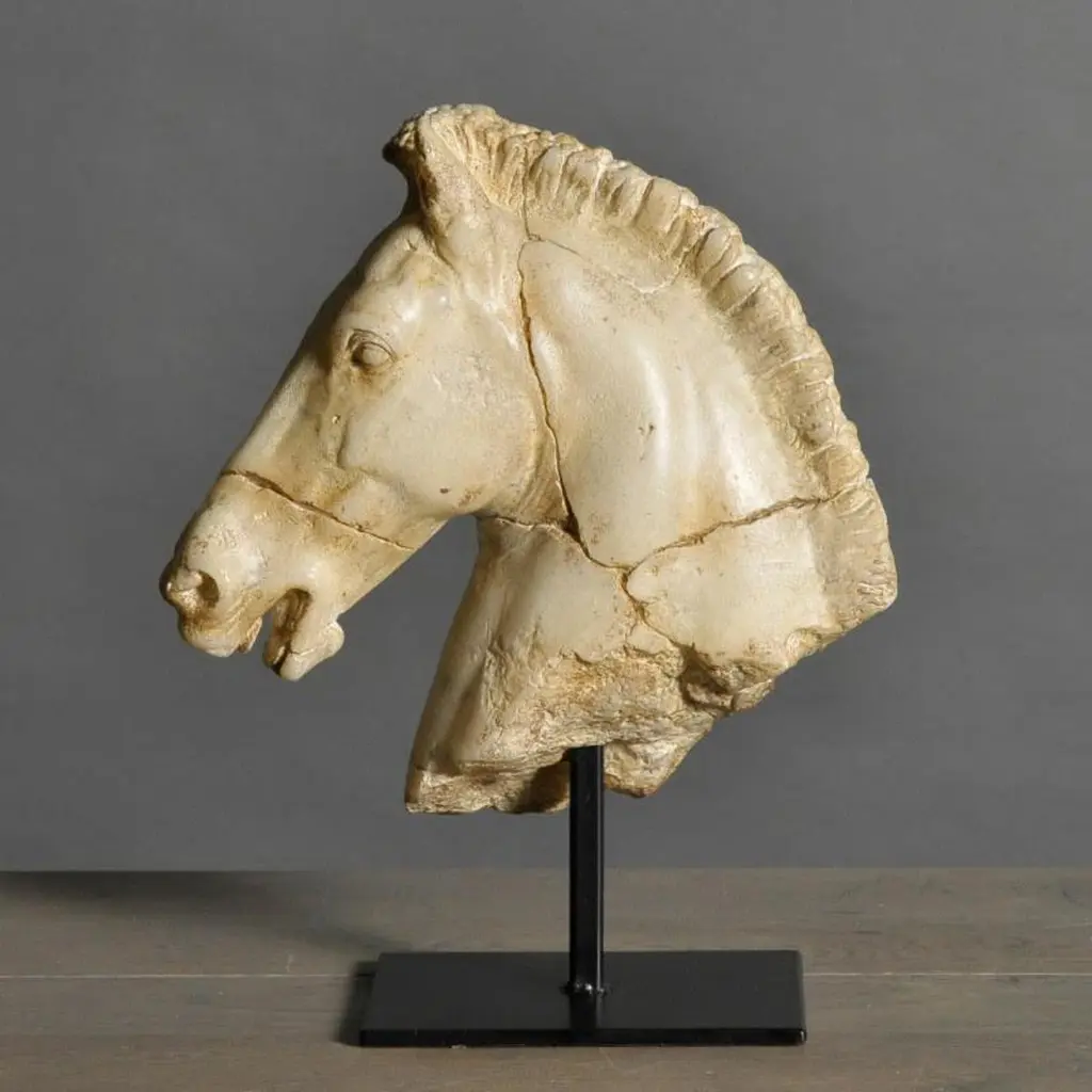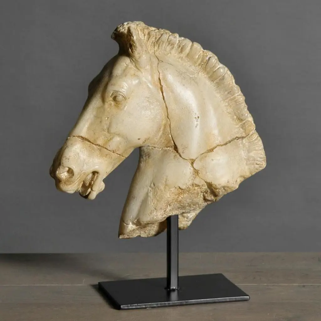 Sculpture of a white horse's head.This sculpture, taken from an original bronze statue created by Monti in the early 19th century, reveals all the animal's finesse and power.This handmade piece has been aged and patinated by hand.Material: Composite material, plaster, metal H: 28 cm, W: 22 cm, D: 9.5 cm Weight: 2 kg