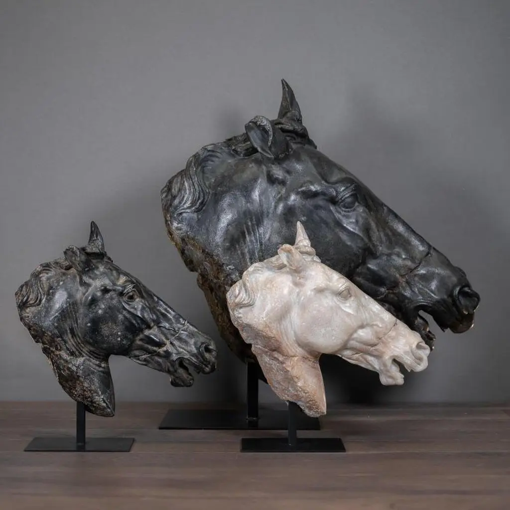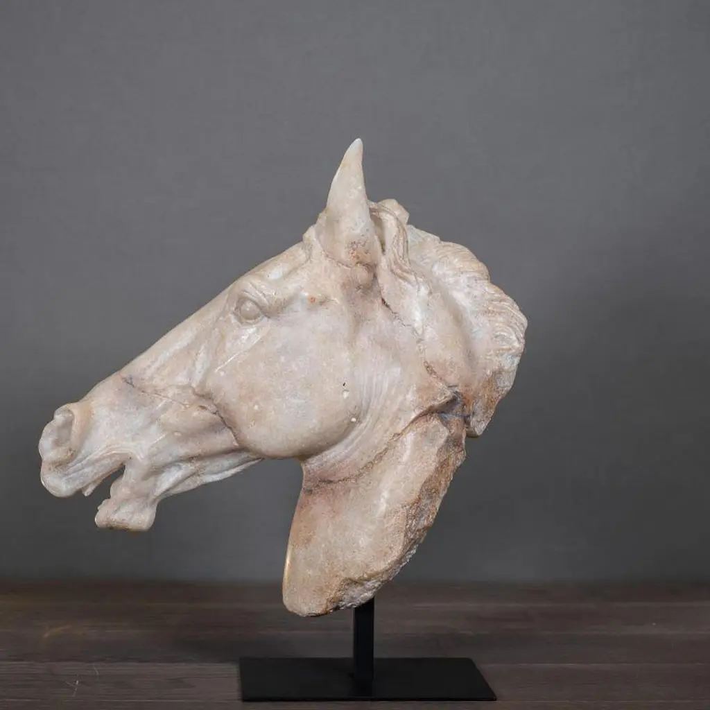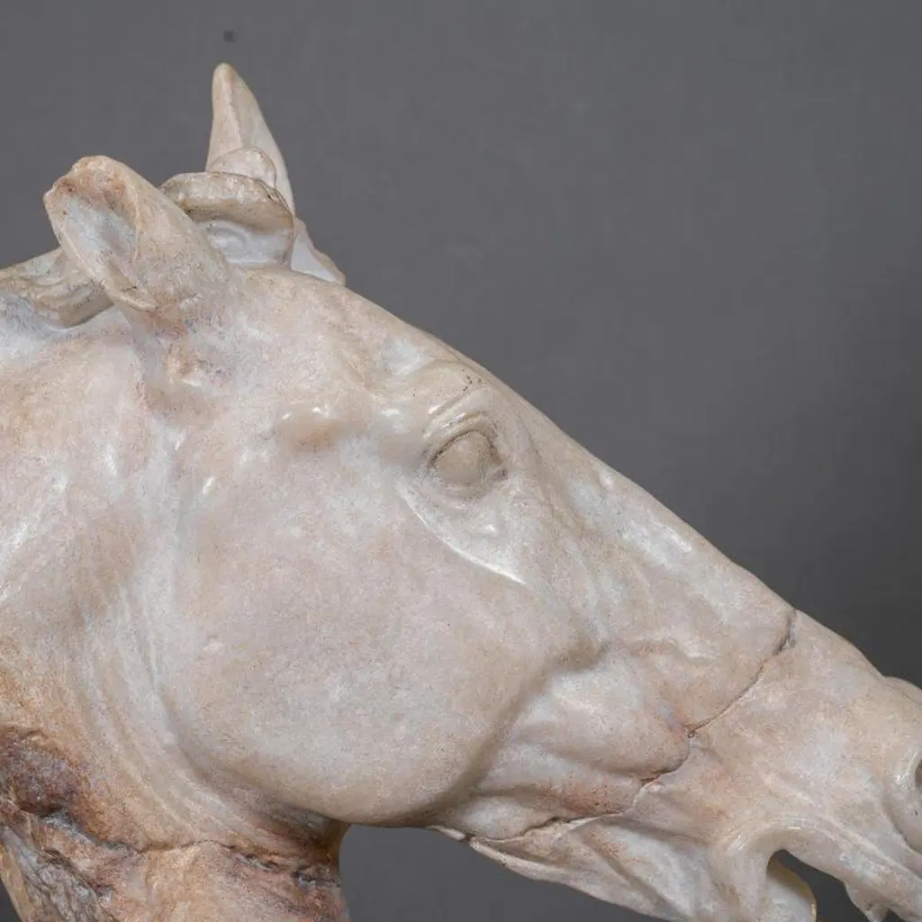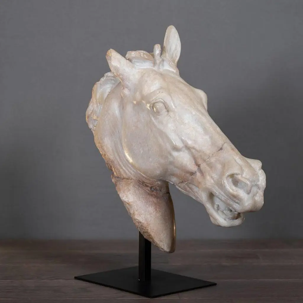 Sculpture of a white horse's head in composite material, metal base.Sculpture of a beautiful white horse's head, in resin and metal base, contemporary work.Material: Resin H: 43.5 cm, W: 38 cm, D: 15 cm Weight: 4.9 kg