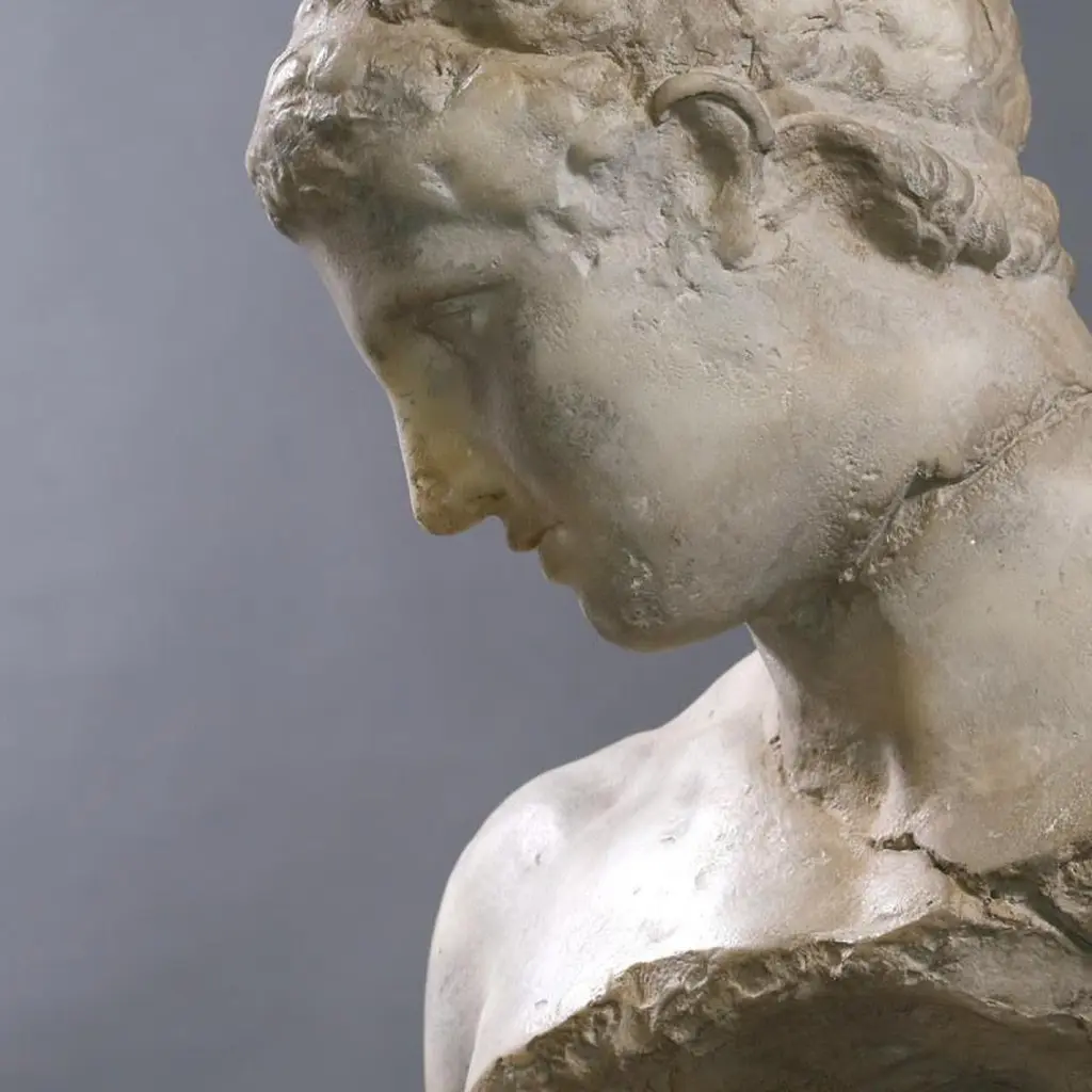 Sculpture representing the bust of a Greek sportsman in the Hellenistic period, 21st century.Sculpture on base of a bust of a Greek sportsman, in patinated plaster and resin, 21st century, model of the Musée du Louvres, Paris.H: 53cm, W: 41cm, D: 22cm