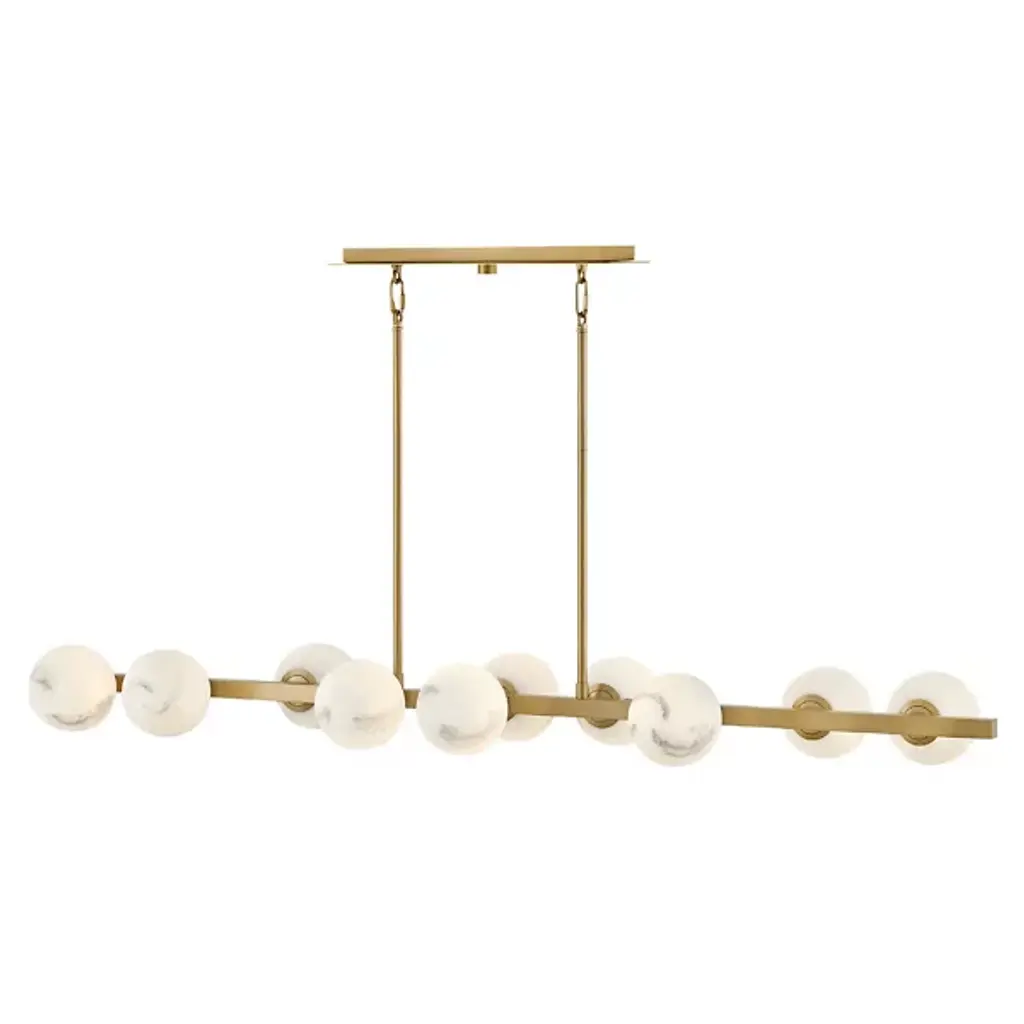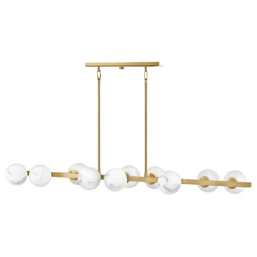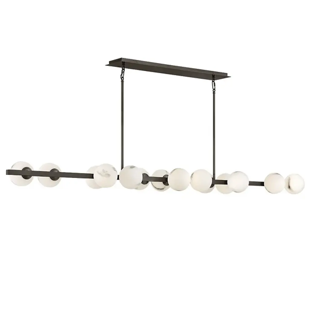 The Selene Linear Suspension from Hinkley is a radiant combination of form and function. Crafted from robust steel, this suspension features swirled glass shades that evoke a captivating mid-century modern aesthetic. The candelabra base LEDs within the shades emit a warm and inviting glow, creating a well-lit ambiance. Secured by sleek downrods attached to a ceiling canopy, Selene offers a beautiful presentation. With dimmable capabilities, when used with an ELV dimmer, you can adjust the lighting as needed.