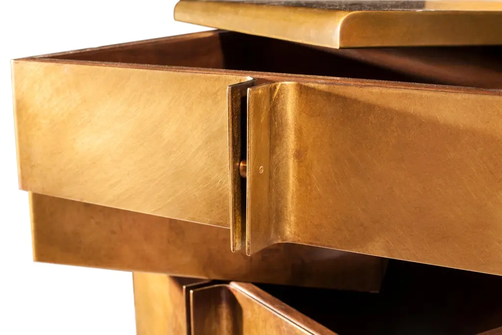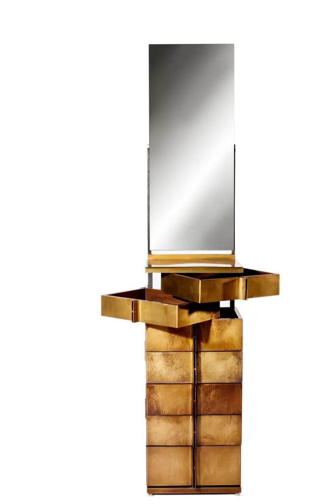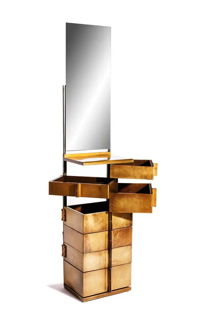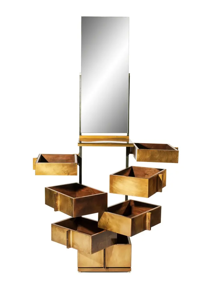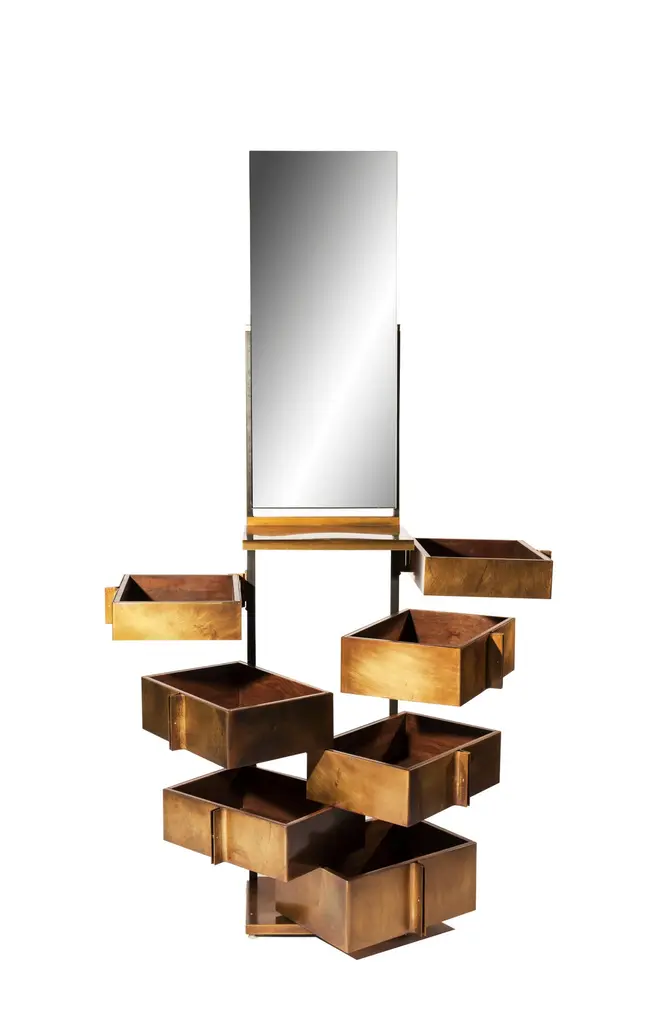 Semainier brass and walnut dresser by Gentner DesignDimensions: D 35.5 x W 45.7 x H 218 cmMaterials: patinated brass, walnut woodA modern take on a semainier, complete with vanity mirror and nine variable depth drawers, provides ample storage for all things. The top drawer, conveniently slim, is the ideal space for watches, ties or jewelry. Different from traditional cabinets and dressers, each individual brass wrapped wooden drawer rotates open on a single hinge. Through its materials and design, the Semainier transforms the classic french semainier into an innovative, practical, and stylishly modern necessity. Made of walnut and patinated brass, Gentner’s modern semainier is completely handcrafted in Chicago.Gentner DesignRooted in a language of sculpture, character defining details, and world renowned craftsmanship, the work is found at the crossroads of design and art.Established in 2011, the namesake furniture label is a rare combination of aesthetic dexterity and mastery of craft resulting in furniture and objects that are expressive, formal, and transcend materiality.The collection is based in metal and incorporates only natural materials such as leather, wood, and glass in unique ways, challenging our assumptions.Christopher GentnerChristopher Gentner, with a BFA in metalsmithing from the Cleveland Institute of Art and apprenticeships under sculptors and jewelers, together with dedication to craft, quickly developed his reputation nationally as a foremost authority of metal fabrication and furniture.One of his crowning achievements was the re-creation and fabrication of the Frank Lloyd Wright Robie House gates.These unique experiences are the foundation of his design philosophy which he employs in his own line of furniture, lighting, and objects.