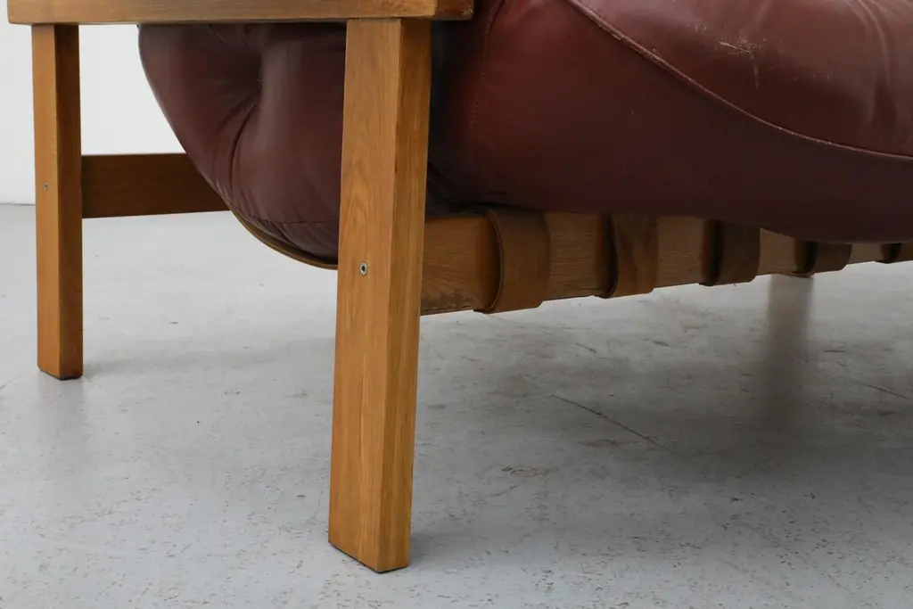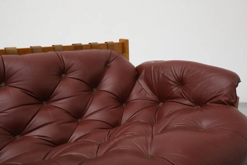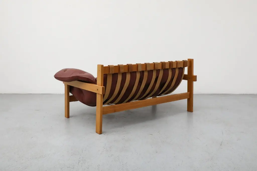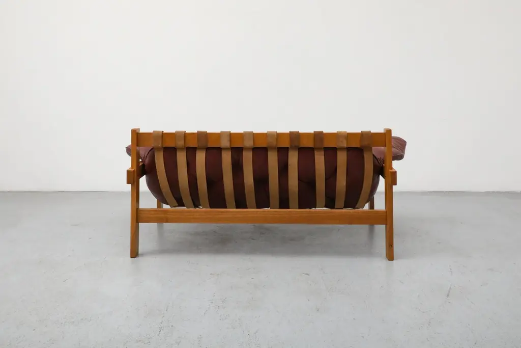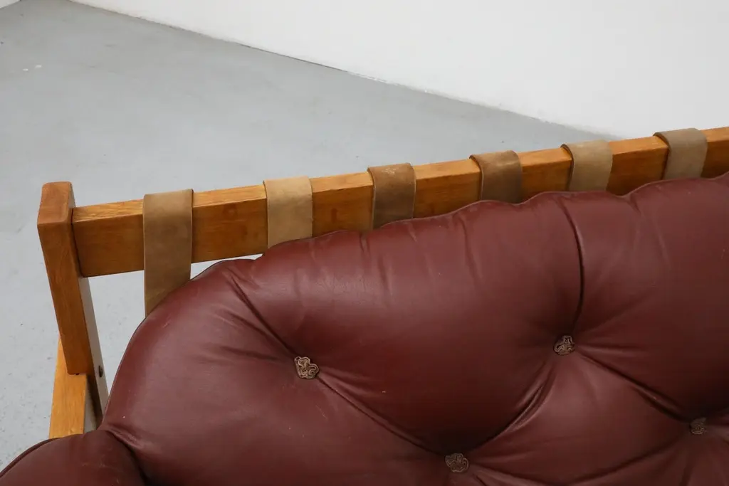 Sculptural 1970s loveseat produced by Hungarian manufacturer Ipoly and reflects the enduring influence of Brazilian designer Sergio Rodrigues. With a solid oak frame and thick leather strap supports, the piece showcases the robust construction and warm materiality that define the Brazilian modernist aesthetic.Featuring tufted burgundy leather cushions, brown leather piping and florette buttons—an elegant, handcrafted detail that adds texture and dimension. Designed to balance comfort and structure, the floating seat cushion rests securely within the open oak frame.In original vintage condition with visible wear consistent with age and use. Ivory version available (LU922445817012)Matching lounge chairs also available (LU922445609232) and listed separately.