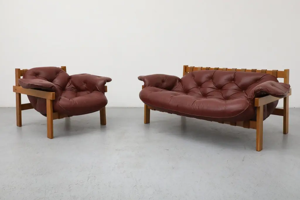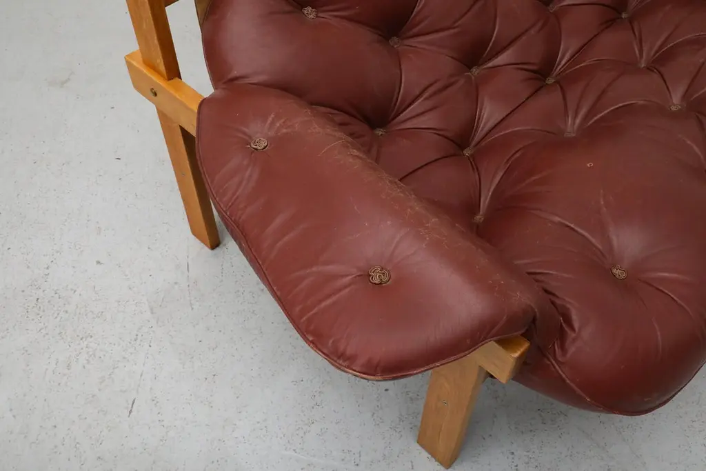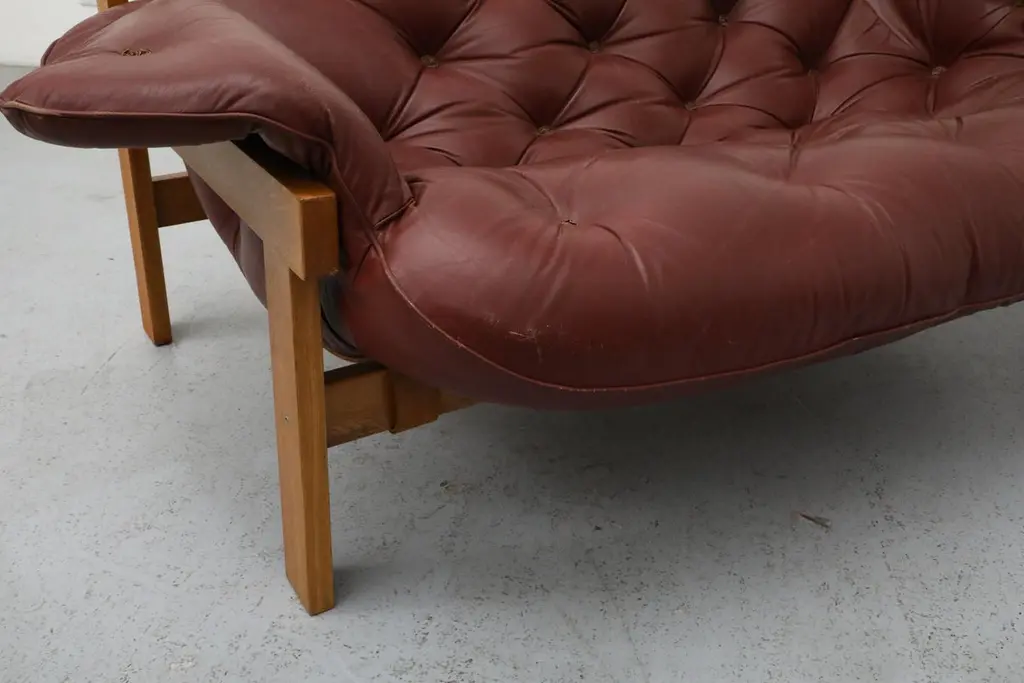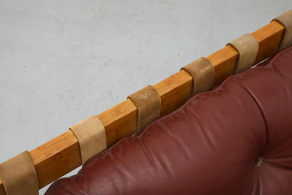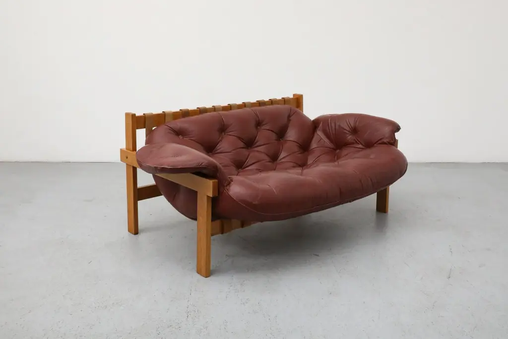Sculptural 1970s loveseat produced by Hungarian manufacturer Ipoly and reflects the enduring influence of Brazilian designer Sergio Rodrigues. With a solid oak frame and thick leather strap supports, the piece showcases the robust construction and warm materiality that define the Brazilian modernist aesthetic.Featuring tufted burgundy leather cushions, brown leather piping and florette buttons—an elegant, handcrafted detail that adds texture and dimension. Designed to balance comfort and structure, the floating seat cushion rests securely within the open oak frame.In original vintage condition with visible wear consistent with age and use. Ivory version available (LU922445817012)Matching lounge chairs also available (LU922445609232) and listed separately.