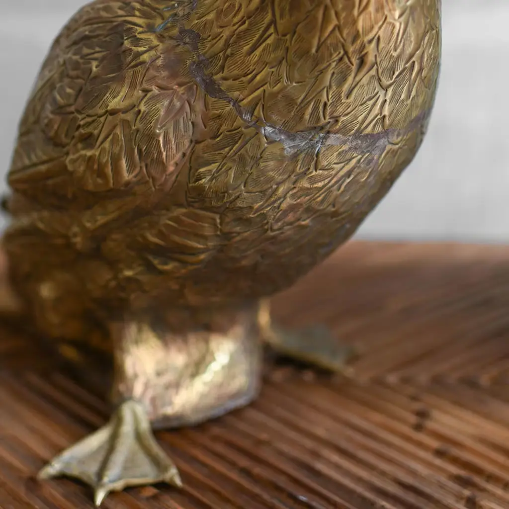 Experience the elegance of handcrafted artistry with this exquisite set of two brass duck sculptures. Each piece is meticulously crafted using the traditional techniques of embossing and hand-chasing, resulting in remarkable texture and intricate detailing. The outstanding craftsmanship highlights lifelike features, capturing the natural beauty and character of these charming creatures. The careful hammering and engraving processes create depth in the design, enhancing the visual appeal of the feathers and form. Each figurine is uniquely stamped with the Molto Collectibles mark, ensuring authenticity and quality.