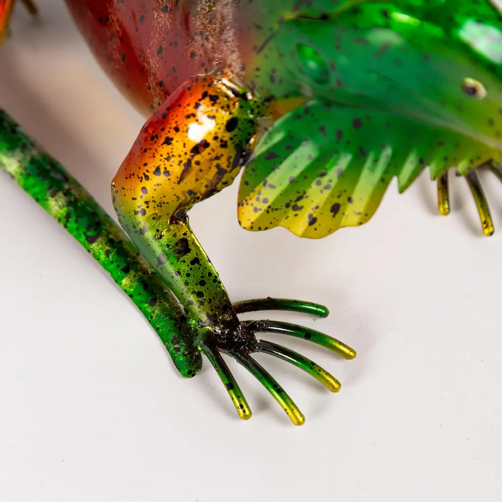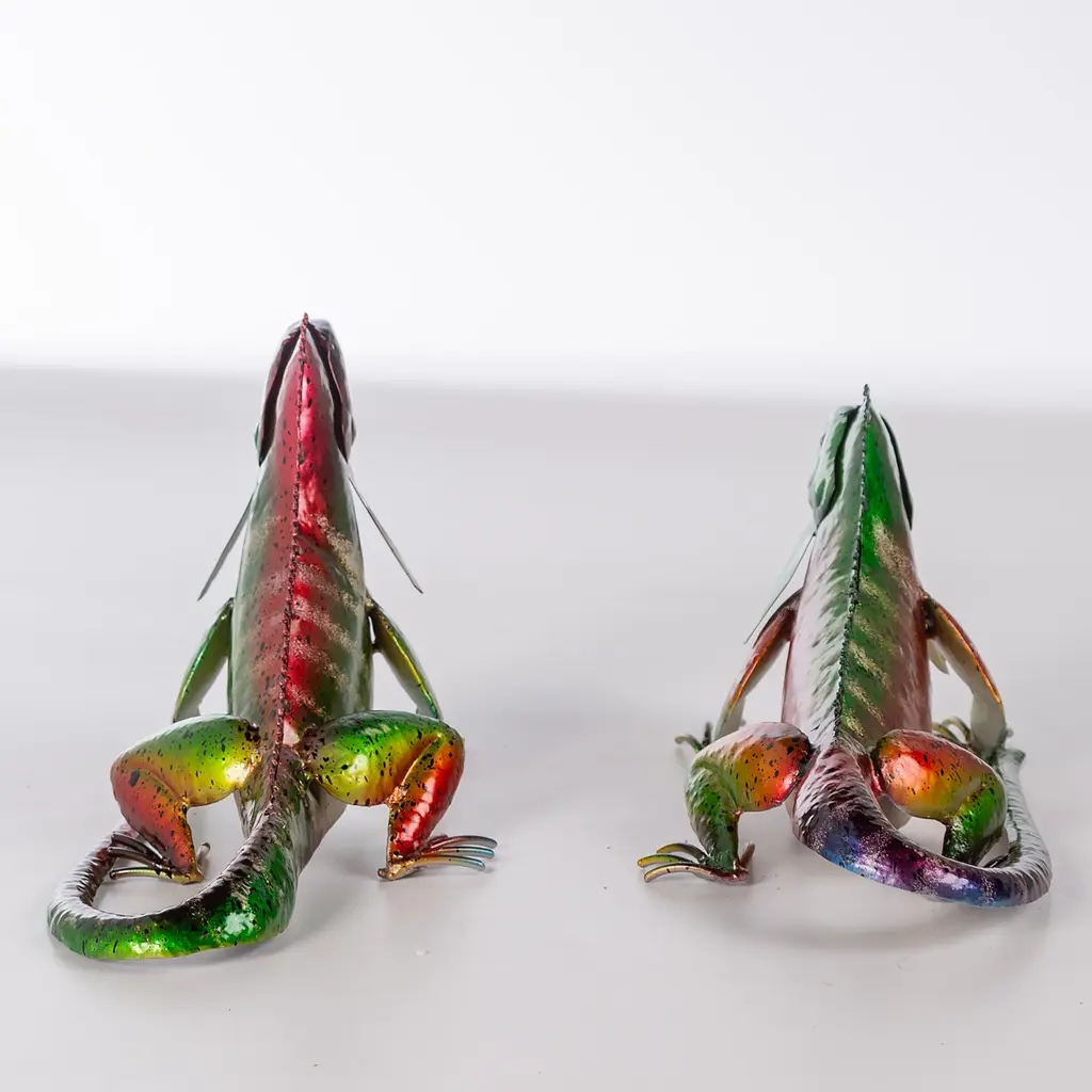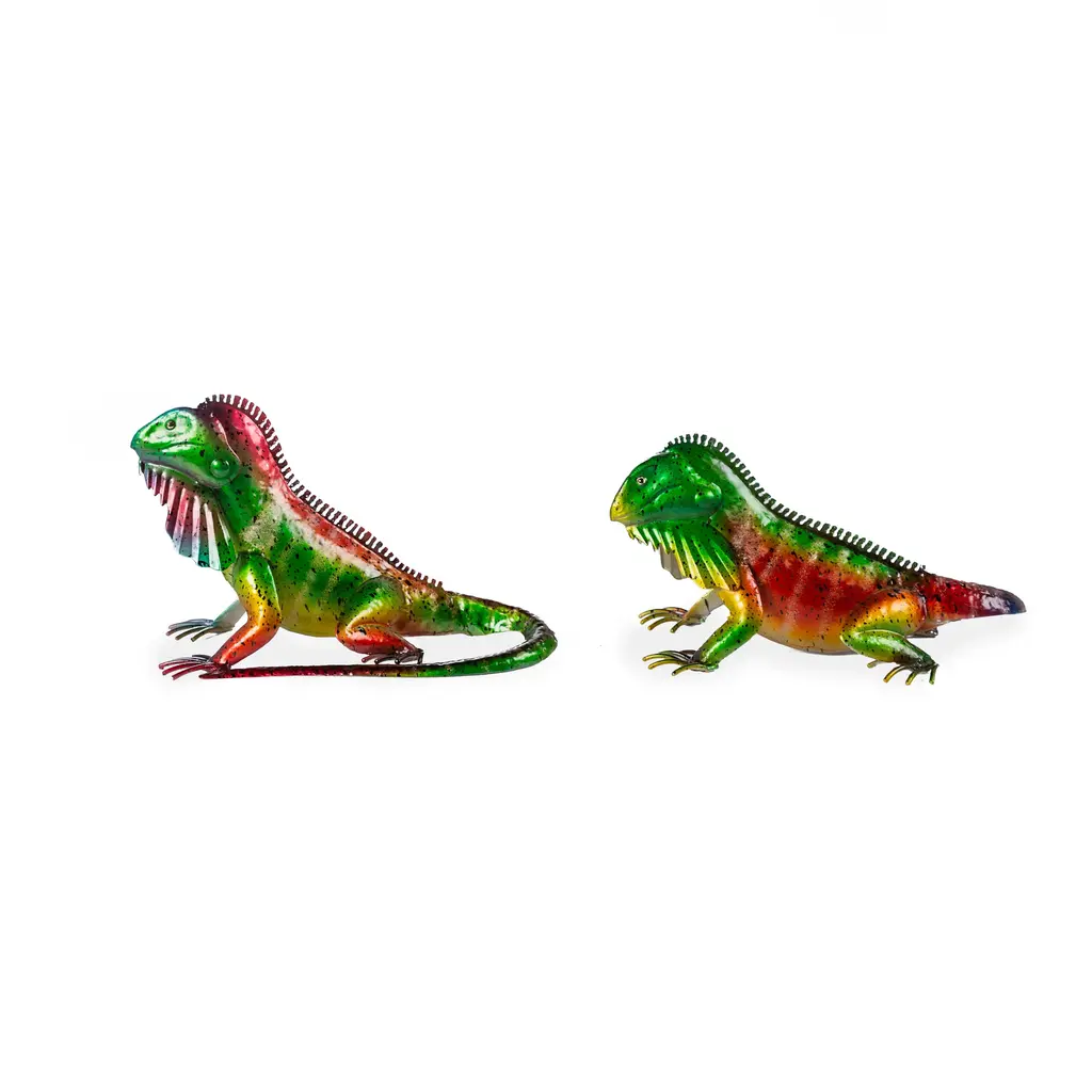 Did you know a group of iguanas is called a mess? These Colorful Iguana Garden Statues seem to be telling us that a little mess in your garden can still be beautiful! This eye-catching pair is handcrafted from reclaimed metal by our skilled artisan partners in Bali, Indonesia. The iguanas are then hand-painted in shimmering neon colors, ensuring they are ready to stand out among your plants or other decor. You will love the charming details of this pair from the rainbow of colors to the curling tails and spikes on each of their backs. Add some pizzaz to your space with these reptile friends! Wind & Weather Exclusive Design.
