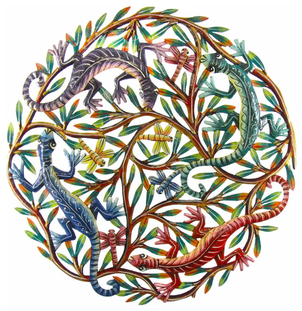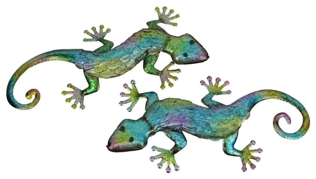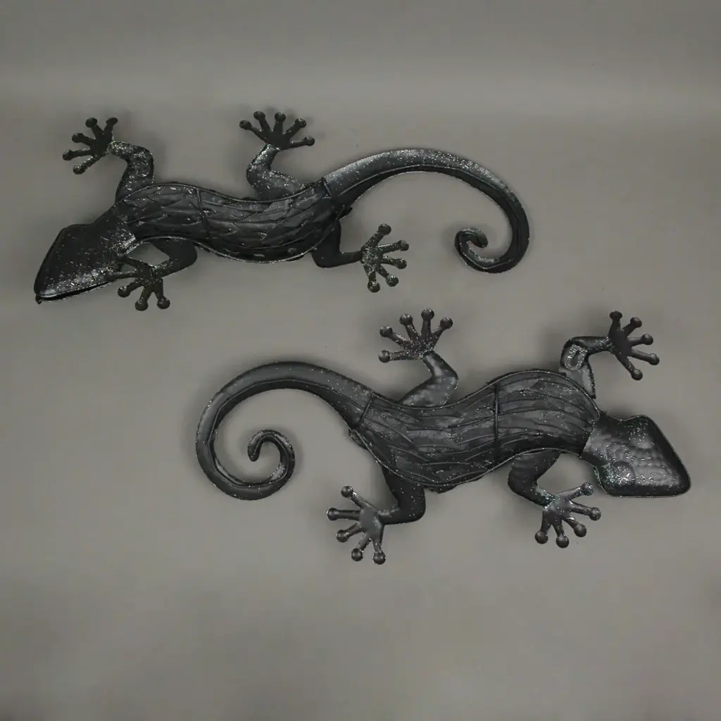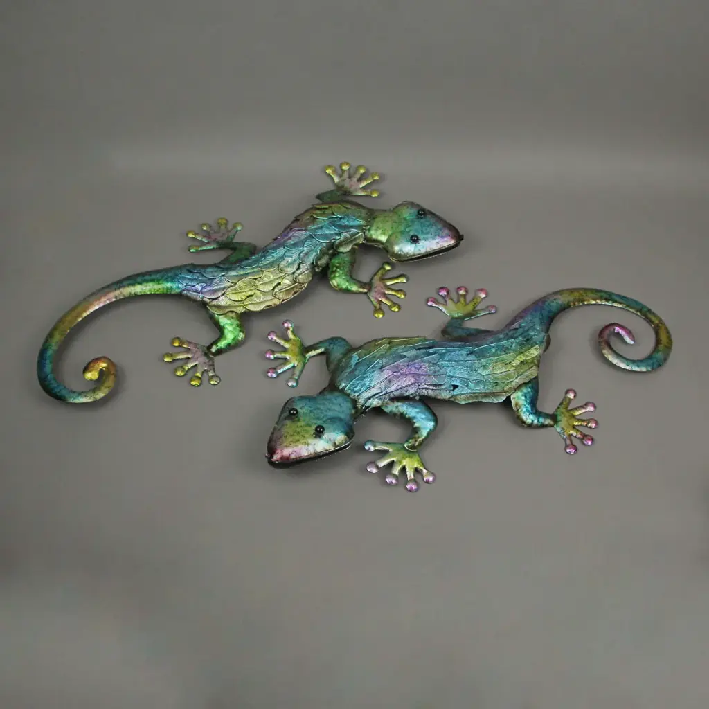 Overall Size - These vibrant sculptures are substantial, each standing 19.25 inches high, stretching 15 inches long, and boasting a thickness of 2 inches.Durable Material - Crafted from high-quality metal, these lizards ensure years of maintenance-free display, resistant to weather and wear.Unique Finish - Each piece is a testament to craftsmanship, hand-painted in a lively palette of metallic blues, greens, yellows, oranges, and purples.Easy To Install - Equipped with keyhole hangers on the back, mounting these gecko lizard sculptures is a breeze, adding instant artistry to your space.Great Gift - Whether for yourself or loved ones, these colorful lizard wall décor pieces make an excellent gift, bringing tropical charm indoors or enhancing your outdoor ambiance.Elevate your wall decor with this captivating set of stamped metal gecko lizard sculptures. Radiating with vibrant metallic hues in blue, green, yellow, orange, and purple, each lizard is a hand-painted masterpiece. Mounted with keyhole hangers, these 19.25-inch high, 15-inch long, and 2-inch thick lizards effortlessly bring a burst of tropical charm to your space. Crafted with meticulous detail, these wall sculptures showcase opposite-facing geckos, creating a dynamic visual impact. The stamped metal design adds depth and texture, enhancing the overall aesthetic appeal. Their lively colors and intricate patterns make them a perfect addition to any indoor or outdoor setting. Hang them on your garden fence, adorn the walls of your patio, or enhance the appeal of your living room"”these gecko lizard sculptures offer versatile decorative possibilities. The set encapsulates the spirit of the tropics, introducing a playful and lively atmosphere to your home. Designed for easy installation, the keyhole hangers ensure a secure and straightforward mounting process. Whether you''re a lover of nature-inspired decor or seeking a unique accent to enliven your space, this pair of gecko lizards promises to infuse your surroundings with energy and style. Transform your walls into a canvas of vibrant art with these eye-catching and brilliantly colored metal sculptures.