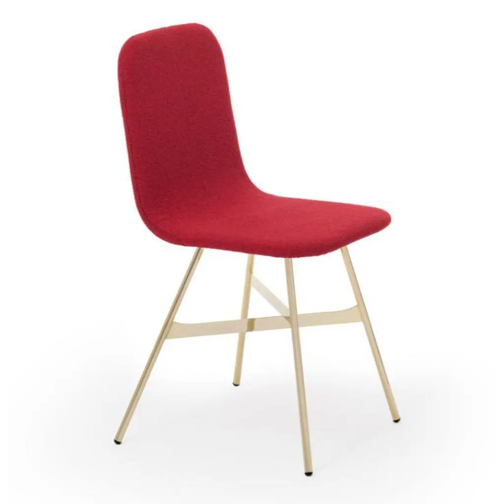 Set of 2, tria gold upholstered, Chili by Colé Italia with Lorenz & KazDimensions: H 82.5, D 52, W 58 cmMaterials: Plywood Chair; Golden Metal Legs, Upholstered Fabric CAlso Available: Tria; 3 Legs, with Cushion, Black, Gold, Simple, Stool, Upholstered,TC: C.O.M. fabric - send us your own materialCA: Cat A - Angel (polypropylene), Ganesha (synt. leather), Nord Wool (felt)CB: Cat B - Tiffany (polyestere), Lana (aquaclean)CC: Cat C - Velvetforthy (Velvet), Topia (wool), Novum (Wool), Opera (felt)CP: Cat P - Milano (full grain leather)H.82,5 D.52 W.61 Weight 6 kg Box 2pc: 16 kg Vol 0,36 mcFabrics: see fabric samples catalogueOur iconic chair designed by German duo Lorenz + Kaz. Tria is a table chair, at the same time many people place it asa sculpture, as ornament in an entrance, a bedroom or in a living room. It recalls the impossible forms of Dutch graphicartist and engraver Maurits Escher, defining itself in a game of twists and elusive leak. The corolla-shaped shell can beused in two different seating positions, center or side, in this case with one armrest. The shell is composed of three equal elements in bent plywood assembled together and veneered with a special wood finishing ivory/ black stripes.It is also available in veneered oak, natural or stained open pore in different colors, as well as customized colors (min. 4units). Available with 3 or 4 solid wood legs, or 4 metal legs in different finishings. For a better back comfort if you useTria chair in center position, for dining or studying, you can add a back cushion specially designed for it, upholsteredand coated with a wide range of fabrics.Colé is a young Italian design brand, with a high-end production 100% made in Italy. Born from the experience of Matteo De Ponti, architect, who grew up in one of the most outstanding Milanese design families, and the artistic sensibility of Laura Macagno, degree in Economics and passionate of art and design. Our mission is to create design icons, beautiful and comfortable pieces that can stand the test of time, furnishing houses of international and sophisticated clients, and realized with craftsmanship, thus unique. “We love objects which own deep roots, excellent quality, and a strong evocative power. Archetypal forms dressed with new beauty without losing their classical composure”.Our expressive research is inspired by the utopian force of Italian eminences grises architects and designers of the ’50s, the Scandinavian design, the Bauhaus, ethnic handcraft and houses of famous writers of the XX century, all different as a style but united by the intense soul of those who worked and lived there.