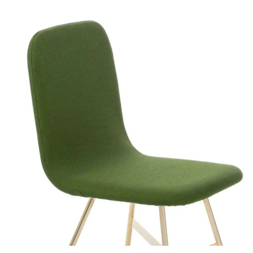 Set of 2, tria gold upholstered, Palm by Colé Italia with Lorenz & KazDimensions: H 82.5, D 52, W 58 cmMaterials: plywood chair; golden metal legs, upholstered fabric CAlso available: tria; 3 legs, with cushion, black, gold, simple, stool, upholstered.TC: C.O.M. fabric - send us your own materialCA: Cat A - Angel (polypropylene), Ganesha (synt. leather), Nord Wool (felt)CB: Cat B - Tiffany (polyestere), Lana (aquaclean)CC: Cat C - Velvetforthy (Velvet), Topia (wool), Novum (Wool), Opera (felt)CP: Cat P - Milano (full grain leather)H.82,5 D.52 W.61 Weight 6 kg Box 2pc: 16 kg Vol 0,36 mcFabrics: see fabric samples catalogueOur iconic chair designed by German duo Lorenz + Kaz. Tria is a table chair, at the same time many people place it asa sculpture, as ornament in an entrance, a bedroom or in a living room. It recalls the impossible forms of Dutch graphicartist and engraver Maurits Escher, defining itself in a game of twists and elusive leak. The corolla-shaped shell can beused in two different seating positions, center or side, in this case with one armrest. The shell is composed of three equal elements in bent plywood assembled together and veneered with a special wood finishing ivory/ black stripes.It is also available in veneered oak, natural or stained open pore in different colors, as well as customized colors (min. 4units). Available with 3 or 4 solid wood legs, or 4 metal legs in different finishings. For a better back comfort if you useTria chair in center position, for dining or studying, you can add a back cushion specially designed for it, upholsteredand coated with a wide range of fabrics.Colé is a young Italian design brand, with a high-end production 100% made in Italy. Born from the experience of Matteo De Ponti, architect, who grew up in one of the most outstanding Milanese design families, and the artistic sensibility of Laura Macagno, degree in Economics and passionate of art and design. Our mission is to create design icons, beautiful and comfortable pieces that can stand the test of time, furnishing houses of international and sophisticated clients, and realized with craftsmanship, thus unique. “We love objects which own deep roots, excellent quality, and a strong evocative power. Archetypal forms dressed with new beauty without losing their classical composure”.Our expressive research is inspired by the utopian force of Italian eminences grises architects and designers of the ’50s, the Scandinavian design, the Bauhaus, ethnic handcraft and houses of famous writers of the XX century, all different as a style but united by the intense soul of those who worked and lived there.