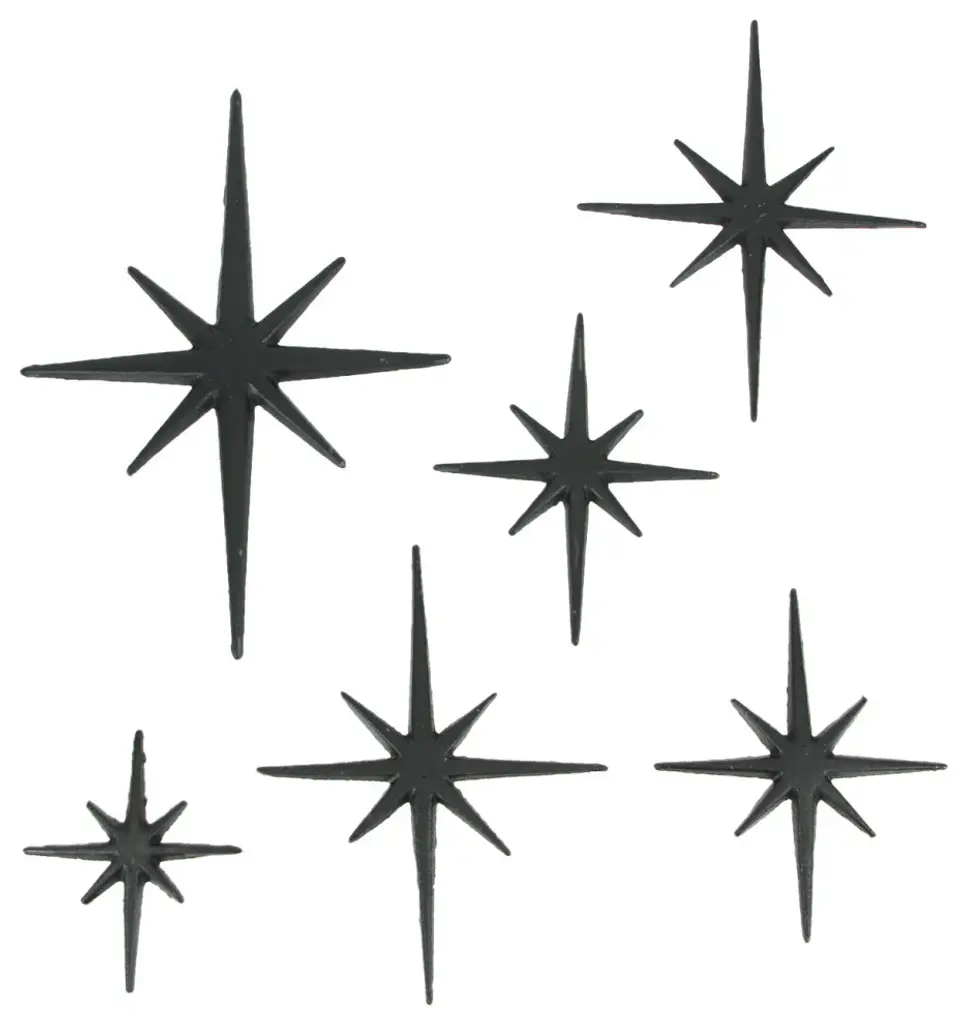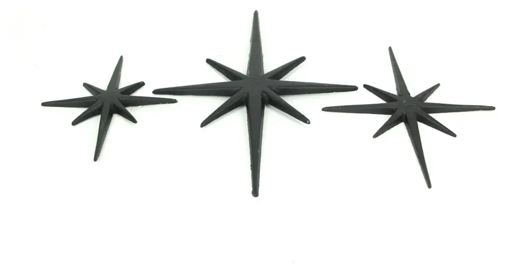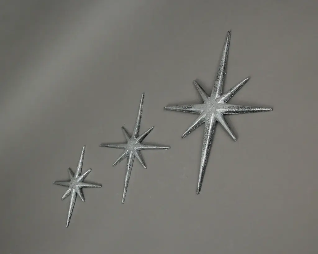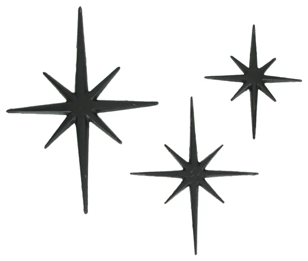 Versatile Sizing - These stars come in three sizes - Large (8.75 inch x0.25 inch x12 inch ), Medium (7 inch x0.25 inch x8.75 inch ), and Small (5.75 inch x0.25 inch x6.75 inch ). Their varied dimensions offer diverse decor possibilities, allowing you to customize your space with ease.Durable Craftsmanship - Crafted from sturdy cast iron, these stars ensure years of maintenance-free use and display. Their robust material guarantees longevity, making them a reliable choice for enhancing your decor without worrying about wear and tear.Vintage Appeal - The stars feature an antiqued matte black enamel coating, lending them a retro finish that exudes timeless charm. This aged look adds character to any setting, creating an ambiance that seamlessly blends the elegance of the past with contemporary design.Effortless Installation - Equipped with triangle loop hangers on their backs, these stars are exceptionally easy to mount. Their user-friendly design simplifies the hanging process, allowing you to adorn your walls effortlessly, transforming your space in no time.Perfect Gift Choice - These stars make a thoughtful gift for yourself, friends, and family. Their versatile charm and durable construction ensure they will be cherished for years to come. Whether enhancing your own home or gifting them to others, these stars are a delightful choice for any occasion.This trio of 8 pointed compass stars adds a wonderful Mid-Century modern touch to your indoor or outdoor decor. Crafted of cast iron, the stars feature a rustic black enamel finish to give them a great aged look. The large star measures 8.75 inches long, 0.25 inches wide, and 12 inches high; the medium star measures 7 inches long, 0.25 inches wide, and 8.75 inches high; and the small star measures 5.75 inches long, 0.25 inches wide, and 6.75 inches high. Hang them together or separately for a perfect accent to any vintage, beach, or nautical-themed room.