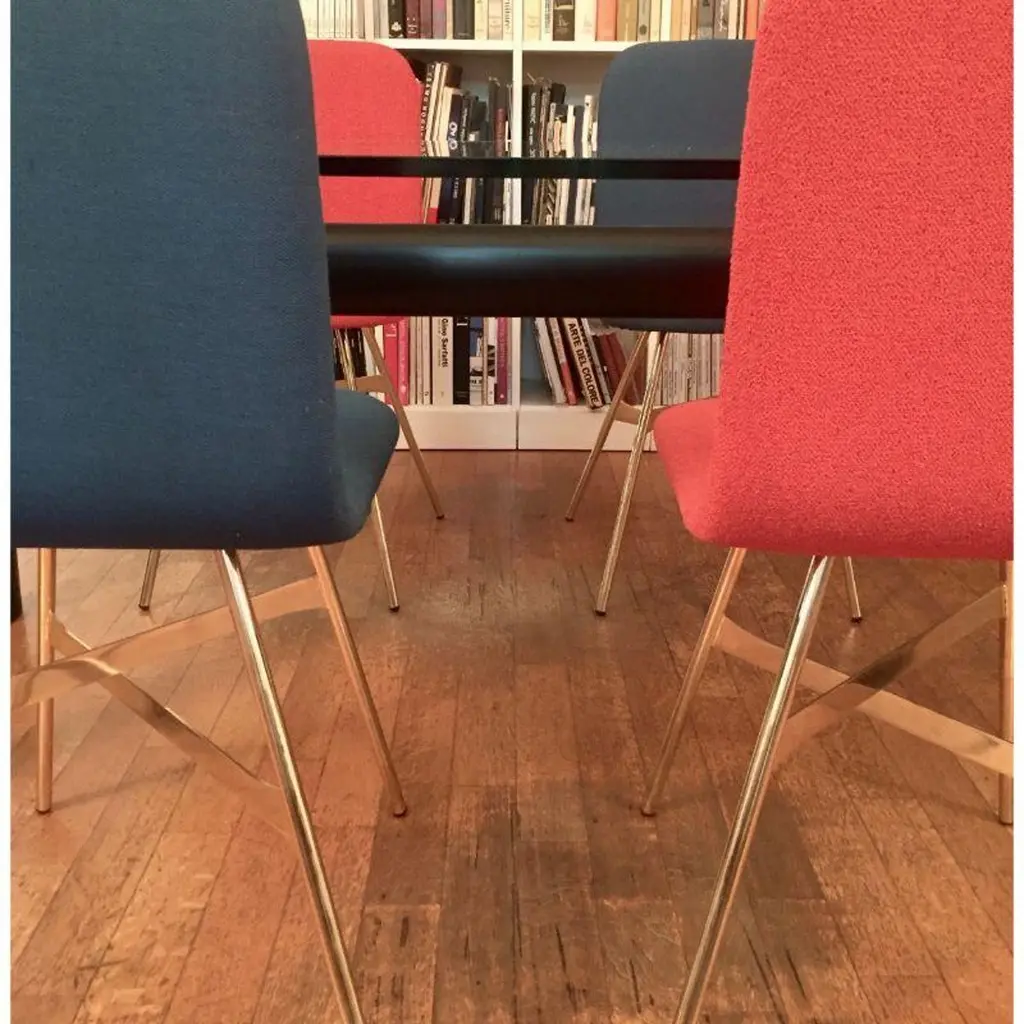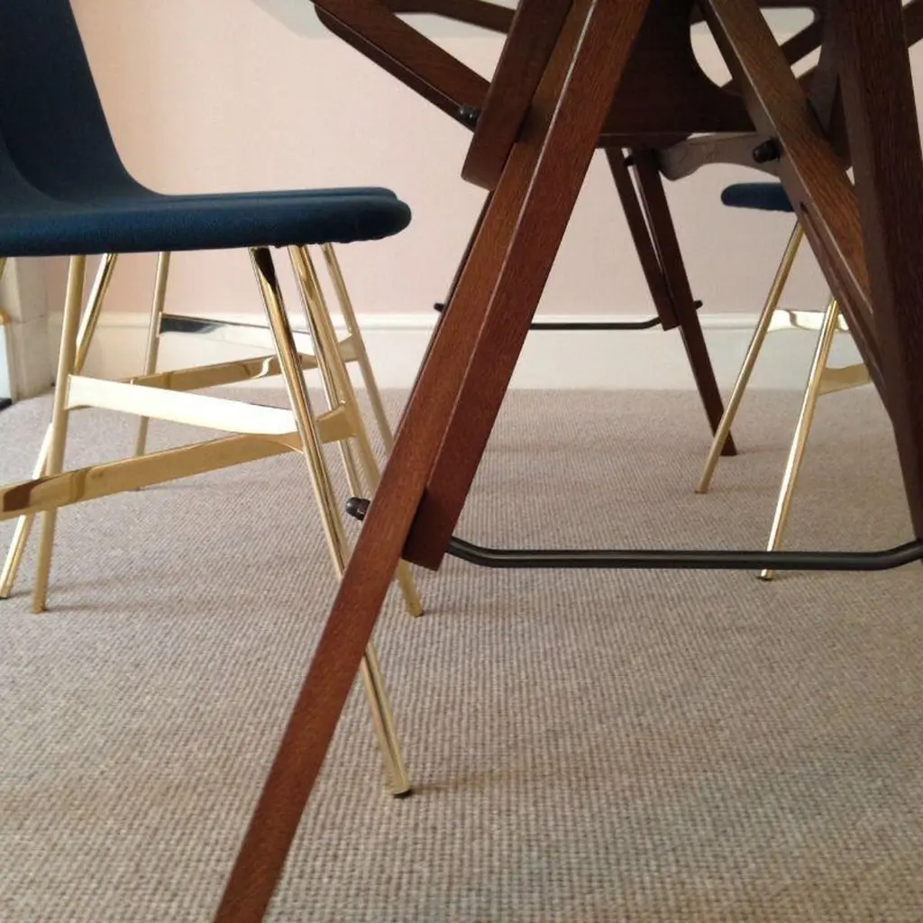 Set of 4, tria gold upholstered, Antrazite by Colé Italia with Lorenz & KazDimensions: H 82.5, D 52, W 58 cmMaterials: Plywood Chair; Golden Metal Legs, Upholstered Fabric CAlso Available: Tria; 3 Legs, with Cushion, Black, Gold, Simple, Stool, Upholstered,TC: C.O.M. fabric - send us your own materialCA: Cat A - Angel (polypropylene), Ganesha (synt. leather), Nord Wool (felt)CB: Cat B - Tiffany (polyestere), Lana (aquaclean)CC: Cat C - Velvetforthy (Velvet), Topia (wool), Novum (Wool), Opera (felt)CP: Cat P - Milano (full grain leather)H.82,5 D.52 W.61 Weight 6 kg Box 2pc: 16 kg Vol 0,36 mcFabrics: see fabric samples catalogueOur iconic chair designed by German duo Lorenz + Kaz. Tria is a table chair, at the same time many people place it asa sculpture, as ornament in an entrance, a bedroom or in a living room. It recalls the impossible forms of Dutch graphicartist and engraver Maurits Escher, defining itself in a game of twists and elusive leak. The corolla-shaped shell can beused in two different seating positions, center or side, in this case with one armrest. The shell is composed of three equal elements in bent plywood assembled together and veneered with a special wood finishing ivory/ black stripes.It is also available in veneered oak, natural or stained open pore in different colors, as well as customized colors (min. 4units). Available with 3 or 4 solid wood legs, or 4 metal legs in different finishings. For a better back comfort if you useTria chair in center position, for dining or studying, you can add a back cushion specially designed for it, upholsteredand coated with a wide range of fabrics.Colé is a young Italian design brand, with a high-end production 100% made in Italy. Born from the experience of Matteo De Ponti, architect, who grew up in one of the most outstanding Milanese design families, and the artistic sensibility of Laura Macagno, degree in Economics and passionate of art and design. Our mission is to create design icons, beautiful and comfortable pieces that can stand the test of time, furnishing houses of international and sophisticated clients, and realized with craftsmanship, thus unique. “We love objects which own deep roots, excellent quality, and a strong evocative power. Archetypal forms dressed with new beauty without losing their classical composure”.Our expressive research is inspired by the utopian force of Italian eminences grises architects and designers of the ’50s, the Scandinavian design, the Bauhaus, ethnic handcraft and houses of famous writers of the XX century, all different as a style but united by the intense soul of those who worked and lived there.