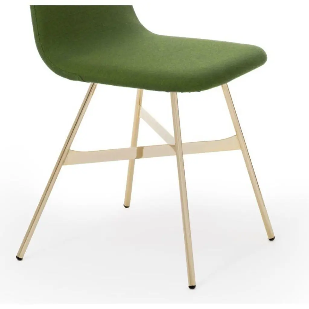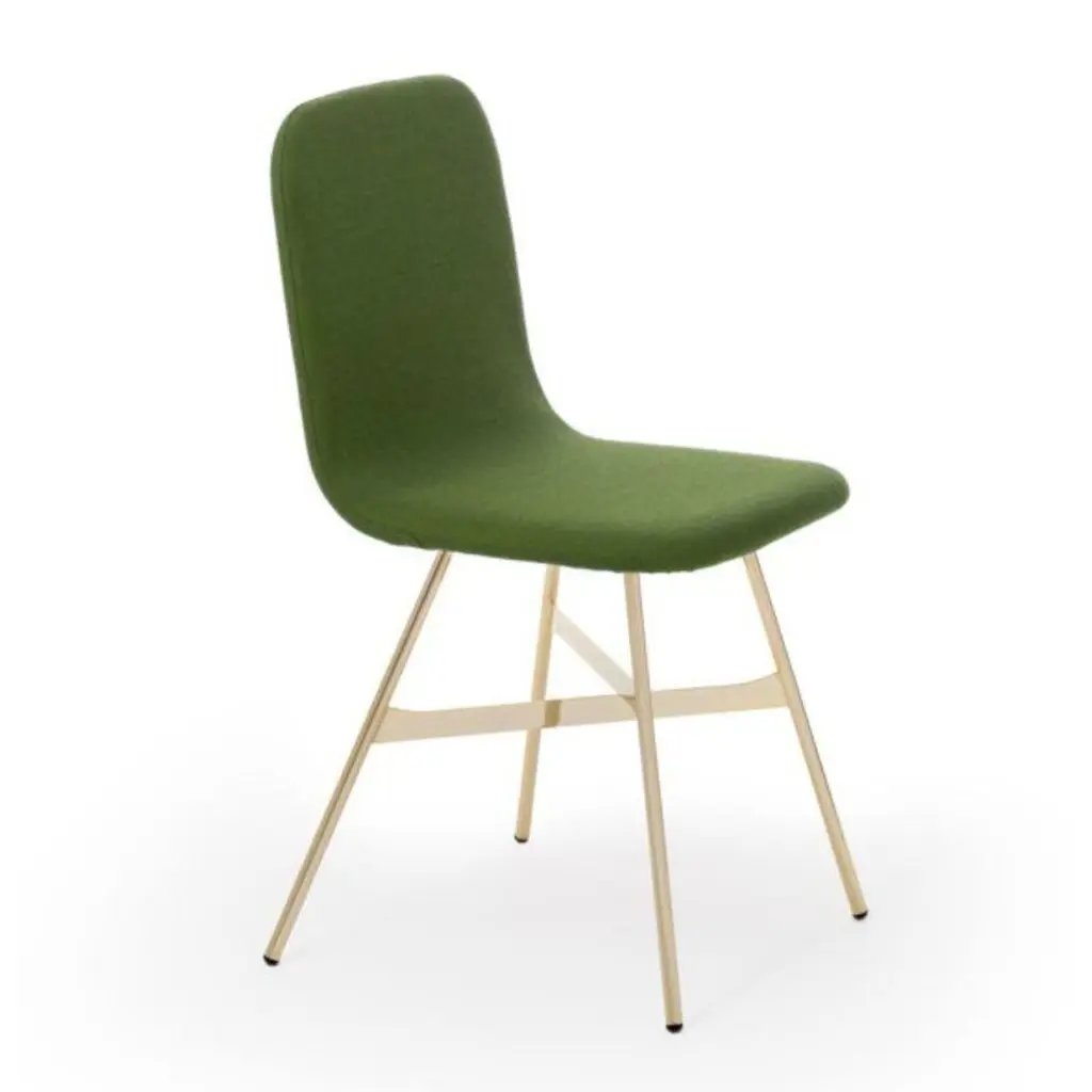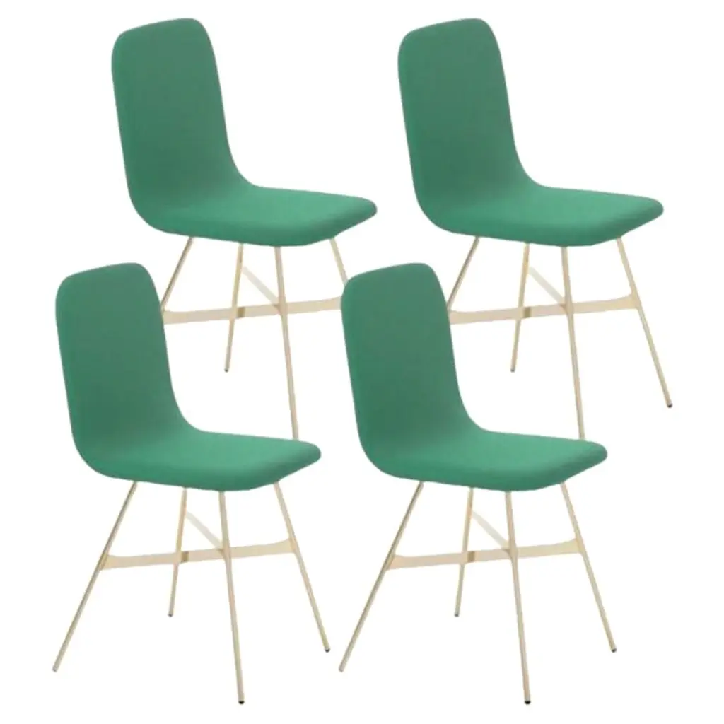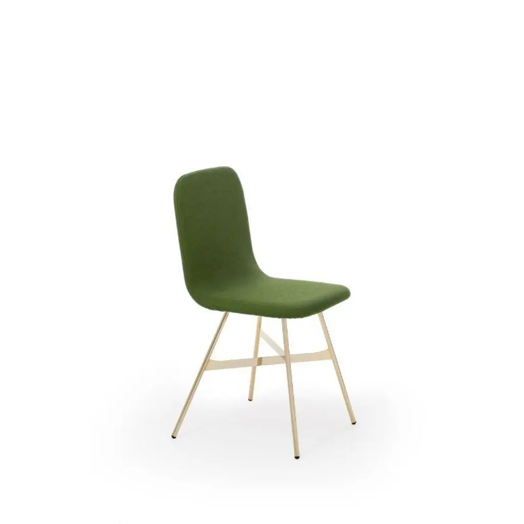 Set of 4, Tria gold upholstered, palm by Colé Italia with Lorenz & KazDimensions: H 82.5, D 52, W 58 cmMaterials: plywood chair; golden metal legs, upholstered fabric CAlso available: tria; 3 legs, with cushion, black, gold, simple, stool, upholstered, please contact usTC: C.O.M. fabric - send us your own materialCA: Cat A - Angel (polypropylene), Ganesha (synt. leather), Nord Wool (felt)CB: Cat B - Tiffany (polyestere), Lana (aquaclean)CC: Cat C - Velvetforthy (Velvet), Topia (wool), Novum (Wool), Opera (felt)CP: Cat P - Milano (full grain leather)H.82,5 D.52 W.61 Weight 6 kg Box 2pc: 16 kg Vol 0,36 mcFabrics: see fabric samples catalogueOur iconic chair designed by German duo Lorenz + Kaz. Tria is a table chair, at the same time many people place it asa sculpture, as ornament in an entrance, a bedroom or in a living room. It recalls the impossible forms of Dutch graphicartist and engraver Maurits Escher, defining itself in a game of twists and elusive leak. The corolla-shaped shell can beused in two different seating positions, center or side, in this case with one armrest. The shell is composed of three equal elements in bent plywood assembled together and veneered with a special wood finishing ivory/ black stripes.It is also available in veneered oak, natural or stained open pore in different colors, as well as customized colors (min. 4units). Available with 3 or 4 solid wood legs, or 4 metal legs in different finishings. For a better back comfort if you useTria chair in center position, for dining or studying, you can add a back cushion specially designed for it, upholsteredand coated with a wide range of fabrics.Colé is a young Italian design brand, with a high-end production 100% made in Italy. Born from the experience of Matteo De Ponti, architect, who grew up in one of the most outstanding Milanese design families, and the artistic sensibility of Laura Macagno, degree in Economics and passionate of art and design. Our mission is to create design icons, beautiful and comfortable pieces that can stand the test of time, furnishing houses of international and sophisticated clients, and realized with craftsmanship, thus unique. “We love objects which own deep roots, excellent quality, and a strong evocative power. Archetypal forms dressed with new beauty without losing their classical composure”.Our expressive research is inspired by the utopian force of Italian eminences grises architects and designers of the ’50s, the Scandinavian design, the Bauhaus, ethnic handcraft and houses of famous writers of the XX century, all different as a style but united by the intense soul of those who worked and lived there.