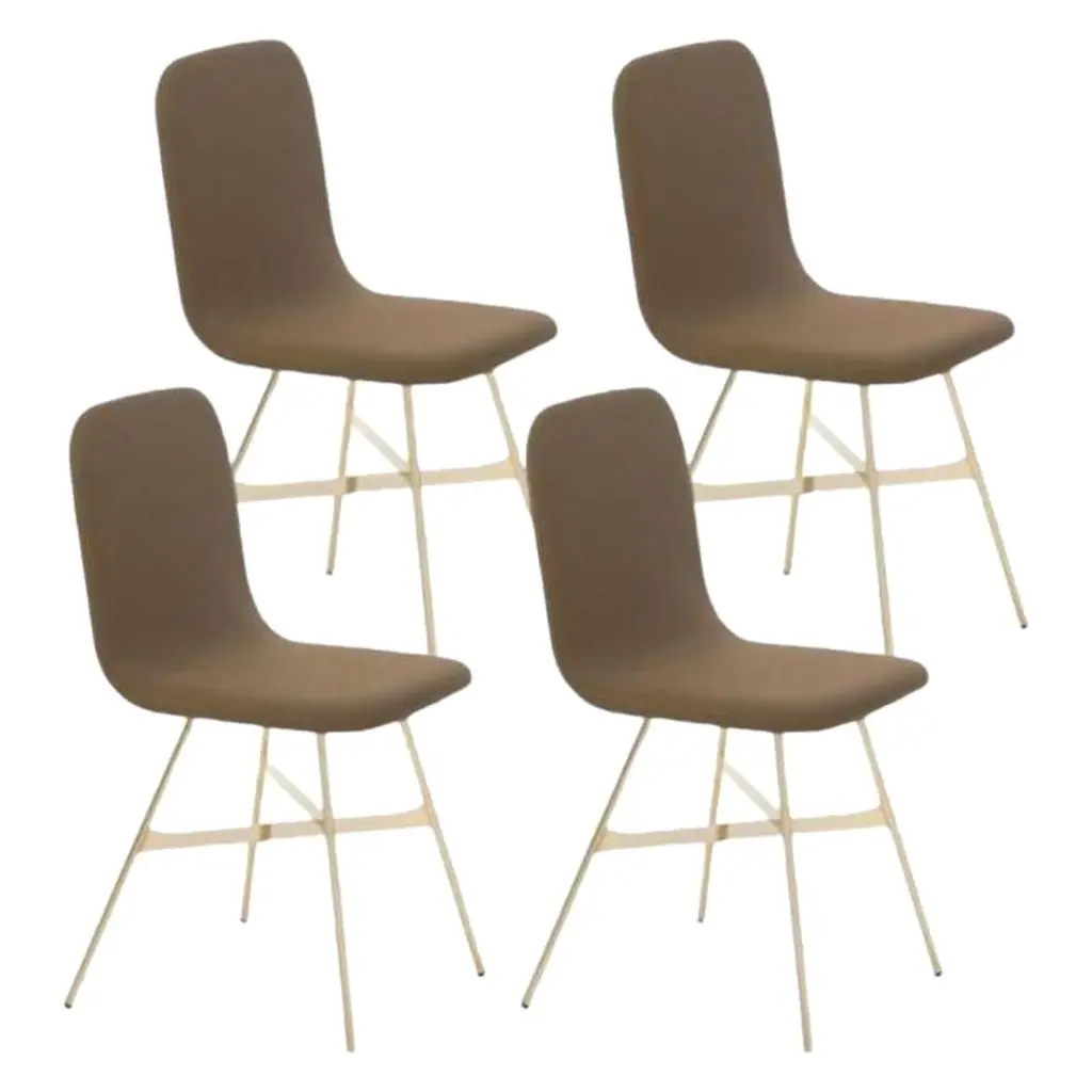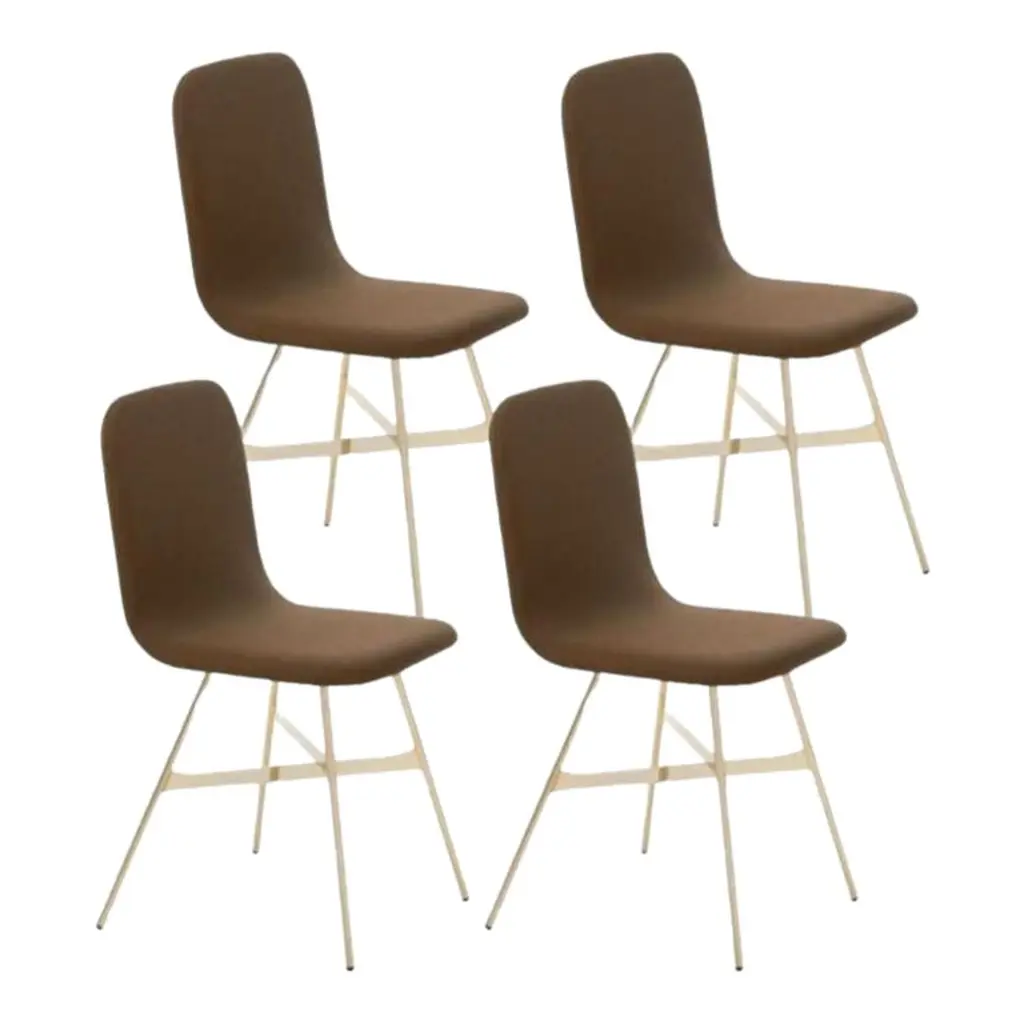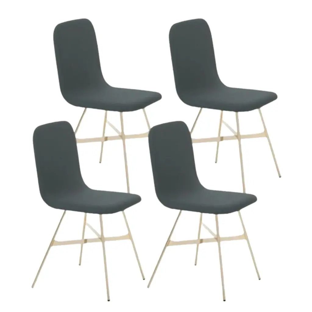 Set of 4, Tria Gold Upholstered, Pine by Colé Italia with Lorenz & KazDimensions: H 82.5, D 52, W 58 cmMaterials: plywood chair; golden metal legs, upholstered fabric CAlso available: tria; 3 legs, with cushion, black, gold, simple, stool, upholsteredTC: C.O.M. fabric - send us your own materialCA: Cat A - Angel (polypropylene), Ganesha (synt. leather), Nord Wool (felt)CB: Cat B - Tiffany (polyestere), Lana (aquaclean)CC: Cat C - Velvetforthy (Velvet), Topia (wool), Novum (Wool), Opera (felt)CP: Cat P - Milano (full grain leather)H.82,5 D.52 W.61 Weight 6 kg Box 2pc: 16 kg Vol 0,36 mcFabrics: see fabric samples catalogueOur iconic chair designed by German duo Lorenz + Kaz. Tria is a table chair, at the same time many people place it asa sculpture, as ornament in an entrance, a bedroom or in a living room. It recalls the impossible forms of Dutch graphicartist and engraver Maurits Escher, defining itself in a game of twists and elusive leak. The corolla-shaped shell can beused in two different seating positions, center or side, in this case with one armrest. The shell is composed of three equal elements in bent plywood assembled together and veneered with a special wood finishing ivory/ black stripes.It is also available in veneered oak, natural or stained open pore in different colors, as well as customized colors (min. 4units). Available with 3 or 4 solid wood legs, or 4 metal legs in different finishings. For a better back comfort if you useTria chair in center position, for dining or studying, you can add a back cushion specially designed for it, upholsteredand coated with a wide range of fabrics.Colé is a young Italian design brand, with a high-end production 100% made in Italy. Born from the experience of Matteo De Ponti, architect, who grew up in one of the most outstanding Milanese design families, and the artistic sensibility of Laura Macagno, degree in Economics and passionate of art and design. Our mission is to create design icons, beautiful and comfortable pieces that can stand the test of time, furnishing houses of international and sophisticated clients, and realized with craftsmanship, thus unique. “We love objects which own deep roots, excellent quality, and a strong evocative power. Archetypal forms dressed with new beauty without losing their classical composure”.Our expressive research is inspired by the utopian force of Italian eminences grises architects and designers of the ’50s, the Scandinavian design, the Bauhaus, ethnic handcraft and houses of famous writers of the XX century, all different as a style but united by the intense soul of those who worked and lived there.