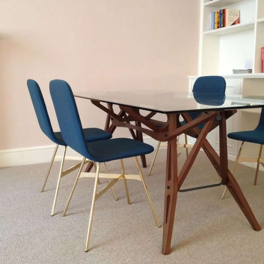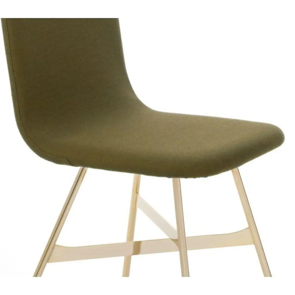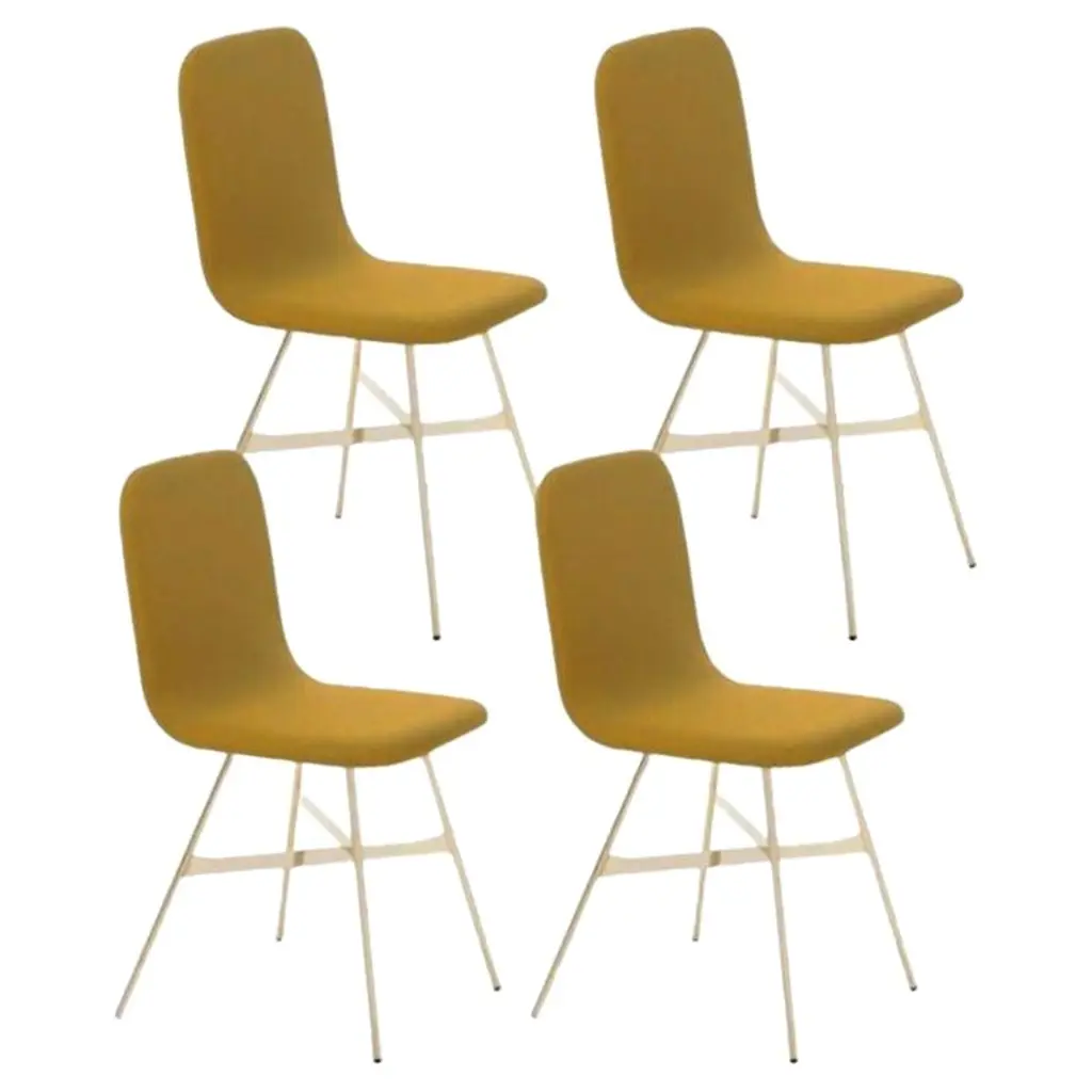 Set of 4, Tria Gold Upholstered, Pine by Colé Italia with Lorenz & KazDimensions: H 82.5, D 52, W 58 cmMaterials: plywood chair; golden metal legs, upholstered fabric CAlso available: tria; 3 legs, with cushion, black, gold, simple, stool, upholsteredTC: C.O.M. fabric - send us your own materialCA: Cat A - Angel (polypropylene), Ganesha (synt. leather), Nord Wool (felt)CB: Cat B - Tiffany (polyestere), Lana (aquaclean)CC: Cat C - Velvetforthy (Velvet), Topia (wool), Novum (Wool), Opera (felt)CP: Cat P - Milano (full grain leather)H.82,5 D.52 W.61 Weight 6 kg Box 2pc: 16 kg Vol 0,36 mcFabrics: see fabric samples catalogueOur iconic chair designed by German duo Lorenz + Kaz. Tria is a table chair, at the same time many people place it asa sculpture, as ornament in an entrance, a bedroom or in a living room. It recalls the impossible forms of Dutch graphicartist and engraver Maurits Escher, defining itself in a game of twists and elusive leak. The corolla-shaped shell can beused in two different seating positions, center or side, in this case with one armrest. The shell is composed of three equal elements in bent plywood assembled together and veneered with a special wood finishing ivory/ black stripes.It is also available in veneered oak, natural or stained open pore in different colors, as well as customized colors (min. 4units). Available with 3 or 4 solid wood legs, or 4 metal legs in different finishings. For a better back comfort if you useTria chair in center position, for dining or studying, you can add a back cushion specially designed for it, upholsteredand coated with a wide range of fabrics.Colé is a young Italian design brand, with a high-end production 100% made in Italy. Born from the experience of Matteo De Ponti, architect, who grew up in one of the most outstanding Milanese design families, and the artistic sensibility of Laura Macagno, degree in Economics and passionate of art and design. Our mission is to create design icons, beautiful and comfortable pieces that can stand the test of time, furnishing houses of international and sophisticated clients, and realized with craftsmanship, thus unique. “We love objects which own deep roots, excellent quality, and a strong evocative power. Archetypal forms dressed with new beauty without losing their classical composure”.Our expressive research is inspired by the utopian force of Italian eminences grises architects and designers of the ’50s, the Scandinavian design, the Bauhaus, ethnic handcraft and houses of famous writers of the XX century, all different as a style but united by the intense soul of those who worked and lived there.