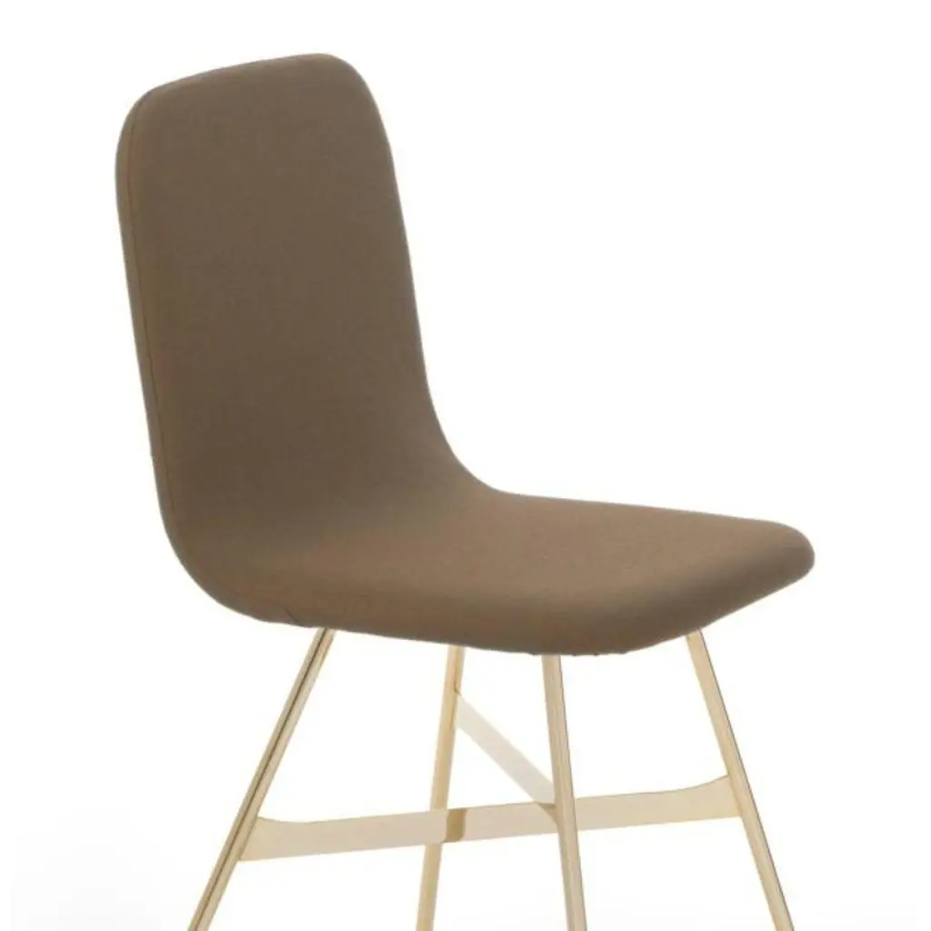 Set of 4, tria gold upholstered, walnut by Colé Italia with Lorenz & KazDimensions: H 82.5, D 52, W 58 cmMaterials: plywood chair; golden metal legs, upholstered fabric CAlso available: tria; 3 legs, with cushion, black, gold, simple, stool, upholstered, please contact usTC: C.O.M. fabric - send us your own materialCA: Cat A - Angel (polypropylene), Ganesha (synt. leather), Nord Wool (felt)CB: Cat B - Tiffany (polyestere), Lana (aquaclean)CC: Cat C - Velvetforthy (Velvet), Topia (wool), Novum (Wool), Opera (felt)CP: Cat P - Milano (full grain leather)H.82,5 D.52 W.61 Weight 6 kg Box 2pc: 16 kg Vol 0,36 mcFabrics: see fabric samples catalogueOur iconic chair designed by German duo Lorenz + Kaz. Tria is a table chair, at the same time many people place it asa sculpture, as ornament in an entrance, a bedroom or in a living room. It recalls the impossible forms of Dutch graphicartist and engraver Maurits Escher, defining itself in a game of twists and elusive leak. The corolla-shaped shell can beused in two different seating positions, center or side, in this case with one armrest. The shell is composed of three equal elements in bent plywood assembled together and veneered with a special wood finishing ivory/ black stripes.It is also available in veneered oak, natural or stained open pore in different colors, as well as customized colors (min. 4units). Available with 3 or 4 solid wood legs, or 4 metal legs in different finishings. For a better back comfort if you useTria chair in center position, for dining or studying, you can add a back cushion specially designed for it, upholsteredand coated with a wide range of fabrics.Colé is a young Italian design brand, with a high-end production 100% made in Italy. Born from the experience of Matteo De Ponti, architect, who grew up in one of the most outstanding Milanese design families, and the artistic sensibility of Laura Macagno, degree in Economics and passionate of art and design. Our mission is to create design icons, beautiful and comfortable pieces that can stand the test of time, furnishing houses of international and sophisticated clients, and realized with craftsmanship, thus unique. “We love objects which own deep roots, excellent quality, and a strong evocative power. Archetypal forms dressed with new beauty without losing their classical composure”.Our expressive research is inspired by the utopian force of Italian eminences grises architects and designers of the ’50s, the Scandinavian design, the Bauhaus, ethnic handcraft and houses of famous writers of the XX century, all different as a style but united by the intense soul of those who worked and lived there.