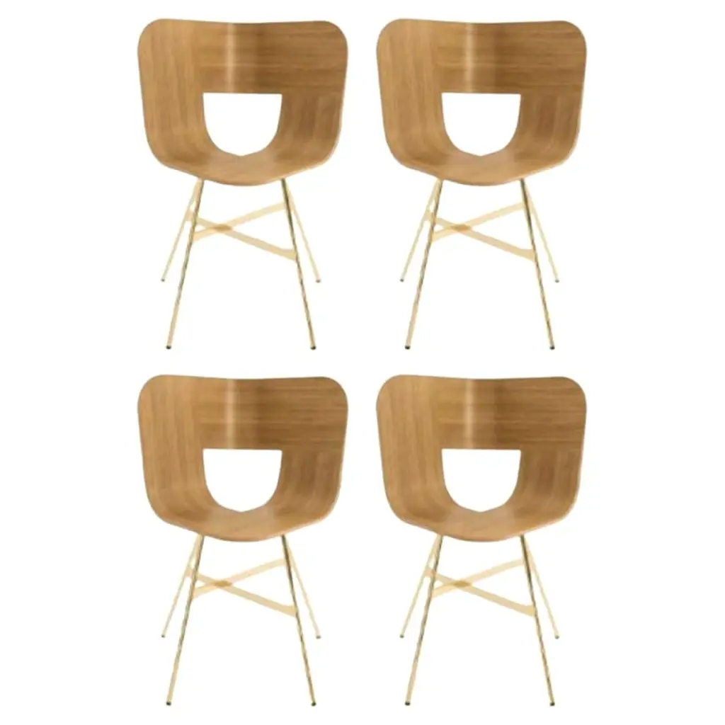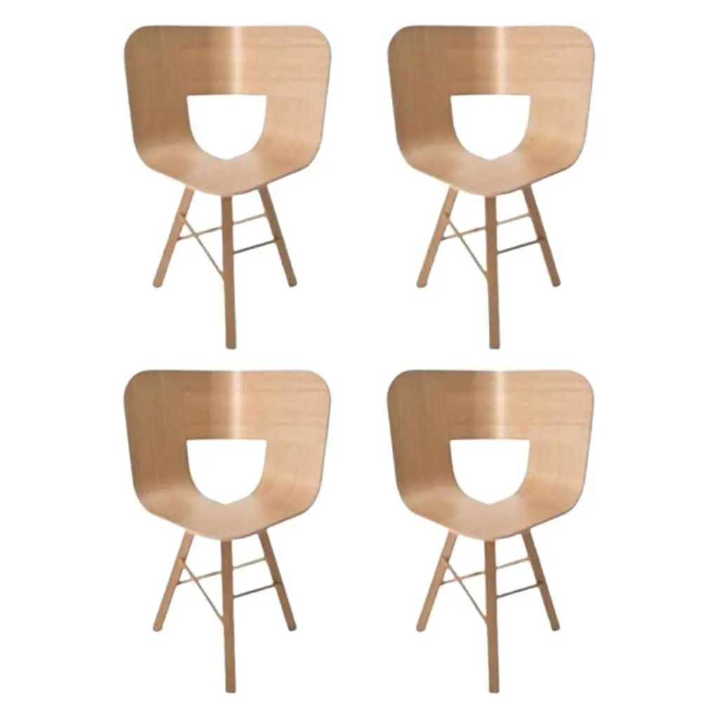 Set of 4, Tria Simple Oak by Colé Italia by Colé Italia with Lorenz & KazDimensions: H 82.5, D 52, W 58 cmMaterials: Plywood Chair; 4 Legs Solid Oak BaseAlso Available: Tria; 3 Legs, with Cushion, Black, Gold, Simple, Stool, UpholsteredOur iconic chair designed by German duo Lorenz + Kaz. Tria is a table chair, at the same time many people place it asa sculpture, as ornament in an entrance, a bedroom or in a living room. It recalls the impossible forms of Dutch graphicartist and engraver Maurits Escher, defining itself in a game of twists and elusive leak. The corolla-shaped shell can beused in two different seating positions, center or side, in this case with one armrest. The shell is composed of three equal elements in bent plywood assembled together and veneered with a special wood finishing ivory/ black stripes.It is also available in veneered oak, natural or stained open pore in different colors, as well as customized colors (min. 4units). Available with 3 or 4 solid wood legs, or 4 metal legs in different finishings. For a better back comfort if you useTria chair in center position, for dining or studying, you can add a back cushion specially designed for it, upholsteredand coated with a wide range of fabrics.Colé is a young Italian design brand, with a high-end production 100% made in Italy. Born from the experience of Matteo De Ponti, architect, who grew up in one of the most outstanding Milanese design families, and the artistic sensibility of Laura Macagno, degree in Economics and passionate of art and design. Our mission is to create design icons, beautiful and comfortable pieces that can stand the test of time, furnishing houses of international and sophisticated clients, and realized with craftsmanship, thus unique. “We love objects which own deep roots, excellent quality, and a strong evocative power. Archetypal forms dressed with new beauty without losing their classical composure”.Our expressive research is inspired by the utopian force of Italian eminences grises architects and designers of the ’50s, the Scandinavian design, the Bauhaus, ethnic handcraft and houses of famous writers of the XX century, all different as a style but united by the intense soul of those who worked and lived there.