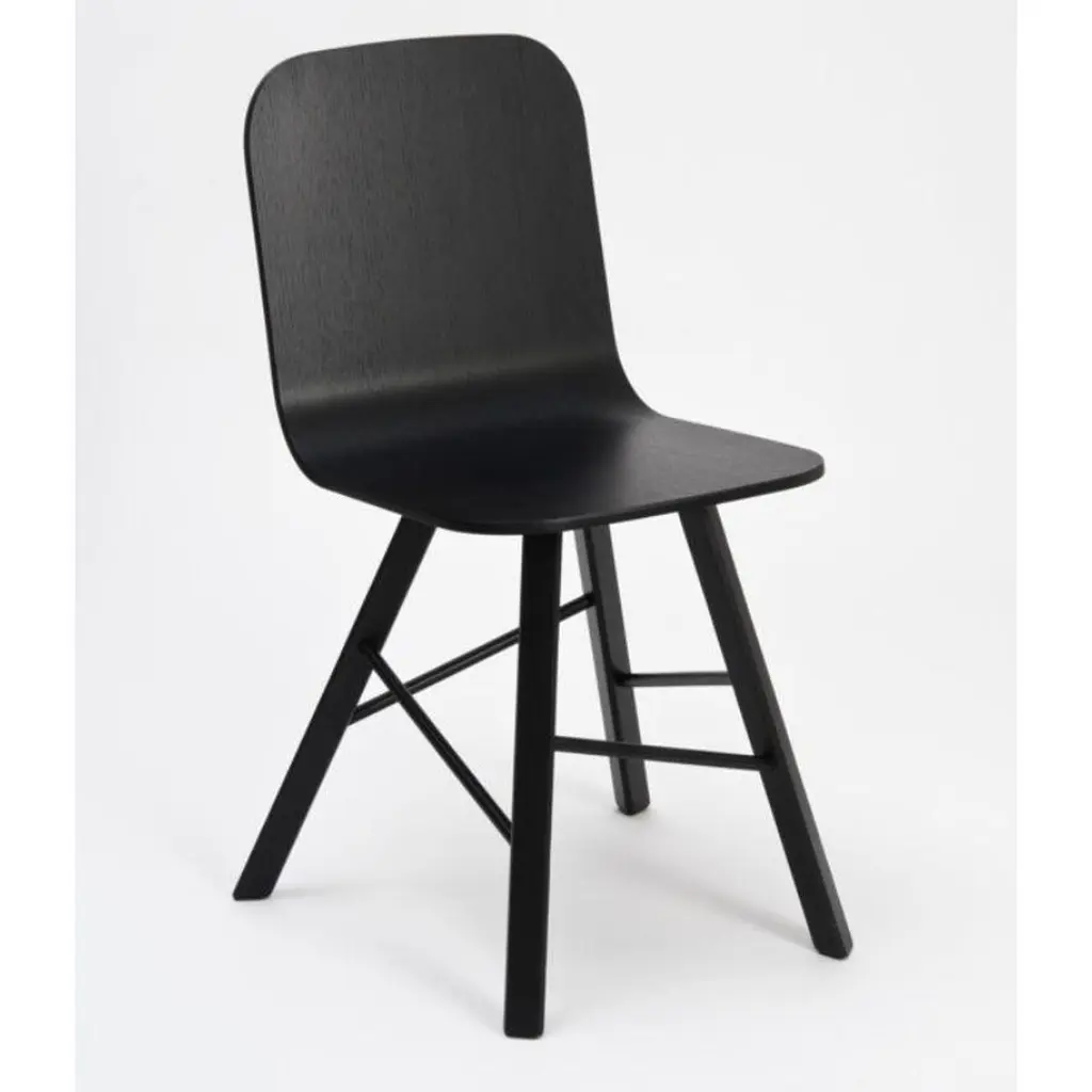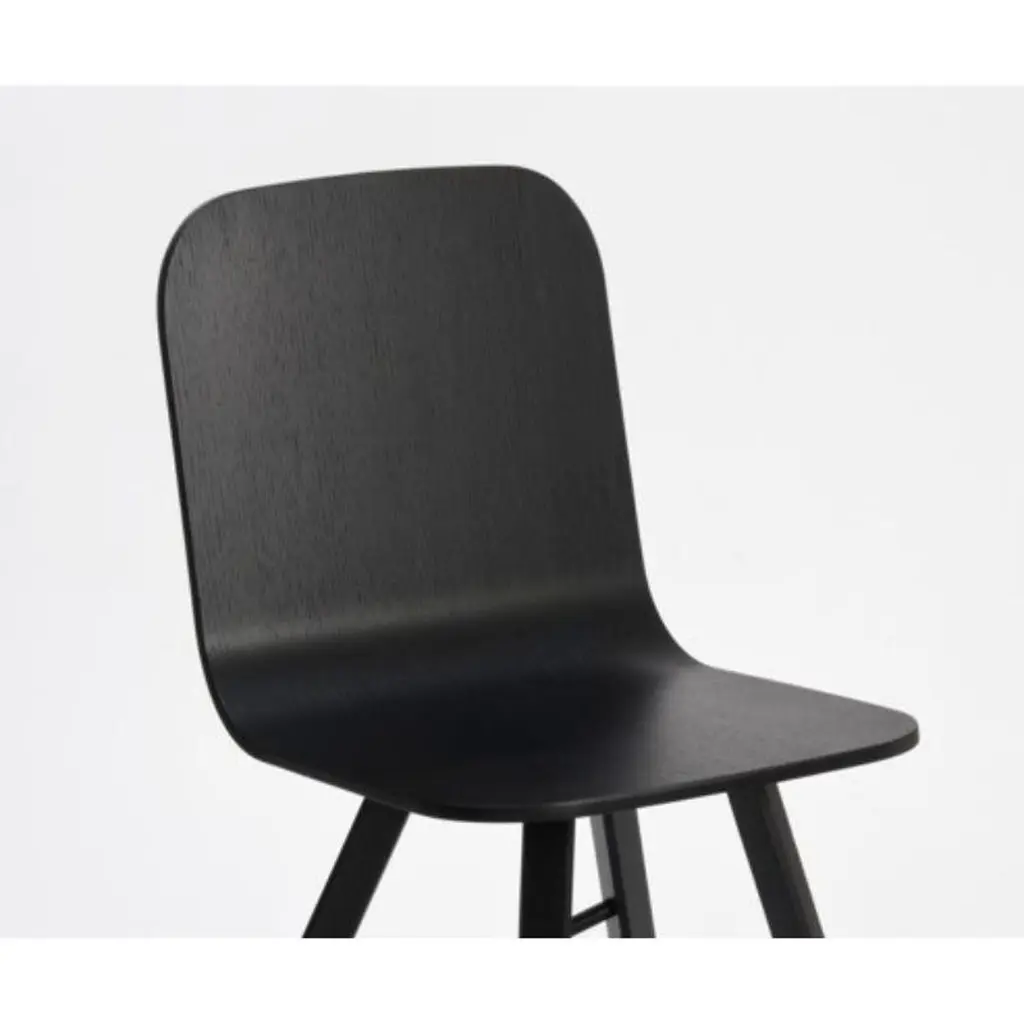 Set of 4, Tria simple oak, seat painted black open pore by Colé Italia with Lorenz & KazDimensions: H 82.5, D 52, W 58 cmMaterials:plywood chair; 4 legs solid oak base, painted blackAlso available: tria; 3 legs, with cussion, black, gold, simple, stool, upholsteredOur iconic chair designed by German duo Lorenz + Kaz. Tria is a table chair, at the same time many people place it asa sculpture, as ornament in an entrance, a bedroom or in a living room. It recalls the impossible forms of Dutch graphicartist and engraver Maurits Escher, defining itself in a game of twists and elusive leak. The corolla-shaped shell can beused in two different seating positions, center or side, in this case with one armrest. The shell is composed of three equal elements in bent plywood assembled together and veneered with a special wood finishing ivory/ black stripes.It is also available in veneered oak, natural or stained open pore in different colors, as well as customized colors (min. 4units). Available with 3 or 4 solid wood legs, or 4 metal legs in different finishings. For a better back comfort if you useTria chair in center position, for dining or studying, you can add a back cushion specially designed for it, upholsteredand coated with a wide range of fabrics.Colé is a young Italian design brand, with a high-end production 100% made in Italy. Born from the experience of Matteo De Ponti, architect, who grew up in one of the most outstanding Milanese design families, and the artistic sensibility of Laura Macagno, degree in Economics and passionate of art and design. Our mission is to create design icons, beautiful and comfortable pieces that can stand the test of time, furnishing houses of international and sophisticated clients, and realized with craftsmanship, thus unique. “We love objects which own deep roots, excellent quality, and a strong evocative power. Archetypal forms dressed with new beauty without losing their classical composure”.Our expressive research is inspired by the utopian force of Italian eminences grises architects and designers of the ’50s, the Scandinavian design, the Bauhaus, ethnic handcraft and houses of famous writers of the XX century, all different as a style but united by the intense soul of those who worked and lived there.