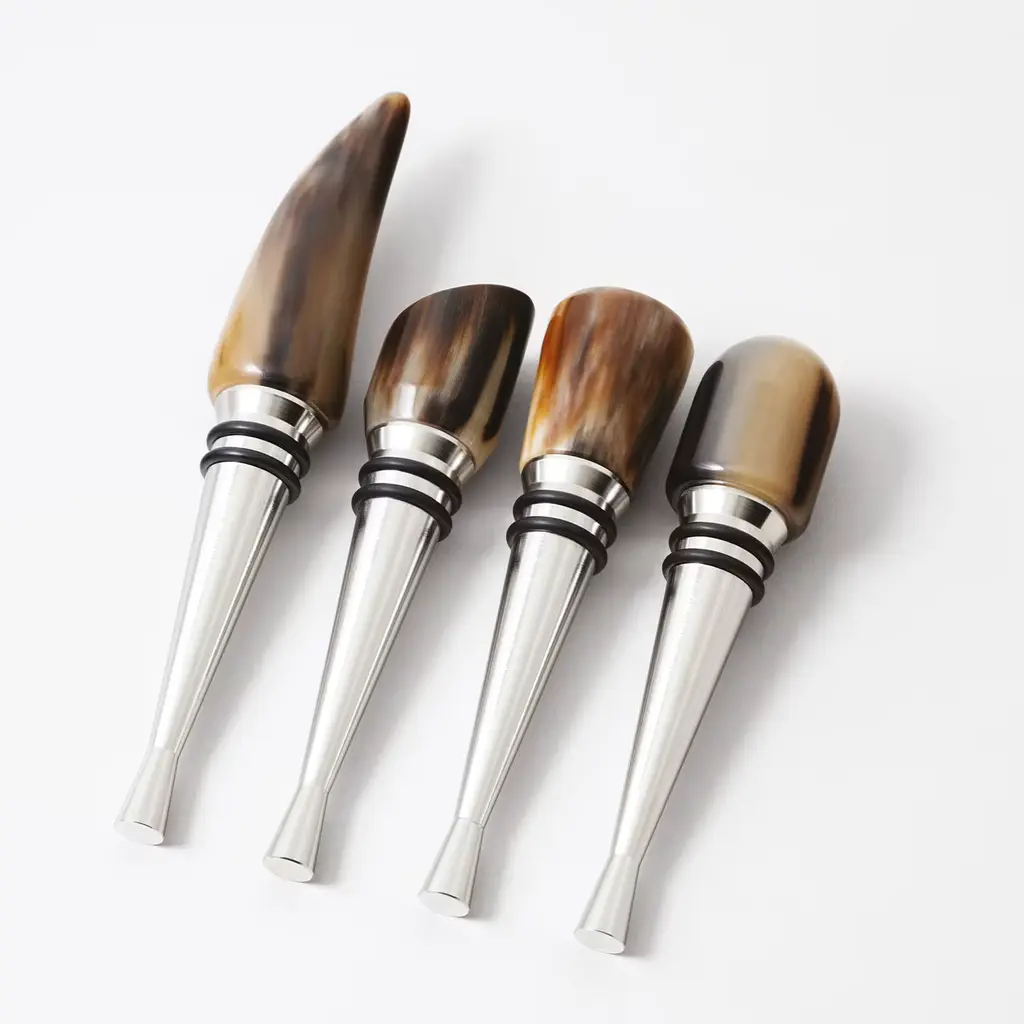 Elevate the art of wine enjoyment with the Set of 4 Wine Stoppers, each meticulously crafted with natural horn applications integrated into a robust stainless steel base. Ranging from 120 mm to 150 mm in size, these stoppers provide a secure seal for any bottle, ensuring the preservation of flavor and aroma. The unique beauty of the horn adds a touch of sophistication to any tabletop setting, making this set an ideal addition to home bar collections or as a thoughtful gift for wine enthusiasts. Part of the Apollo Collction.