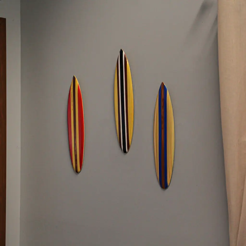Perfect Dimensions - Each surfboard measures 3.75 inches wide, 0.25 inches deep, and 15.5 inches high, offering an ideal size for versatile display in your space.Sturdy Craftsmanship - Crafted from durable wood, these surfboards guarantee years of maintenance-free display, ensuring lasting coastal charm in your home.Artisanal Touch - Hand-painted by skilled Village Artisans in Indonesia, these surfboards boast a unique finish, adding an authentic and artistic touch to your decor.Seaside Elegance - These surfboards serve as great beach accents, perfect for bedrooms, bathrooms, and dorms, infusing your space with the serene ambiance of the shore.Hassle-Free Display - Equipped with built-in hangers, these surfboards offer easy installation, enabling quick and simple display on your walls, instantly transforming your space with beach-inspired allure.Cool and totally casual, this set of 6 mini surfboard wall hangings is the perfect decoration for surf and sand lovers. Made of wood, they feature a classic striped pattern and are given a clear protective coating that really makes them shine. This group of 3.75 inch wide, 0.25 inch thick, 15.5 inch high decorative surfboards have pre-installed hangers on the back for vertical mounting to instantly transform your wall into a beach paradise. A great addition to your living room, kitchen, bedroom, bathroom, or outdoor living space.